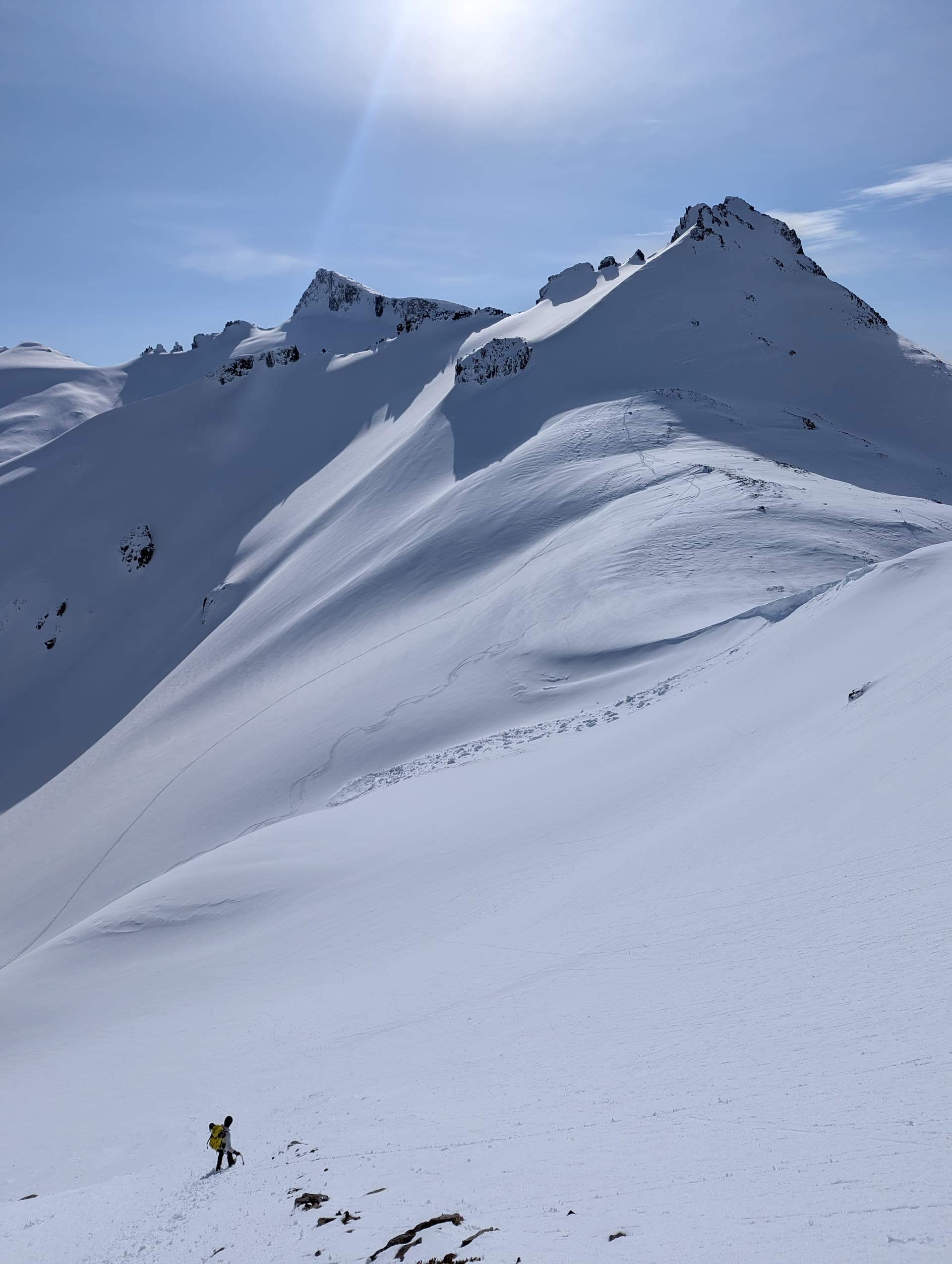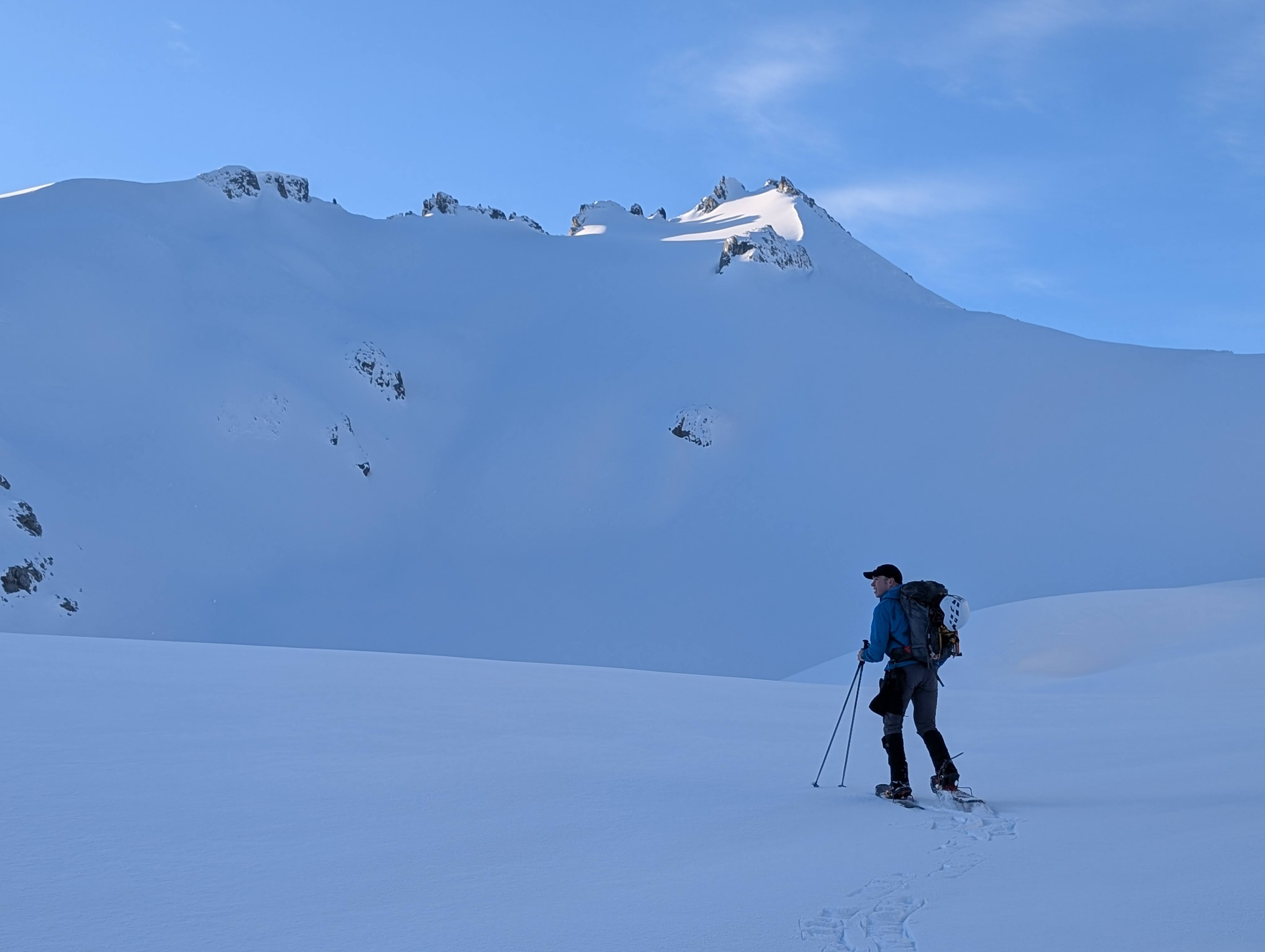 It was past dawn by the time we reached the far side, where we passed the Burton Hut and picked our way through few-day-old avy debris and started the march towards the bowl between Guard and Deception. We generally had good melt freeze conferring fast travel, but did wallow slightly in the rising sidehill on the east flanks of Guard. As we neared the SE ridge’s terminus, we spotted a group of hikers headed down from Deception! This was a pleasant surprise, as we figured it would mean we would get some tracks for Deception, assuming all went well on Guard.
