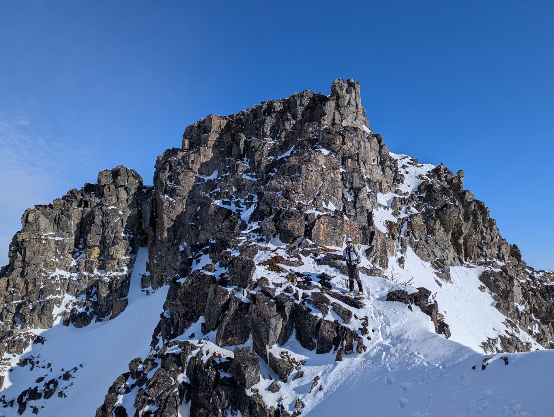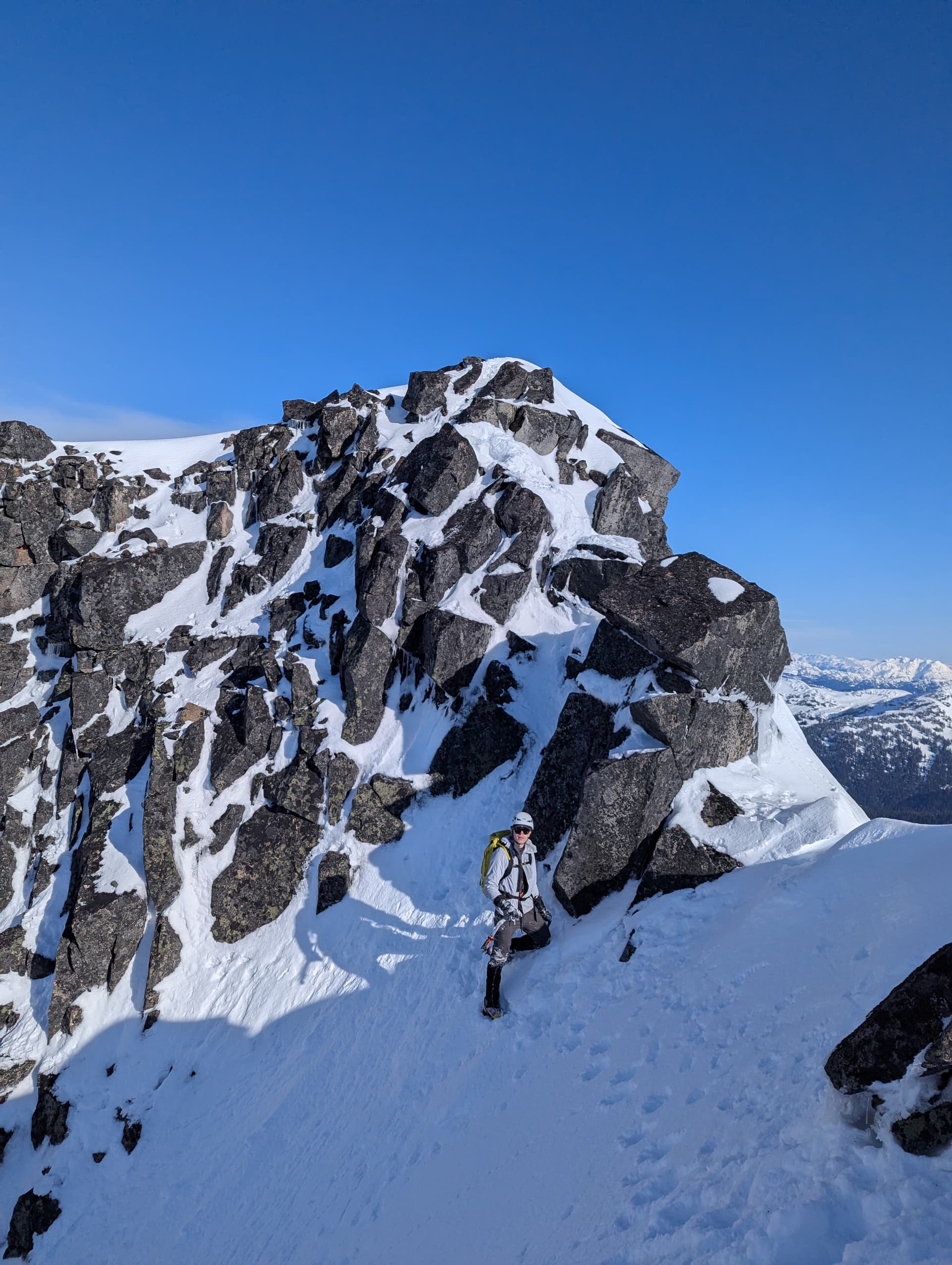 Wanting to be safe that we tagged the true summit, we downclimbed some steep exposed snow and gained a cool snow arete that we traversed on the West side until we were under the actual final summit block. The views peering over the snow arete of Sphinx, Deception, et al were phenomenal. The final block went easily by attacking the arete directly and doing a mantle over a block on the knife edge.