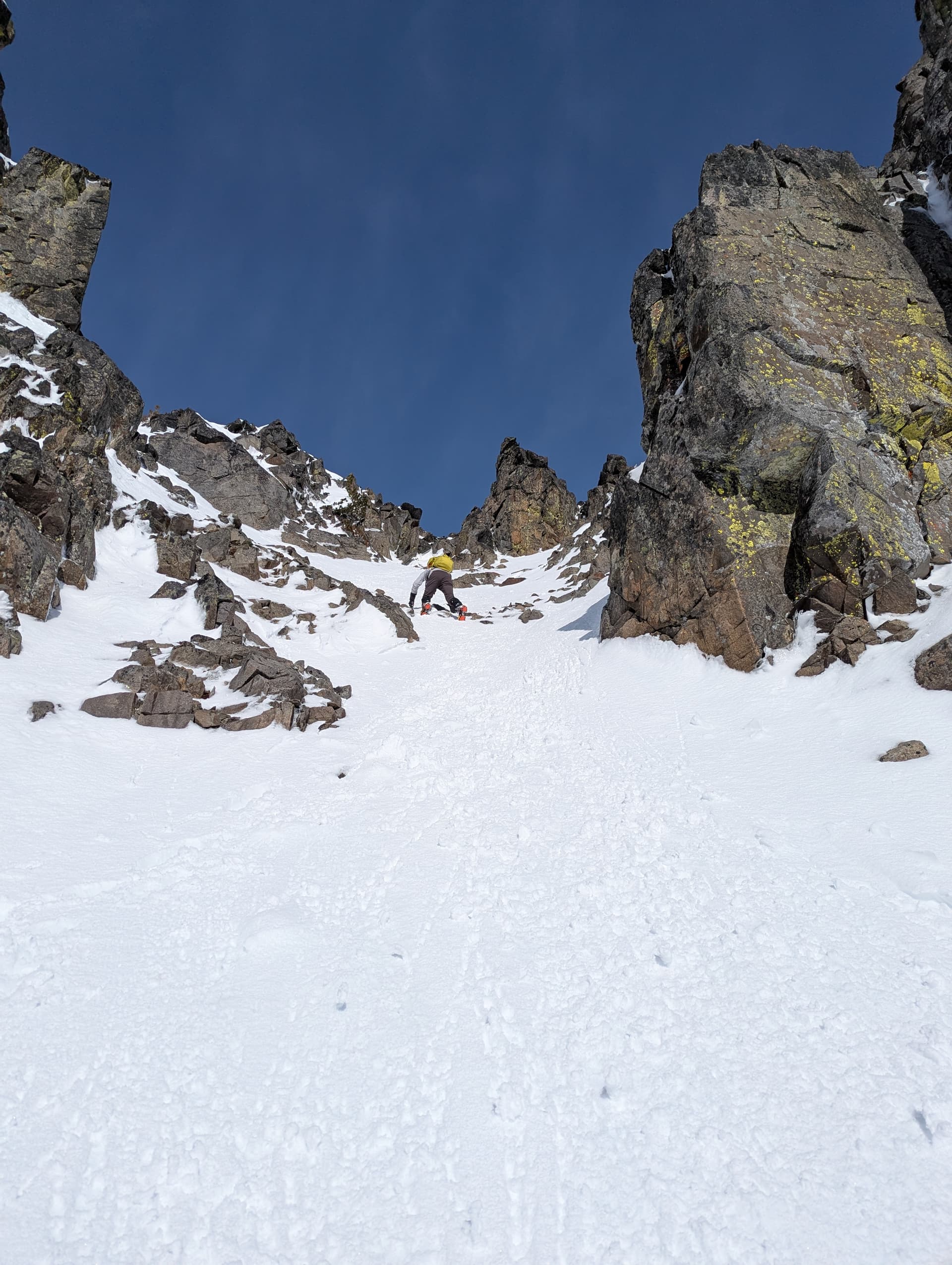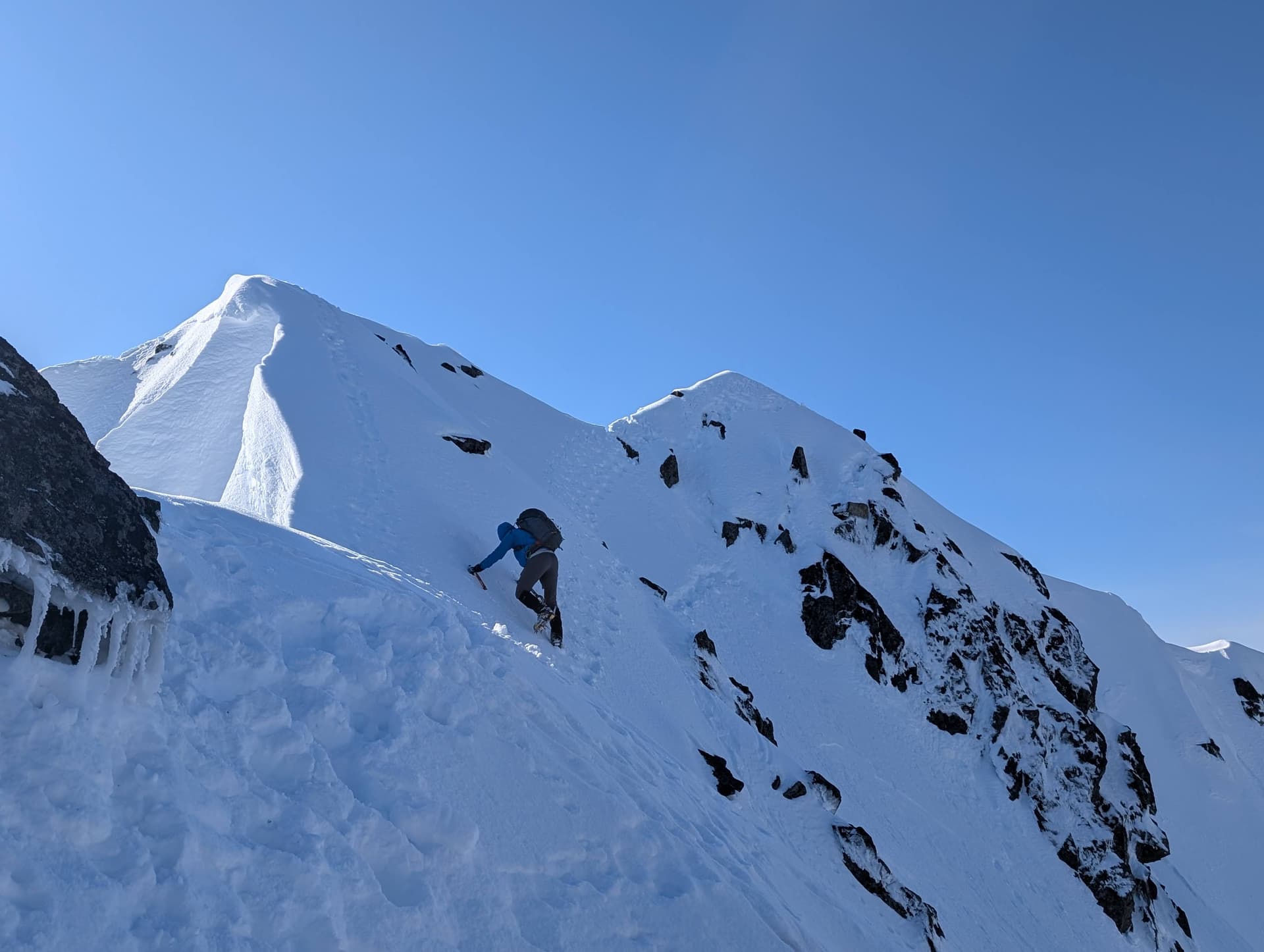We plodded up the reasonably steep SE slope of Guard until I found a small bench where we could transition to crampons and get at least one axe out each to start. From here, there were a few options to gain the ridge, but we opted to take a broad gully on climbers right, eventually funneling us through a short scramble and onto the ridge.