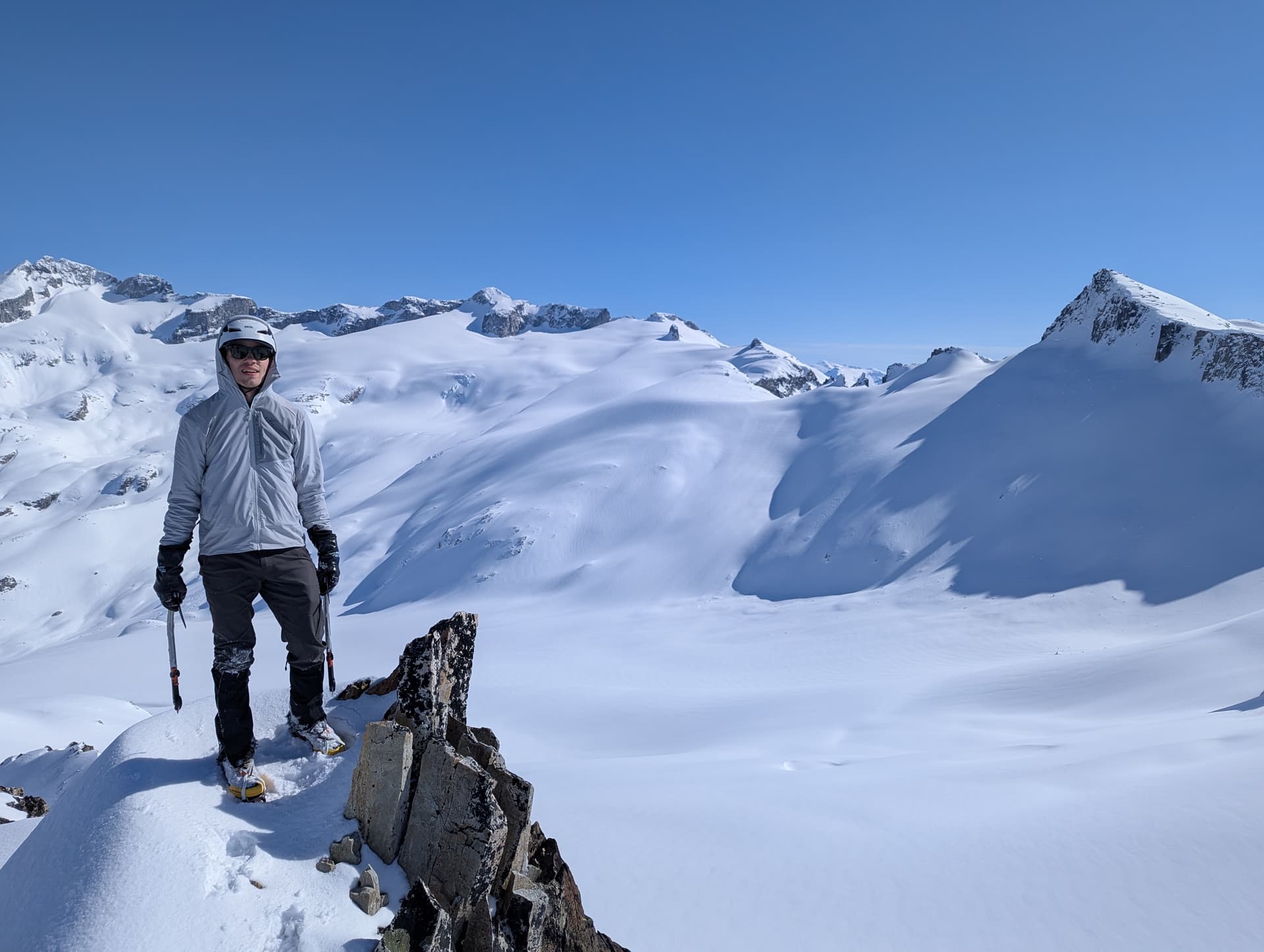 Again we were greeted by two very similar in height pinnacles, and although the bootpack only went up the right spire, we also went up the left one just to be sure. Views from Deception were even better than Guard, and although we wanted to linger, we opted not to; partly due to the long deproach ahead of us, and partly because the hot sun was starting to cook the steep slopes we had ascended.