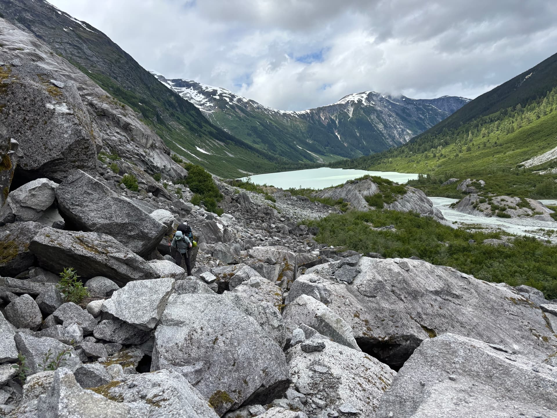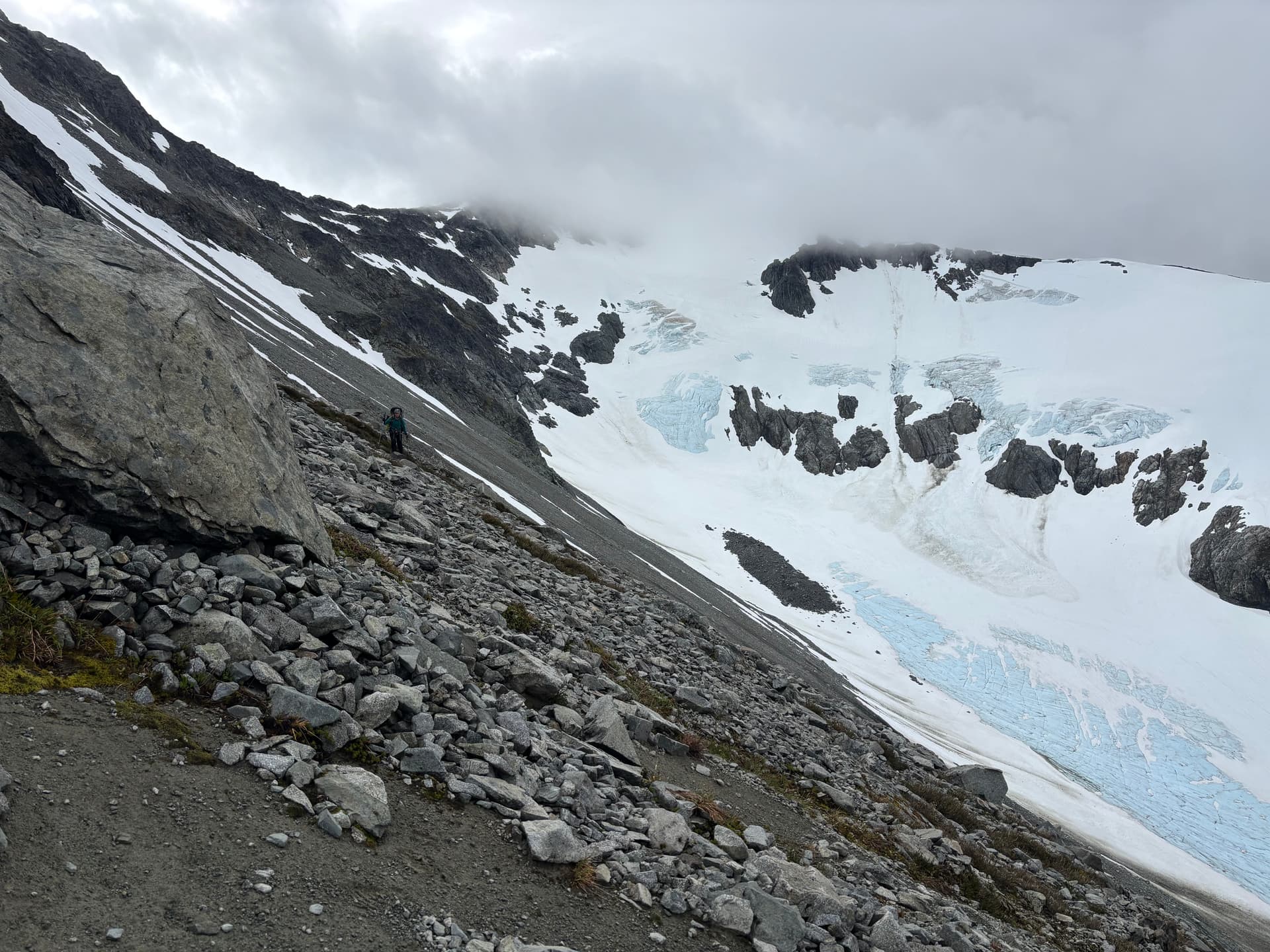 Day 12 marked the final day of our trip. We had arranged with Tweedsmuir Air to pick us up at noon and we were only 6km from Kimsquit Lake. All that stood between us and the lake was “Peak 7400”. When we awoke we discovered the rain had briefly let off and wind swept ridges were occasionally revealed by breaks in the cloud. The air was cold and the idea of donning our completely soaked clothing had no appeal. I decided to sacrifice my dry sleeping layers and Andrea did the same. We gathered the rest of our cold damp gear and set off up the ridge. Perhaps 120m below the summit we hit an interesting crux of steep 3rd/maybe 4th class climbing covered in more of our favourite wet lichen. At this precise moment the clouds cleared on the glacier below and we could see a scree ramp that would work to bypass this summit altogether. We didn’t hesitate for a moment to skip the summit as we couldn’t see what was further beyond and the zeal was gone for hours of potential slick rock scrambling.