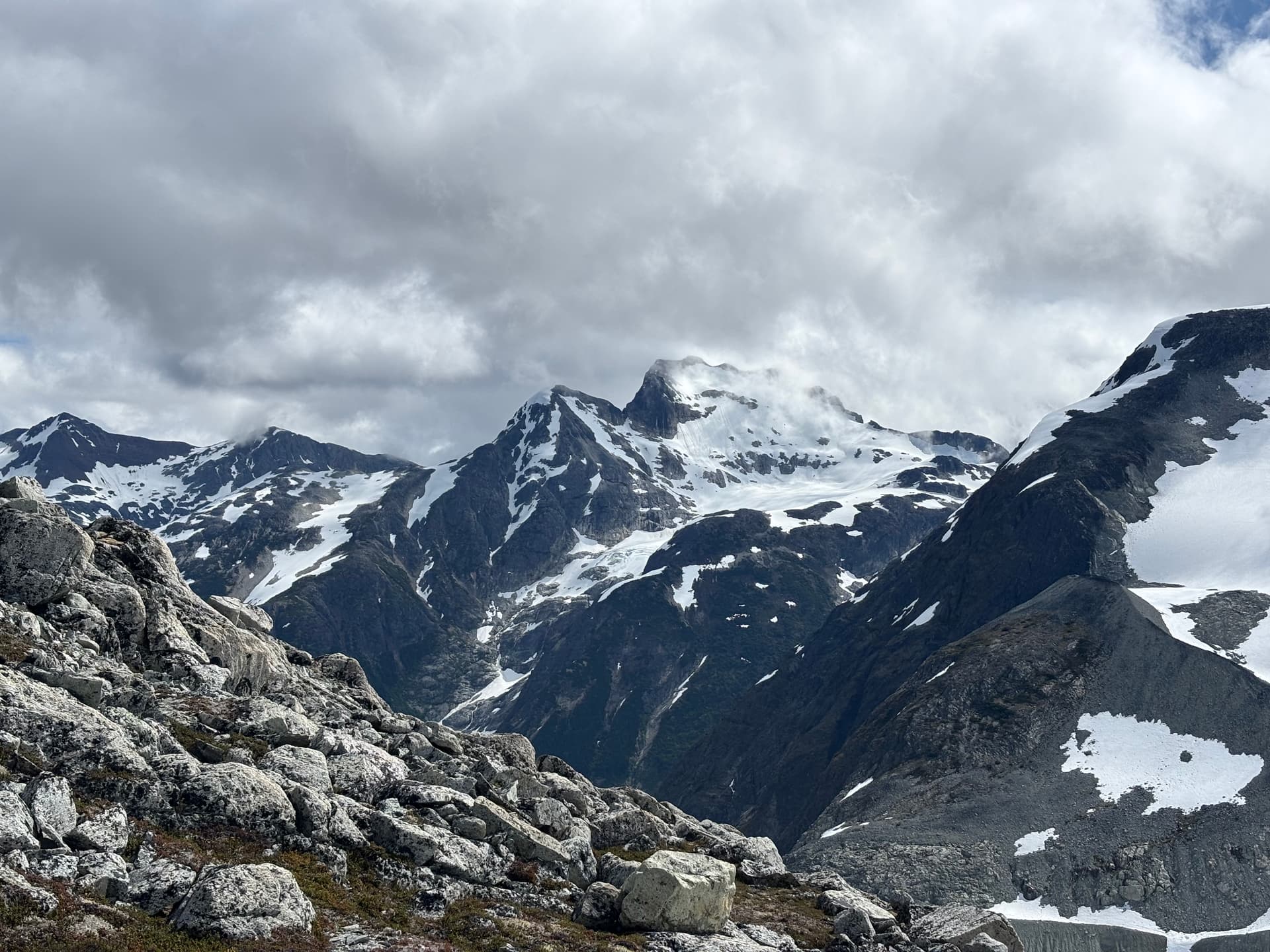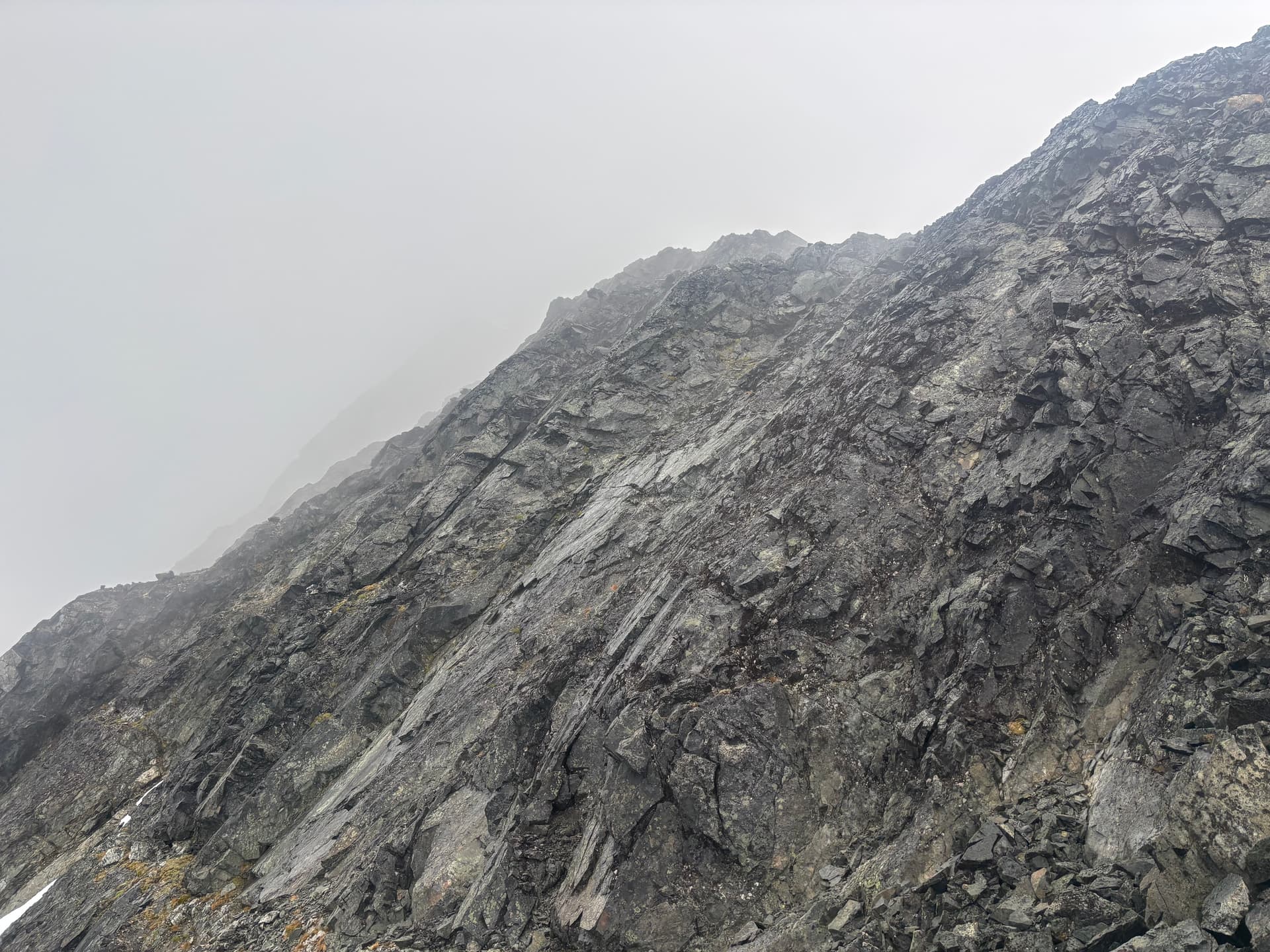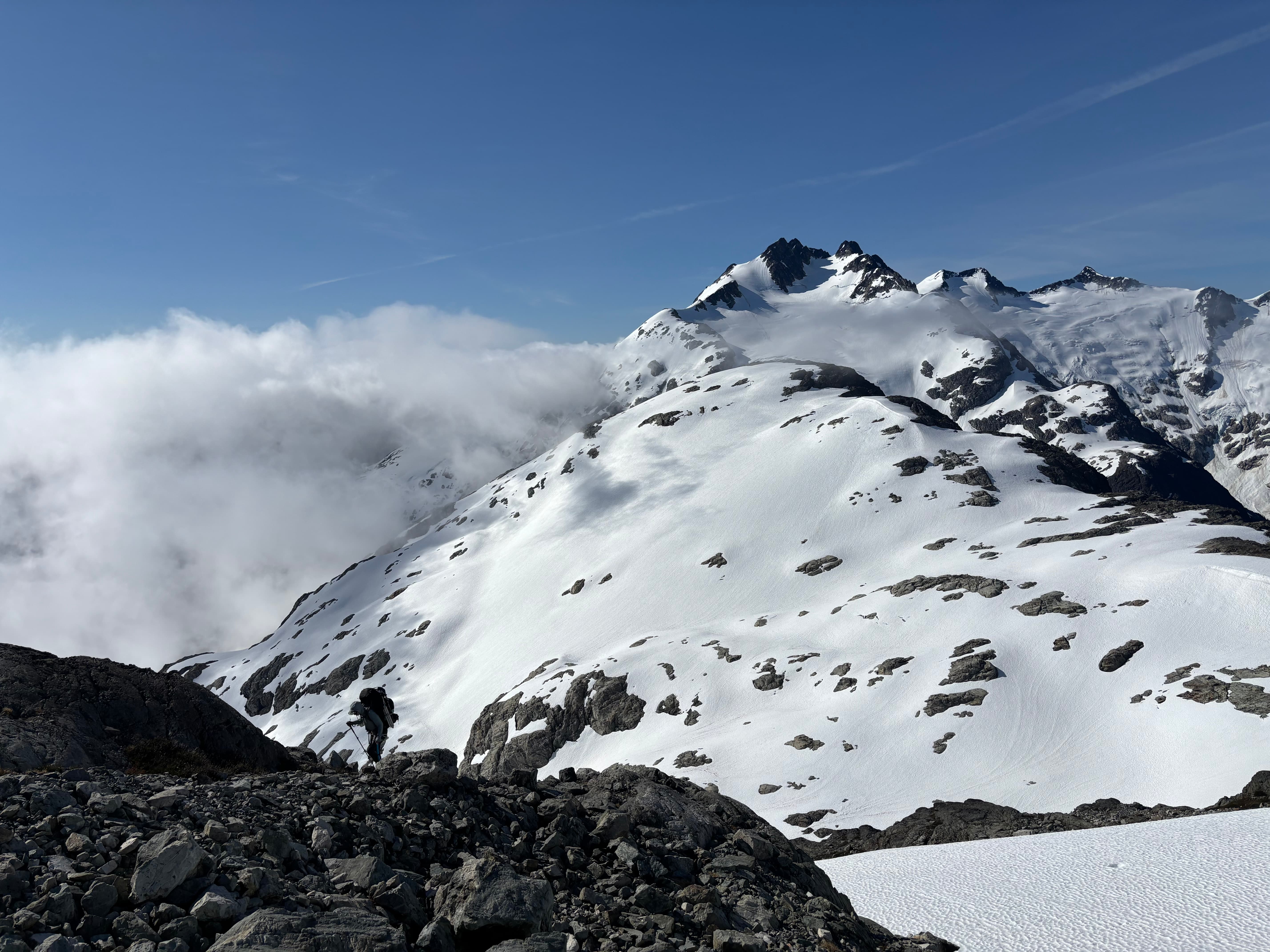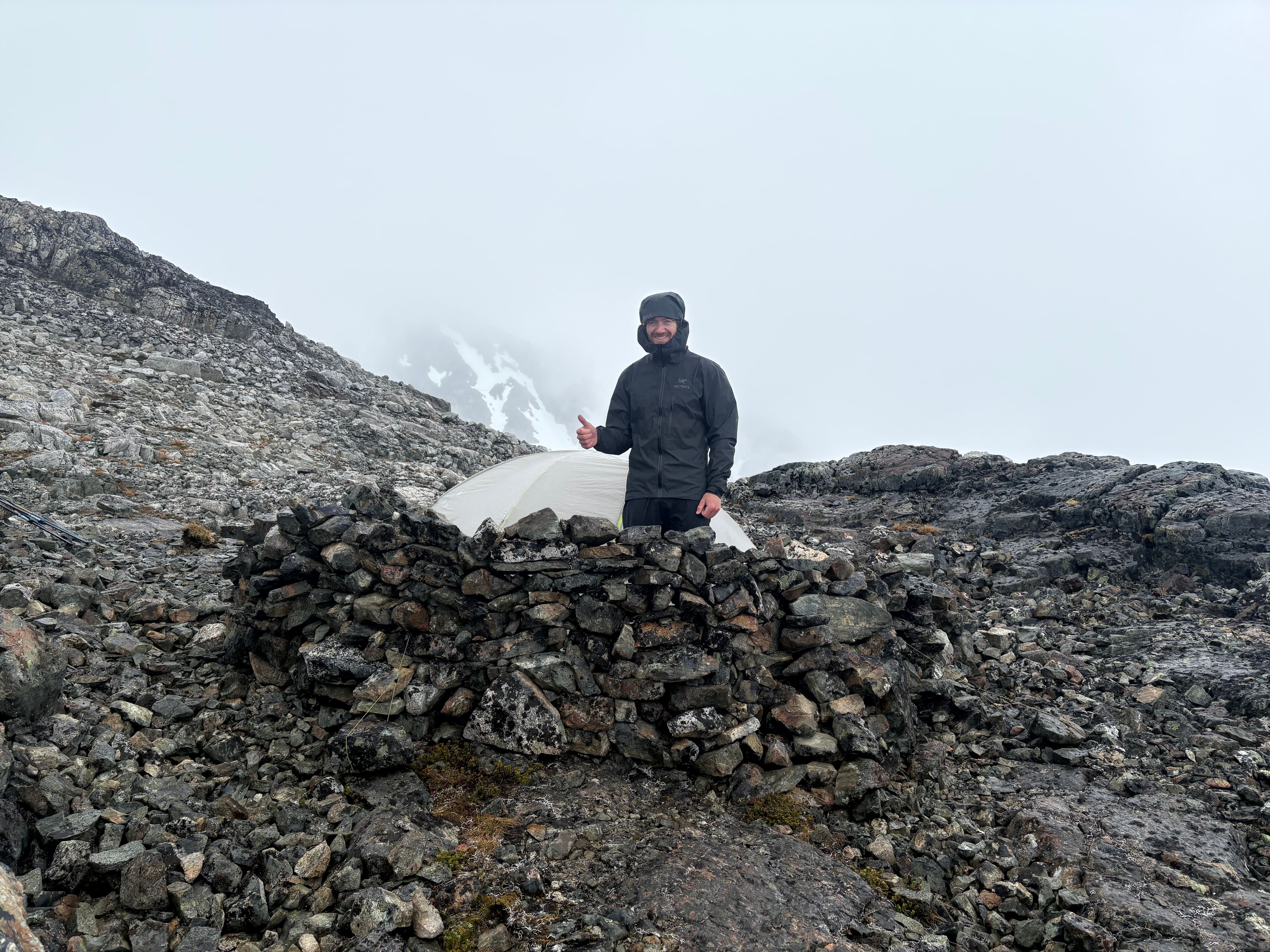 On day 5 we had beautiful sunny skies and made our way up and over the 2,251m peak losing some 600m of elevation before regaining most of it up to the ridge of Cornice Peak. As we made the long slog up our 1.5 day period of good weather would close shut. Once on the ridge we discovered a complete lack of tenable camping spots. The ridge was comprised almost entirely of bed rock with loose talus on top and after an hour of searching we found a measly patch of muddy dirt with a large rock sticking out to sleep on. Our tent was erected just as the last light faded and the rain bore down.