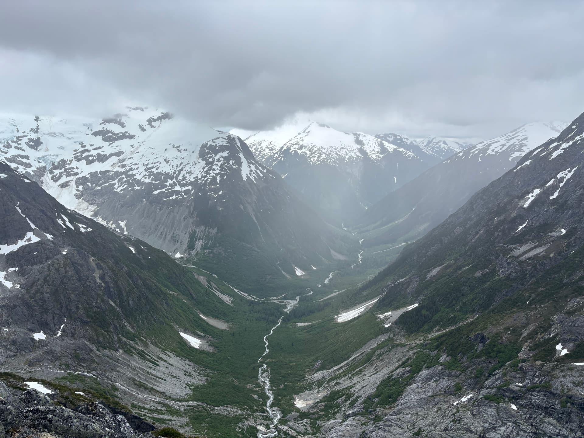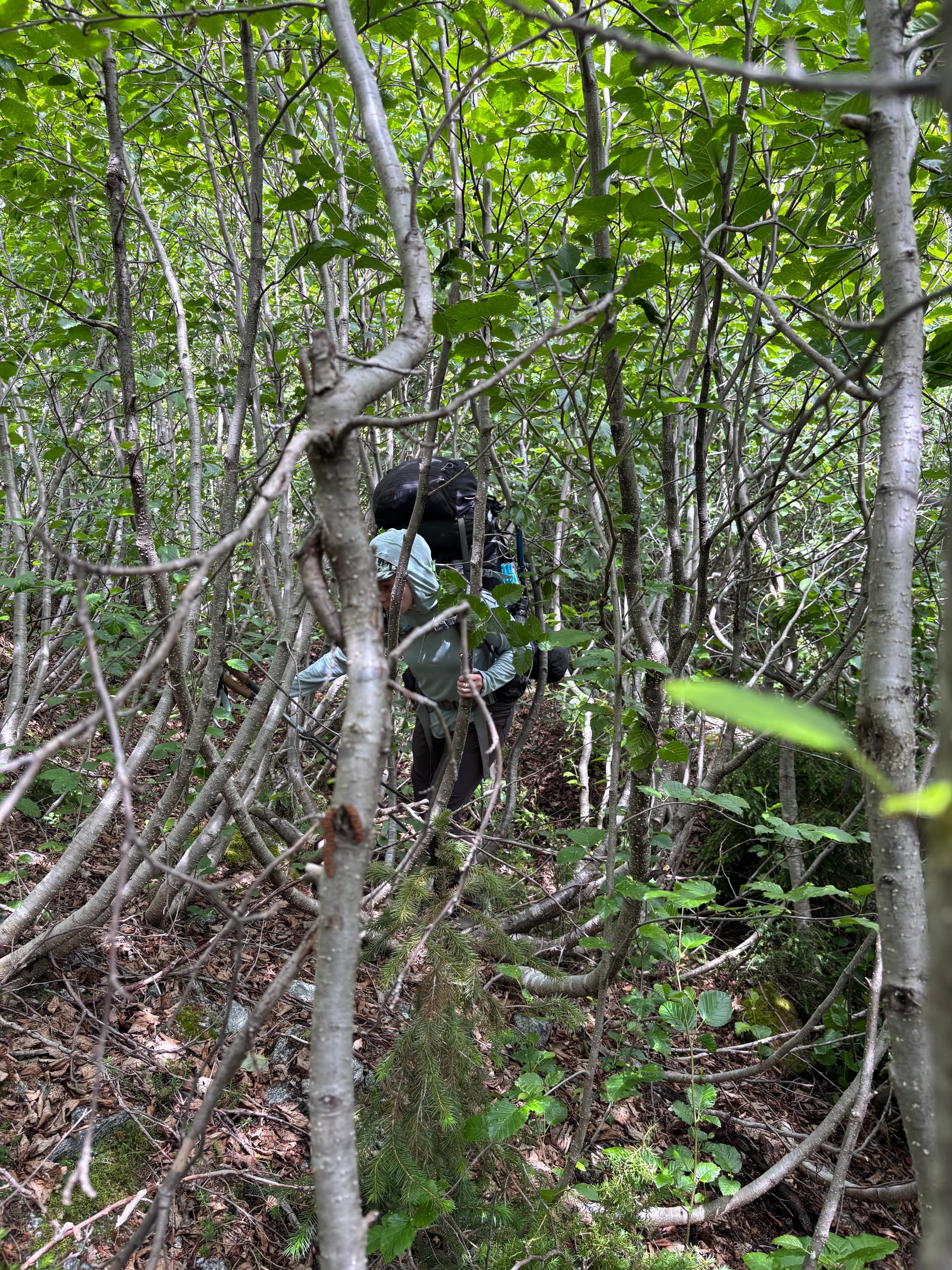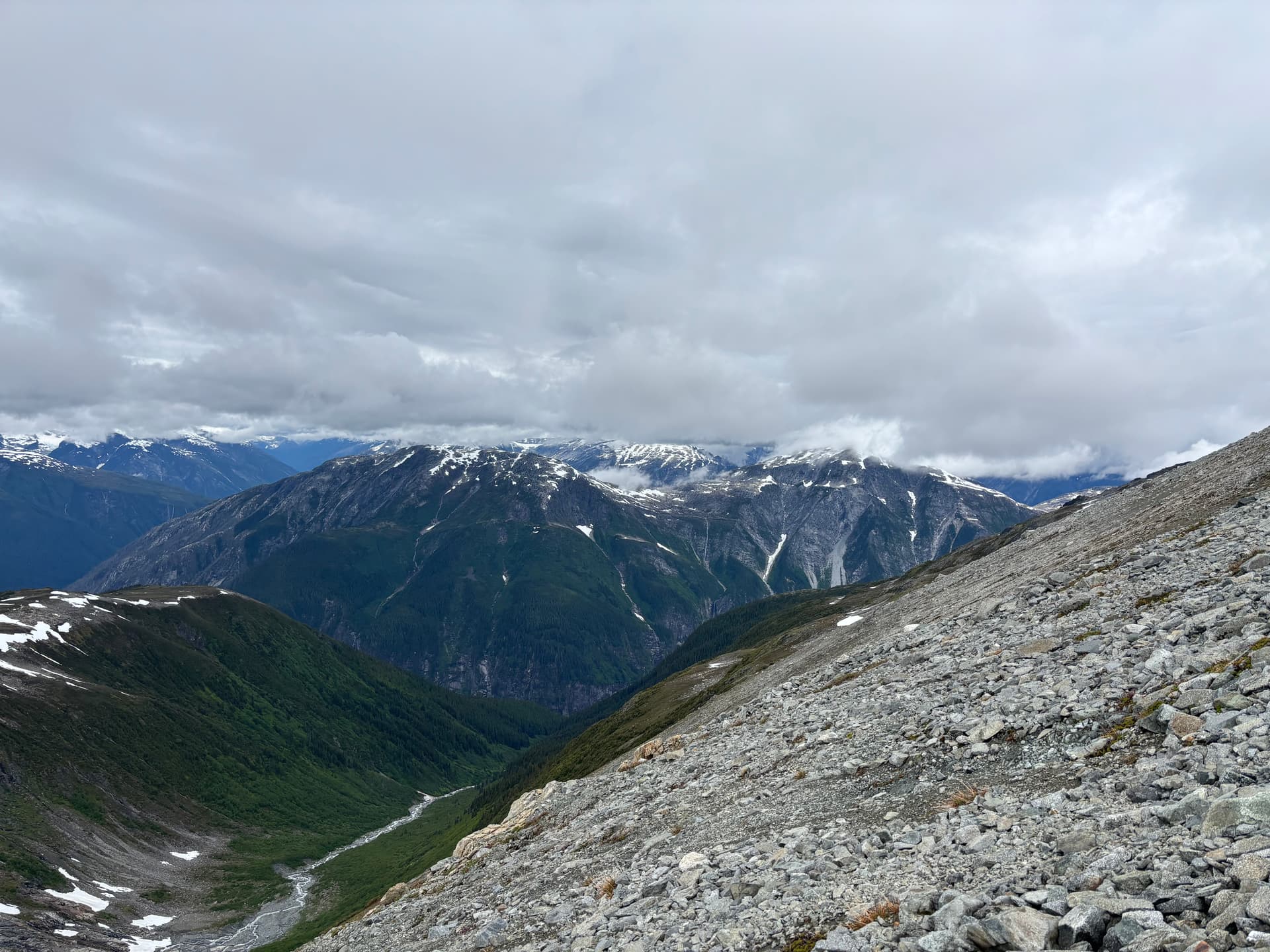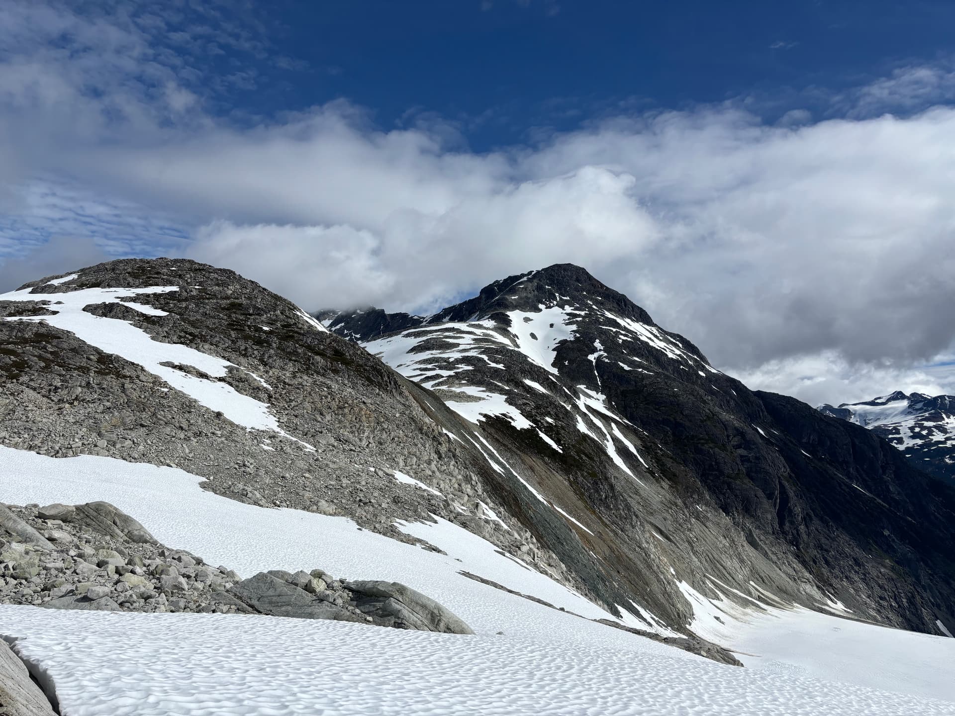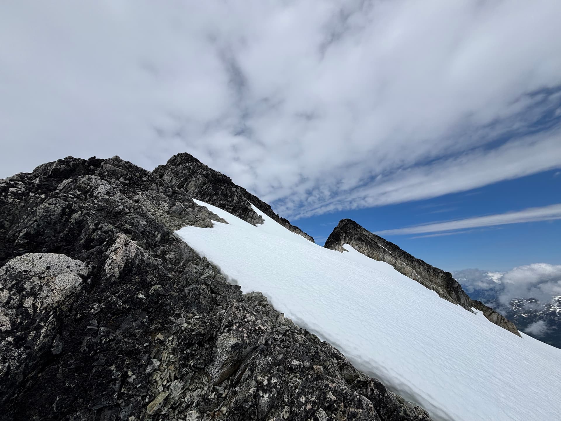 On day 5 we had beautiful sunny skies and made our way up and over the 2,251m peak losing some 600m of elevation before regaining most of it up to the ridge of Cornice Peak. As we made the long slog up our 1.5 day period of good weather would close shut. Once on the ridge we discovered a complete lack of tenable camping spots. The ridge was comprised almost entirely of bed rock with loose talus on top and after an hour of searching we found a measly patch of muddy dirt with a large rock sticking out to sleep on. Our tent was erected just as the last light faded and the rain bore down.