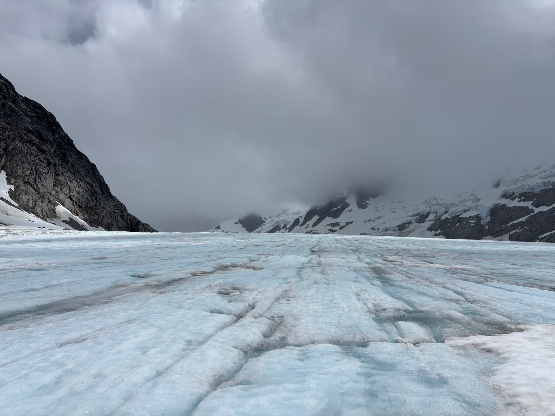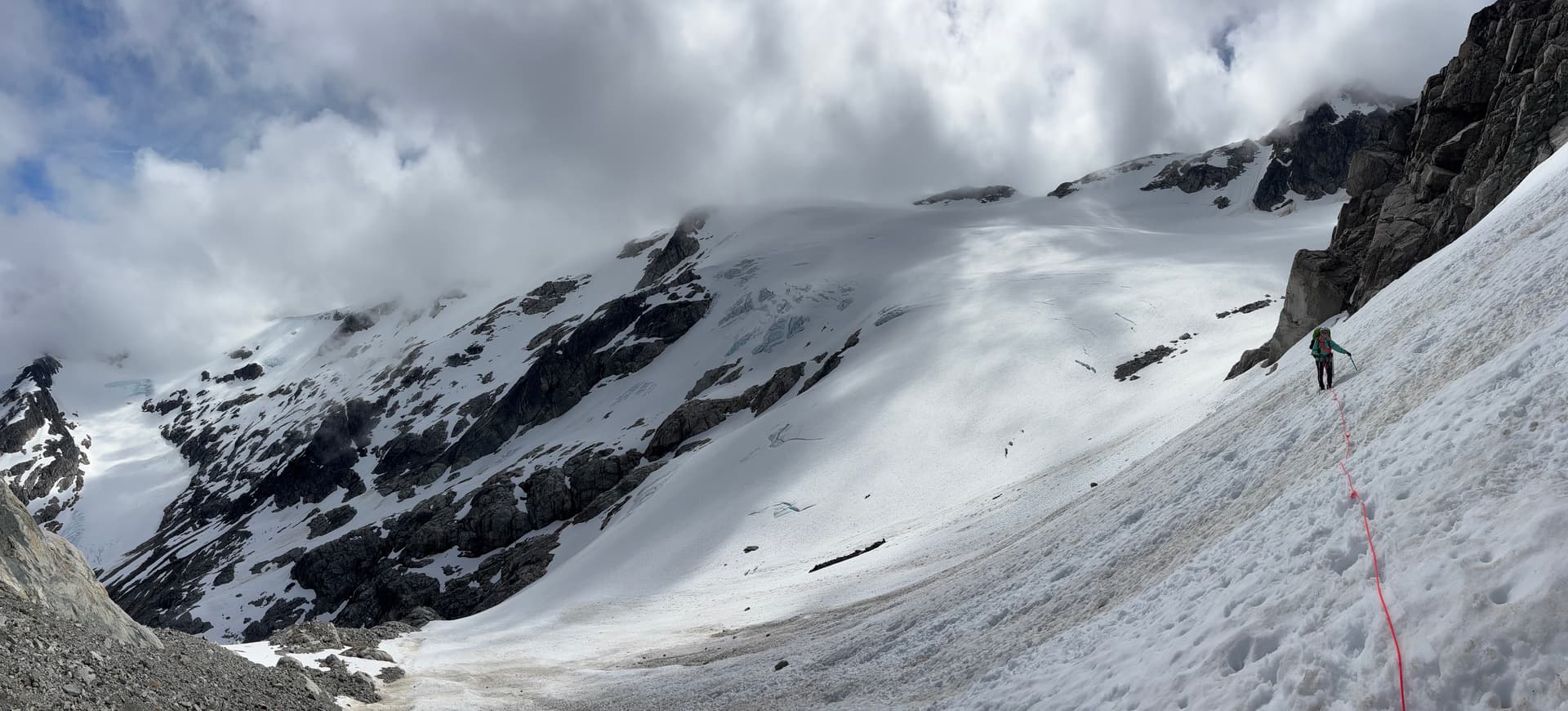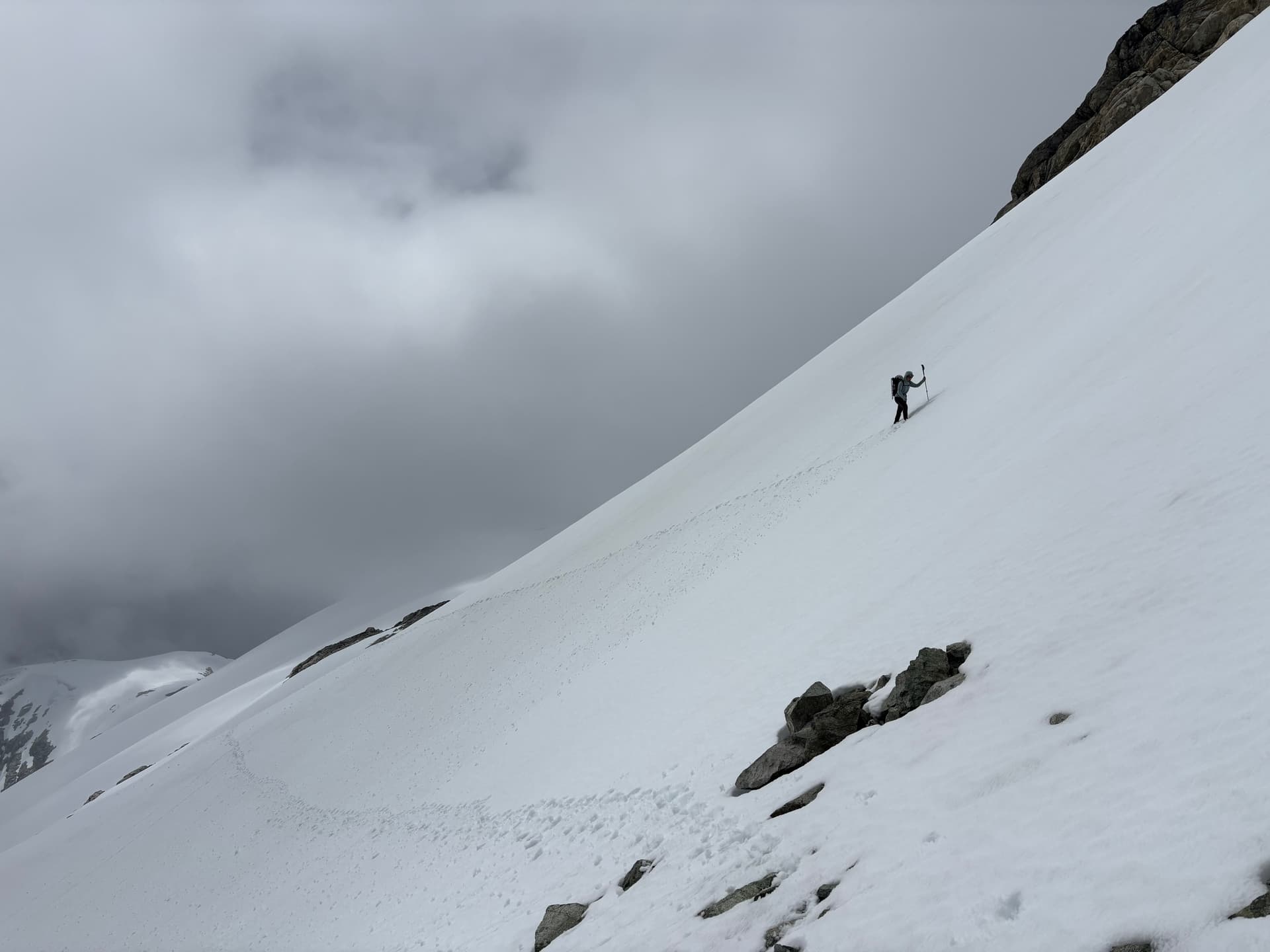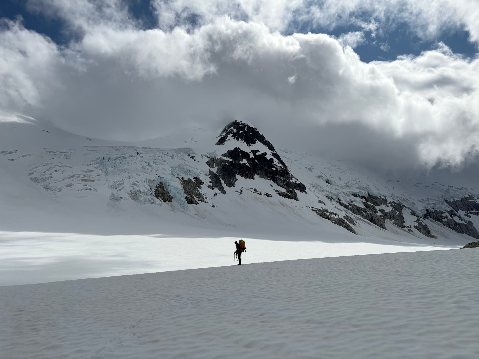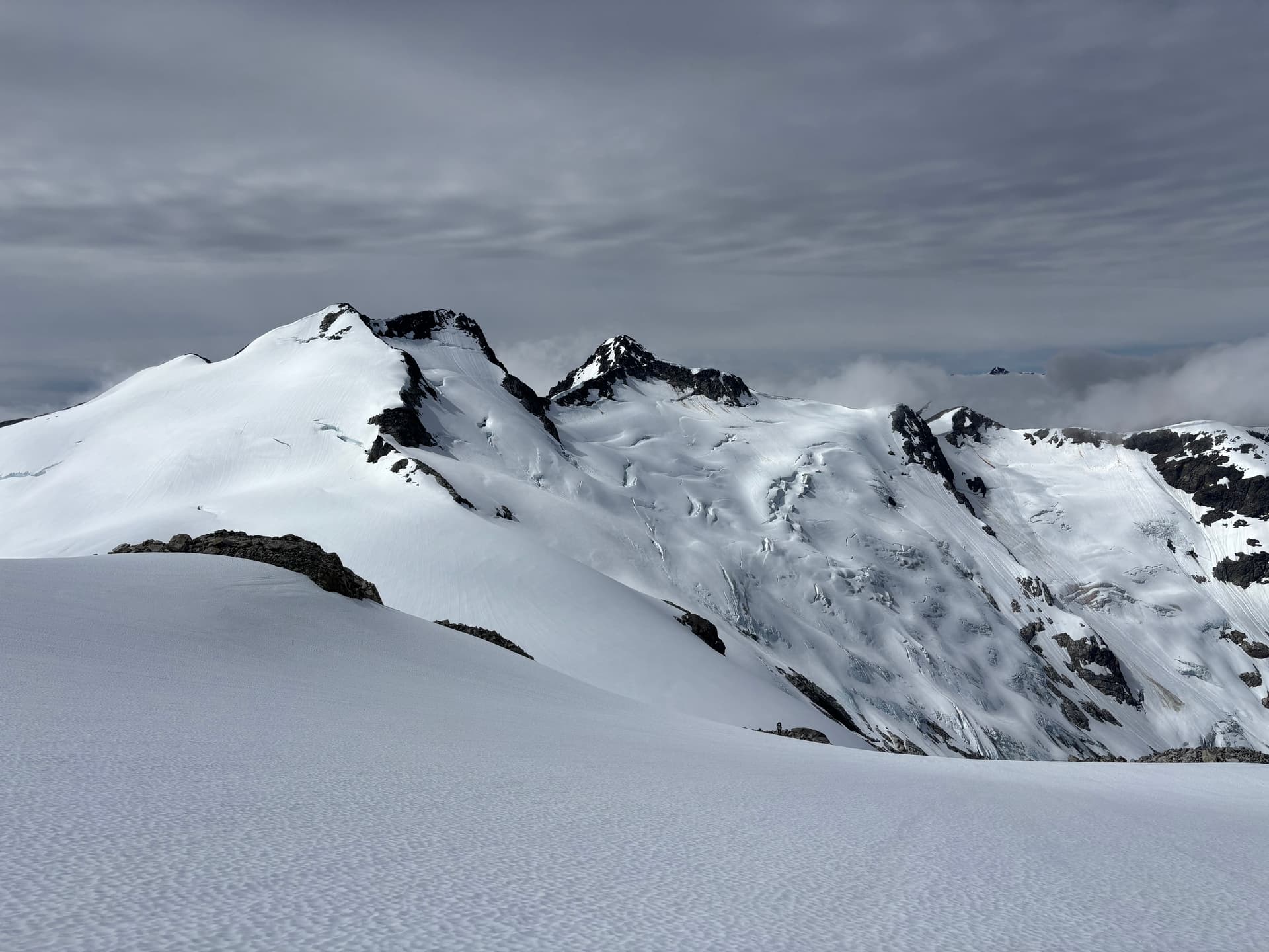 Bad weather had cut short our ability to explore this area east of the Tipso Creek-Kapella boundary so we had to settle for a half-day side mission instead. We set eyes on the tallest peak in this group an approximately 2245m summit to the south west. From “Peak 7200” we descended to the glacier and climbed up another ~7200ft summit that ended up being marginally taller than its eastern counterpart and likely unclimbed. From that summit we traversed along the ridge line all the way to our main objective. On the return threatening clouds began to roll in over the horizon. We hastily returned to our packs and reached them just as the rain started. From the summit we made a short scramble down to snow and then descended all the way to the col. At the base we came across fresh grizzly tracks and it was at that moment it dawned on me were in a wildlife corridor. Adding to that the col was devoid of any sheltered and/or flat spots to camp and so we resorted to deflated looking camp site inside a wind scoop.