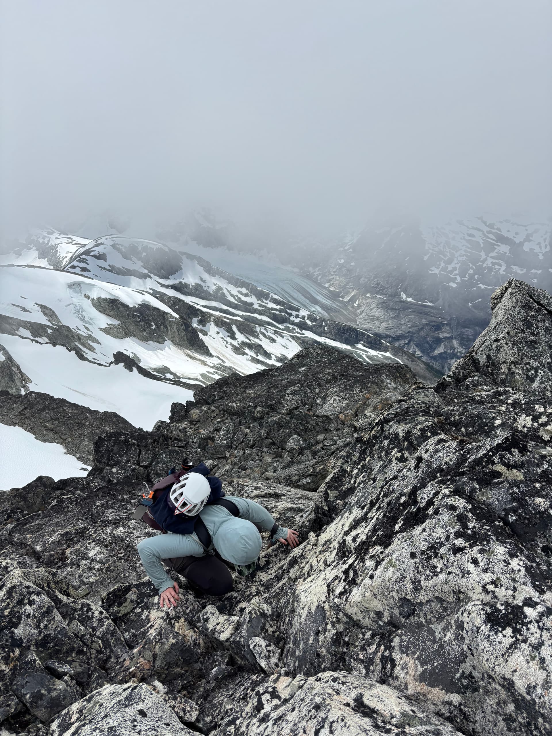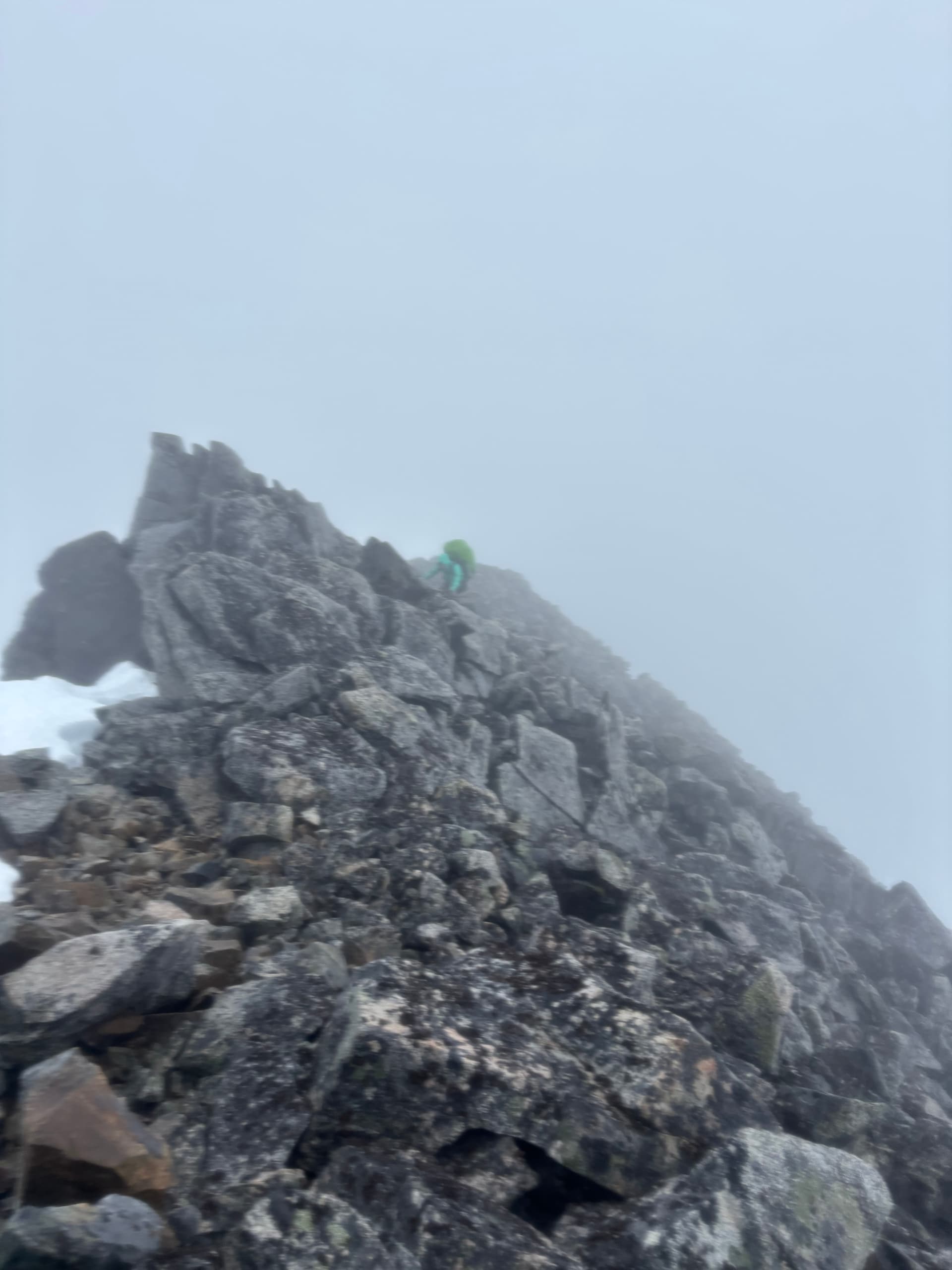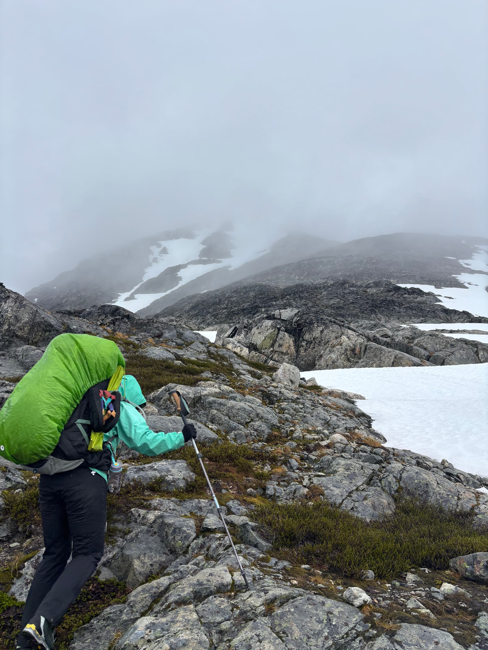 Day 11 marked the most miserable day of the trip. We knew a rainy, but amenable weather window would open briefly on Saturday and we were within shooting distance of Kimsquit Lake for a pick up. Sunday was a shut and closed affair so that left us to a tough decision: continue the traverse through the storm for a Saturday pick up or wait it out and finish Monday and overshoot our vacation time. Getting out early sounded nicer, so we bit the bullet and donned our damp pants for a waltz into the rain. Our first order of business was climbing up and over “Peak 7400” above our camp. A summit which we’ll call “Hindsight Peak” if it turns out to be unclimbed. As we ascended up tame terrain, the rain briefly paused and we thought for a moment this might not be all bad. That would all change as we rose up the ridge into the clouds. The rock steepened the light winds turned to gusts. Before long we found ourselves pulling strenuous exposed moves through slick lichen covered rock as the rain and wind hammered us. After a tense section of perhaps 4th class scrambling we topped out on the ridge at last. We reached the western ridge without much trouble but hit a knife edge section on the descent. Visibility was down to 10 meters, but we managed to find a snowy bypass and were relieved to finally hit the col a short while later.
