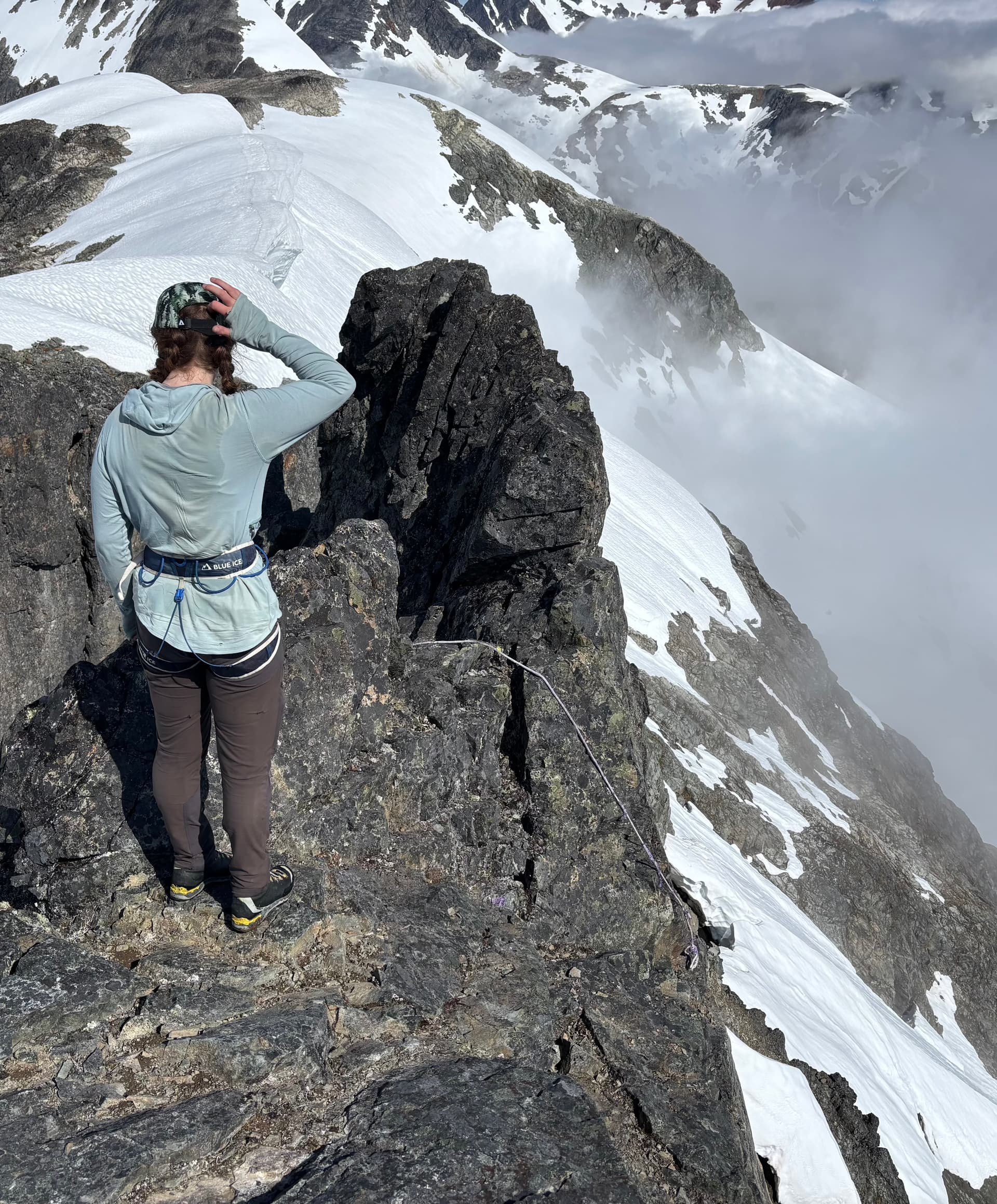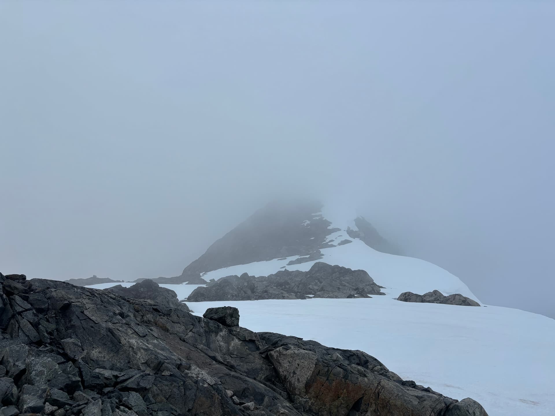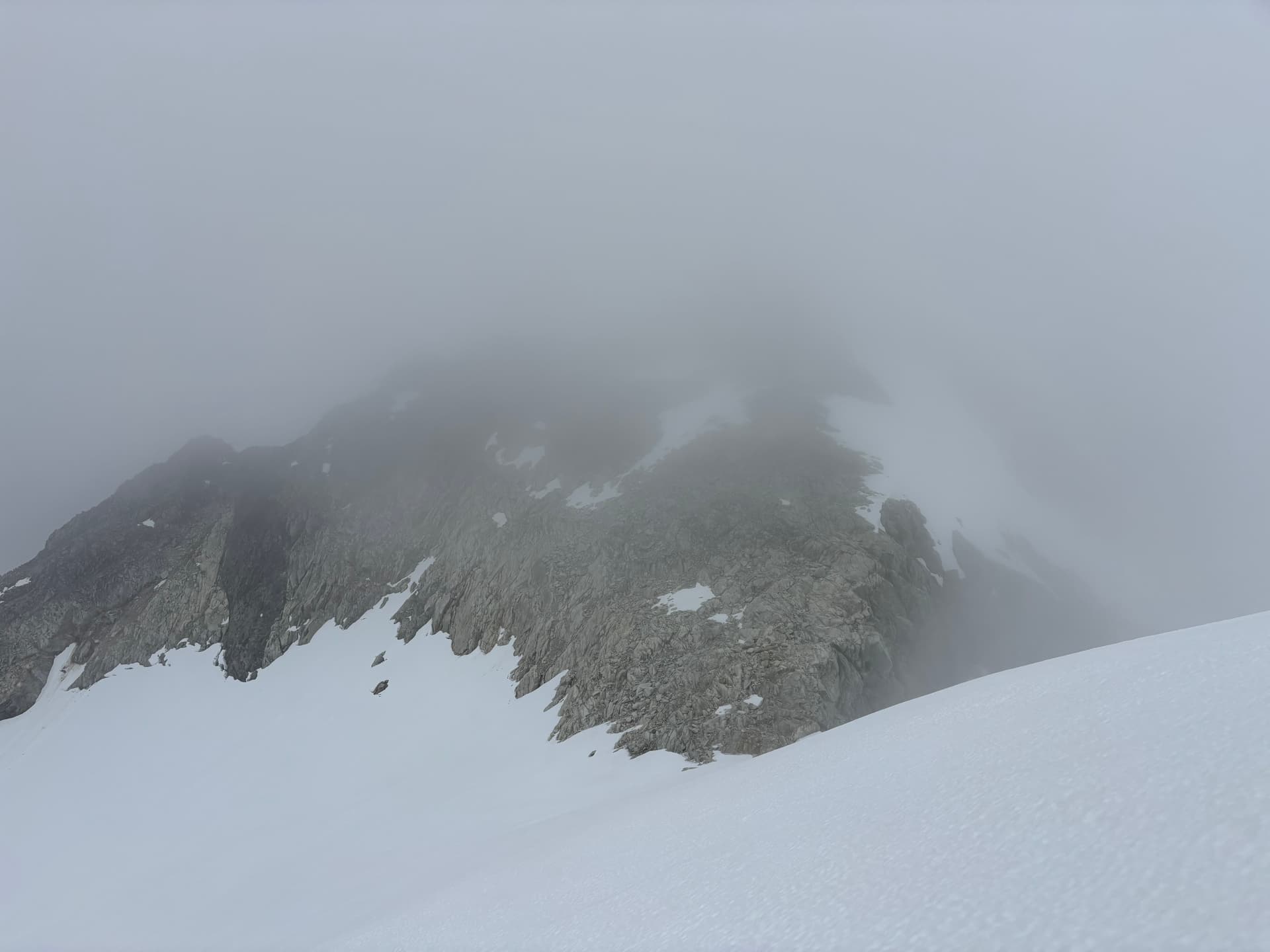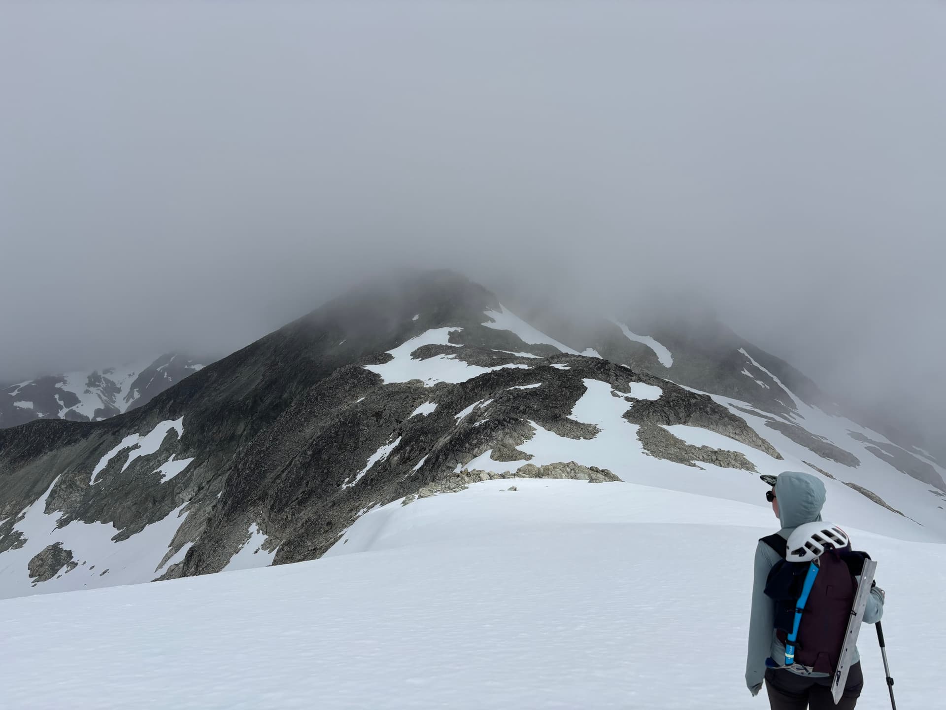 Day 11 marked the most miserable day of the trip. We knew a rainy, but amenable weather window would open briefly on Saturday and we were within shooting distance of Kimsquit Lake for a pick up. Sunday was a shut and closed affair so that left us to a tough decision: continue the traverse through the storm for a Saturday pick up or wait it out and finish Monday and overshoot our vacation time. Getting out early sounded nicer, so we bit the bullet and donned our damp pants for a waltz into the rain. Our first order of business was climbing up and over “Peak 7400” above our camp. A summit which we’ll call “Hindsight Peak” if it turns out to be unclimbed. As we ascended up tame terrain, the rain briefly paused and we thought for a moment this might not be all bad. That would all change as we rose up the ridge into the clouds. The rock steepened the light winds turned to gusts. Before long we found ourselves pulling strenuous exposed moves through slick lichen covered rock as the rain and wind hammered us. After a tense section of perhaps 4th class scrambling we topped out on the ridge at last. We reached the western ridge without much trouble but hit a knife edge section on the descent. Visibility was down to 10 meters, but we managed to find a snowy bypass and were relieved to finally hit the col a short while later.