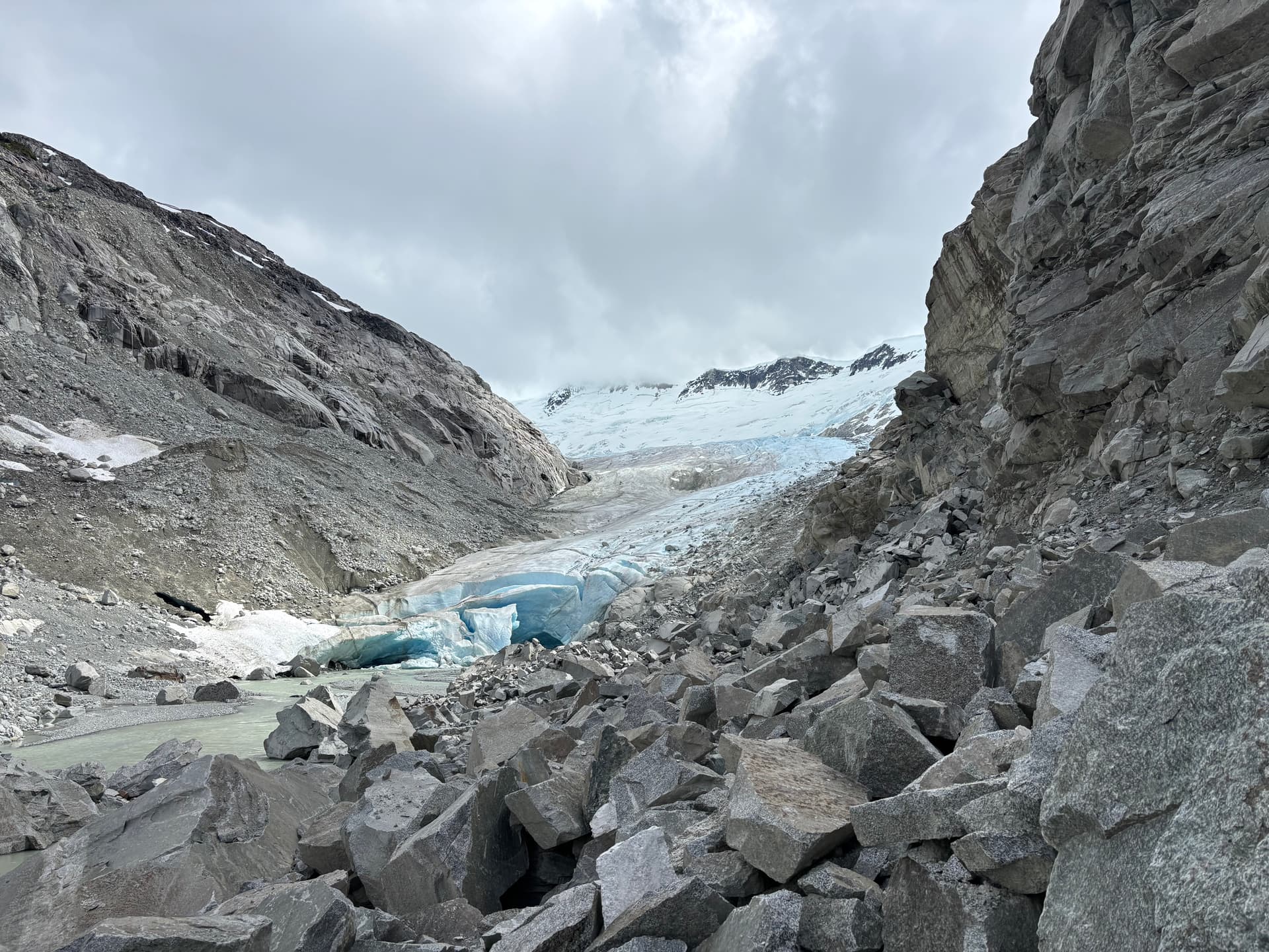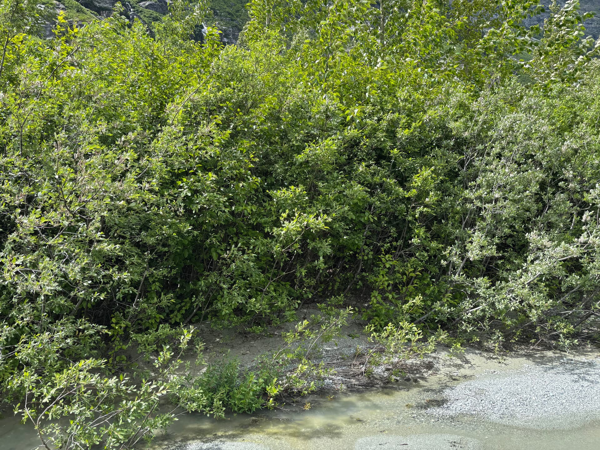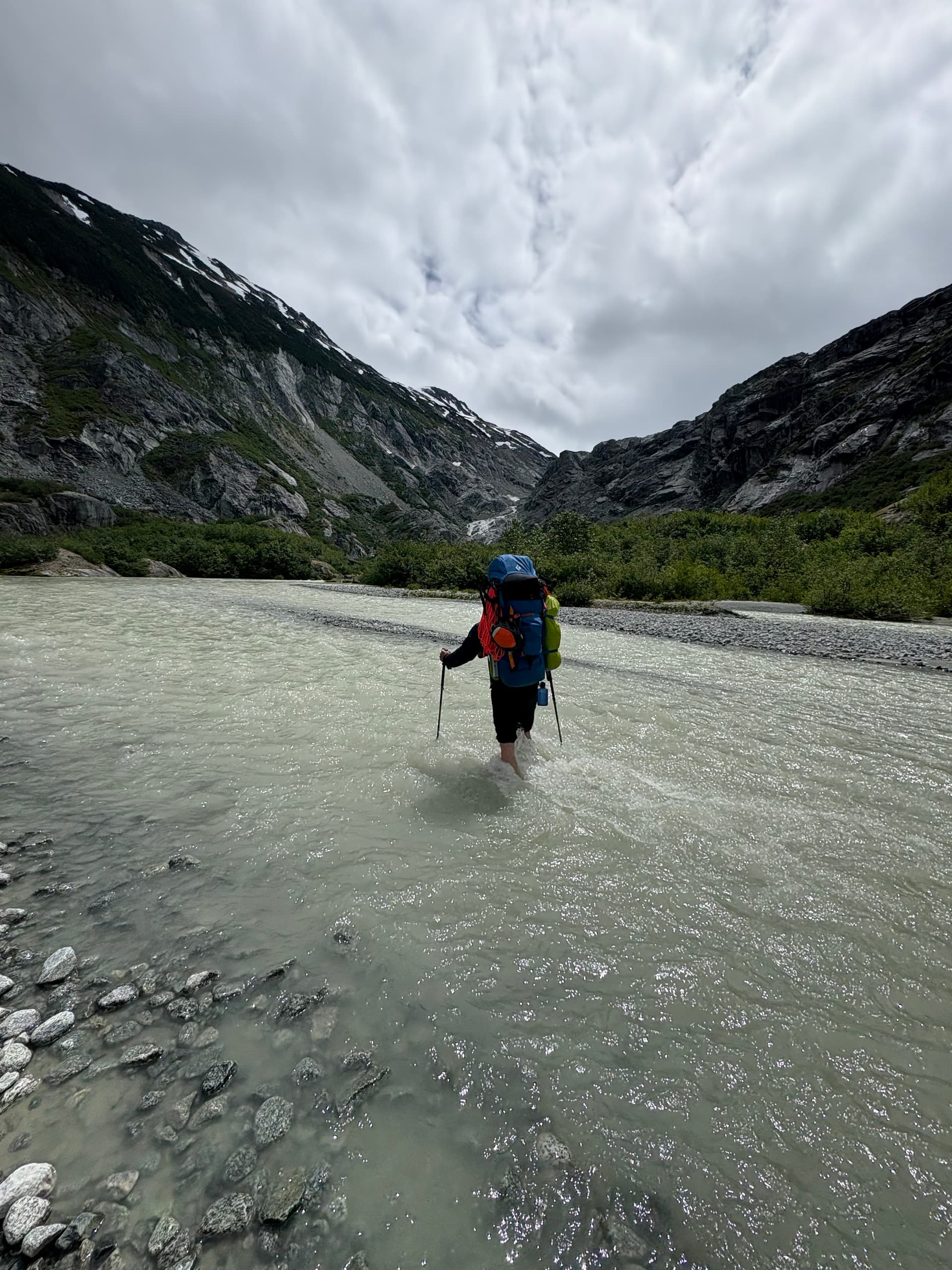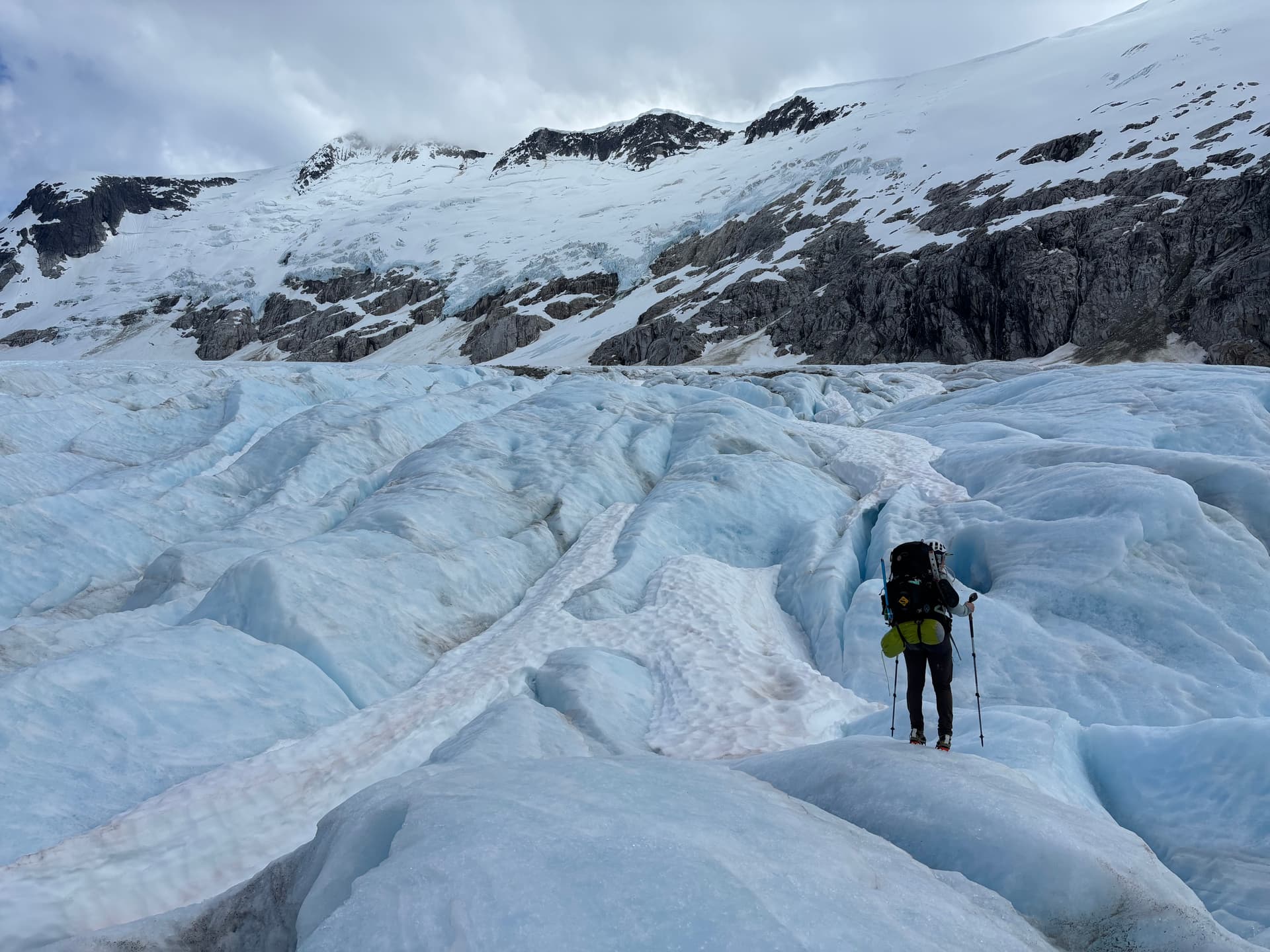 On the 28th we drove out to Nimpo Lake and spent the following Sunday hanging around town for the weather to improve. Thankfully after just a days wait, Tweedsmuir Air whisked us off to the unnamed glacial lake. We had an hour long flight to pore over countless breath taking summits before our pilot, Sam, made a smooth glide down to the water up to a perfect sandy beach. After the plane left our sights, we got to work heading towards the glacier snout above the lake. First we had to pay the coastal bushwhack tax though. This new greenery hadn’t appeared on any satellite imagery, but by the time we arrived it had a well established foot hold up to the glacier. Buckling under the weight of our back packs, we fought our way through the alder and brush before finally reaching easier moraine high above. A narrow canyon offered safe passage at climbers right and by late afternoon we had reached the glacier at last.