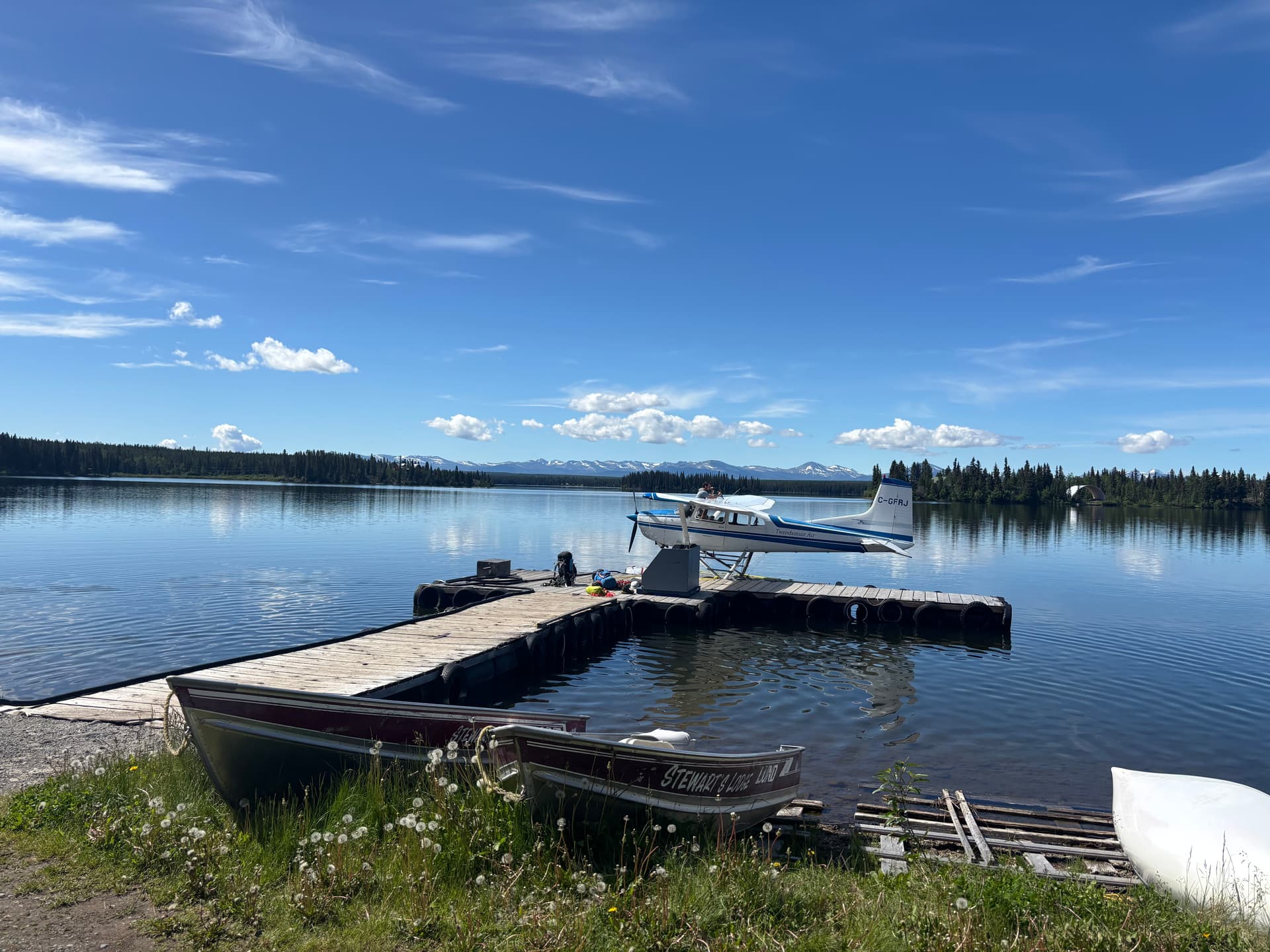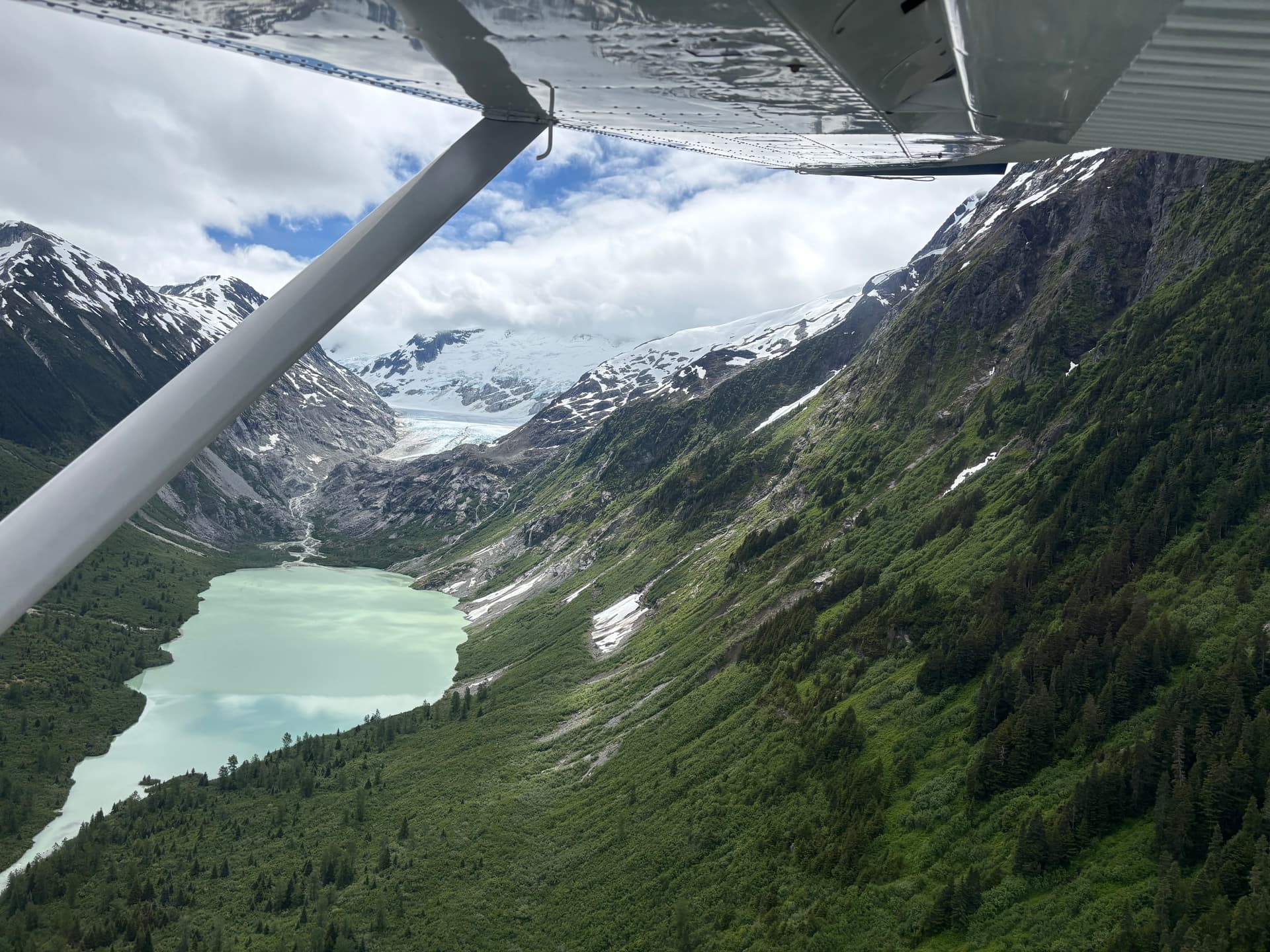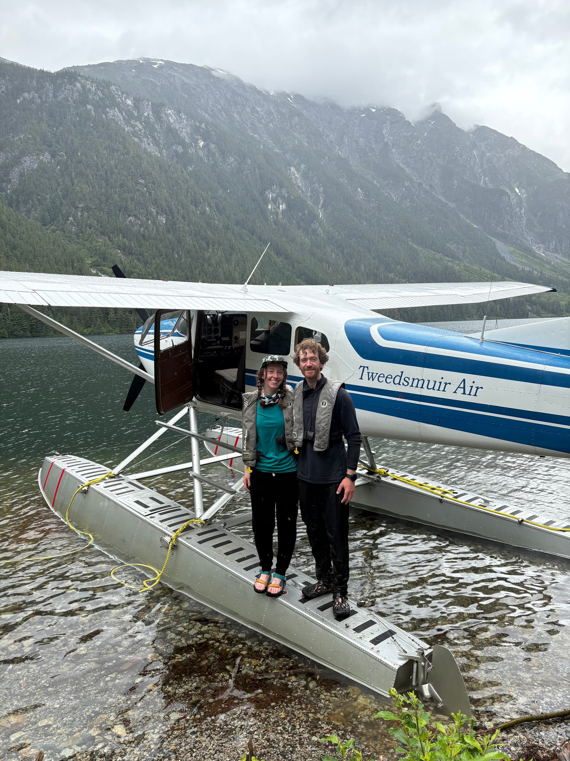 The scree ramp took us down to tame slopes and snow fields and we traversed a long ways around Peak 7400 and into the forest. At this point we were hoping for a fast descent as we had pushed the float plane pick up back 30 minutes and even that was looking tight. The sub-alpine forest zone was the most time consuming with bluffs, slick brush and roots and we fell down looney-tunes style until more open forest around 700m. Again realizing we might not make the pick up time we sent one last minute message to come at 1pm, but we weren’t certain if it went out in time. From there it was a frenzied rush down to the shore line. 300m above the lake we heard the plane land on the water. Andrea let me run ahead to catch the pilots attention, so I bull dozed my way down through the forest half falling towards shore and popped out above the cliffy shoreline. I yelled frantically but the plane’s engine was running and I wasn’t sure if they’d just circle around before powering off. I damn near fell into water trying to wave him down, but the shore was just too bushy for him to see me. Finally our pilot, Ethan, cut the engine and I managed to get his attention. From there the pressure was off.