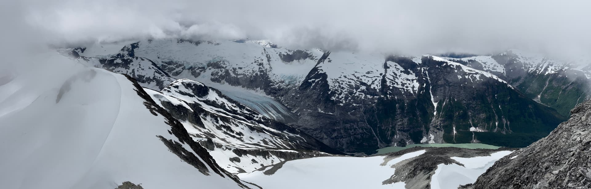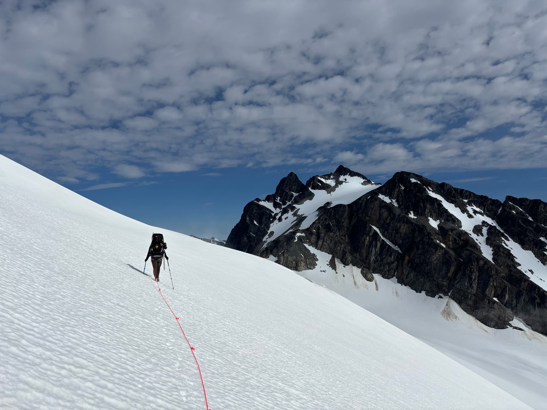 By the next morning the winds had abated but the rainy weather continued on and we spent one more day tent bound. Day 10 was to be an excellent one when we awoke to gorgeous sun at last. We’d finally get to climb up and over Sharks Teeth Peaks; an aesthetic set of pointed summits that marked the highest point on our traverse. This also marked the trickiest section of glacial travel as the north side of Sharks Teeth looked down right daunting in satellite imagery.