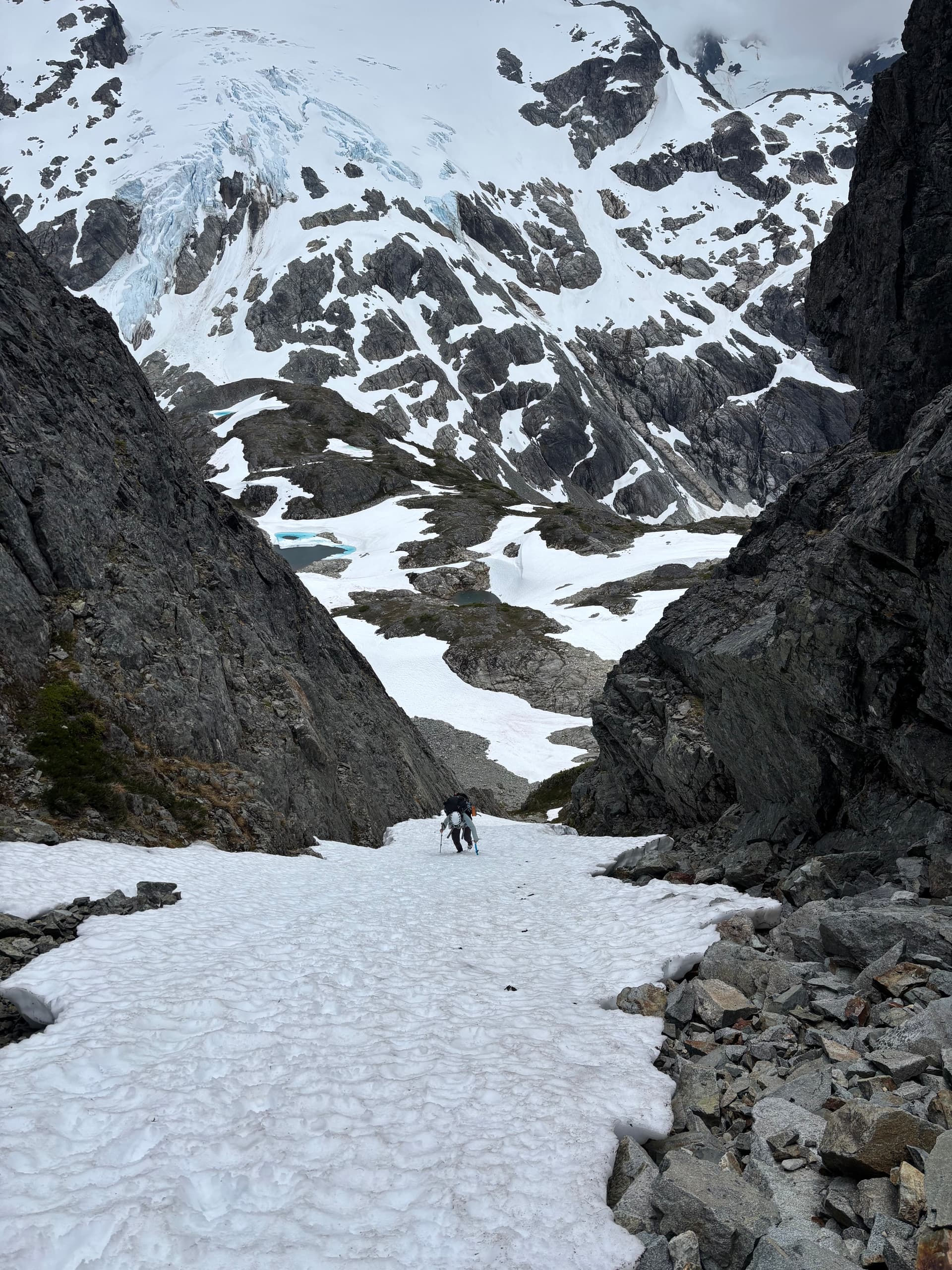 From our camp we traversed along the north east glaciated face of Peak 7400 and then up to the Sharks Teeth. Together we scrambled up the highest summit while I went further to the second highest to get eyes on the glacier. Unfortunately the crux of the glacier was not visible, so there was nothing left to do but check it out. We returned to our packs and head down the north side. Much to our luck we find a viable option along the skiers right side before reaching the top of a massive ice fall. This part of the glacier likely once connected with the col below, but that was no more. Again we found a bypass on the right side down slabs and scree and reached the col at last!