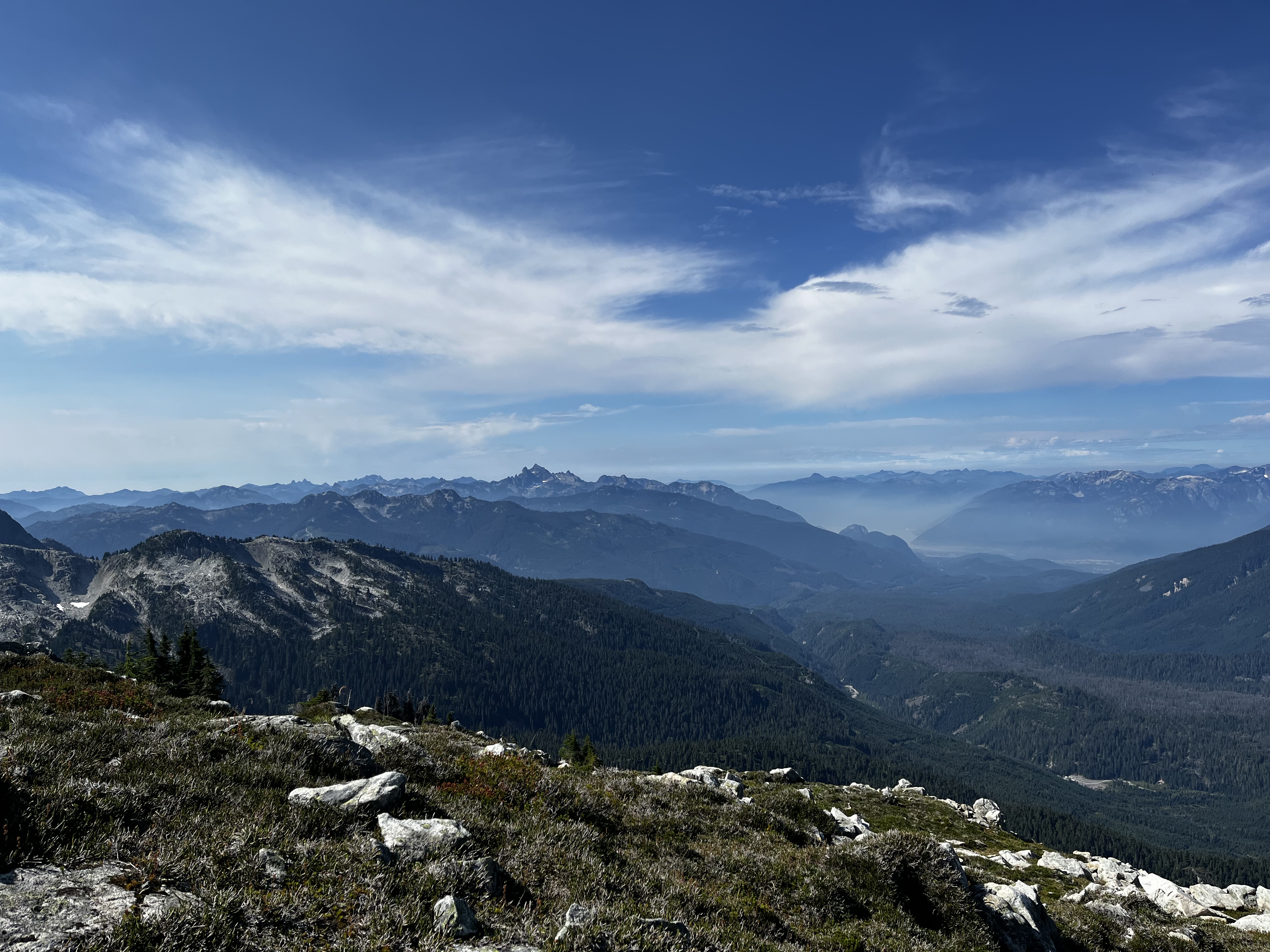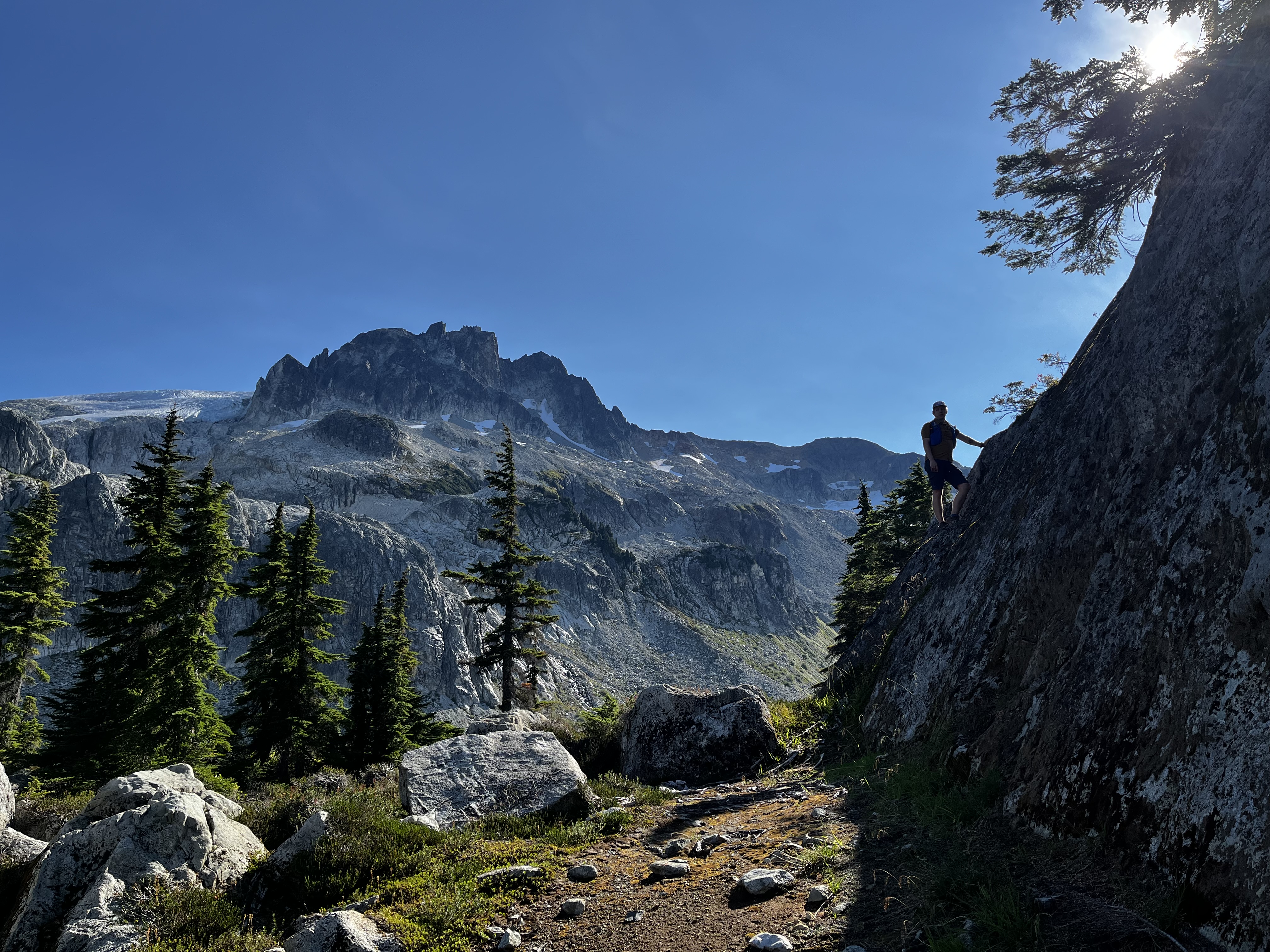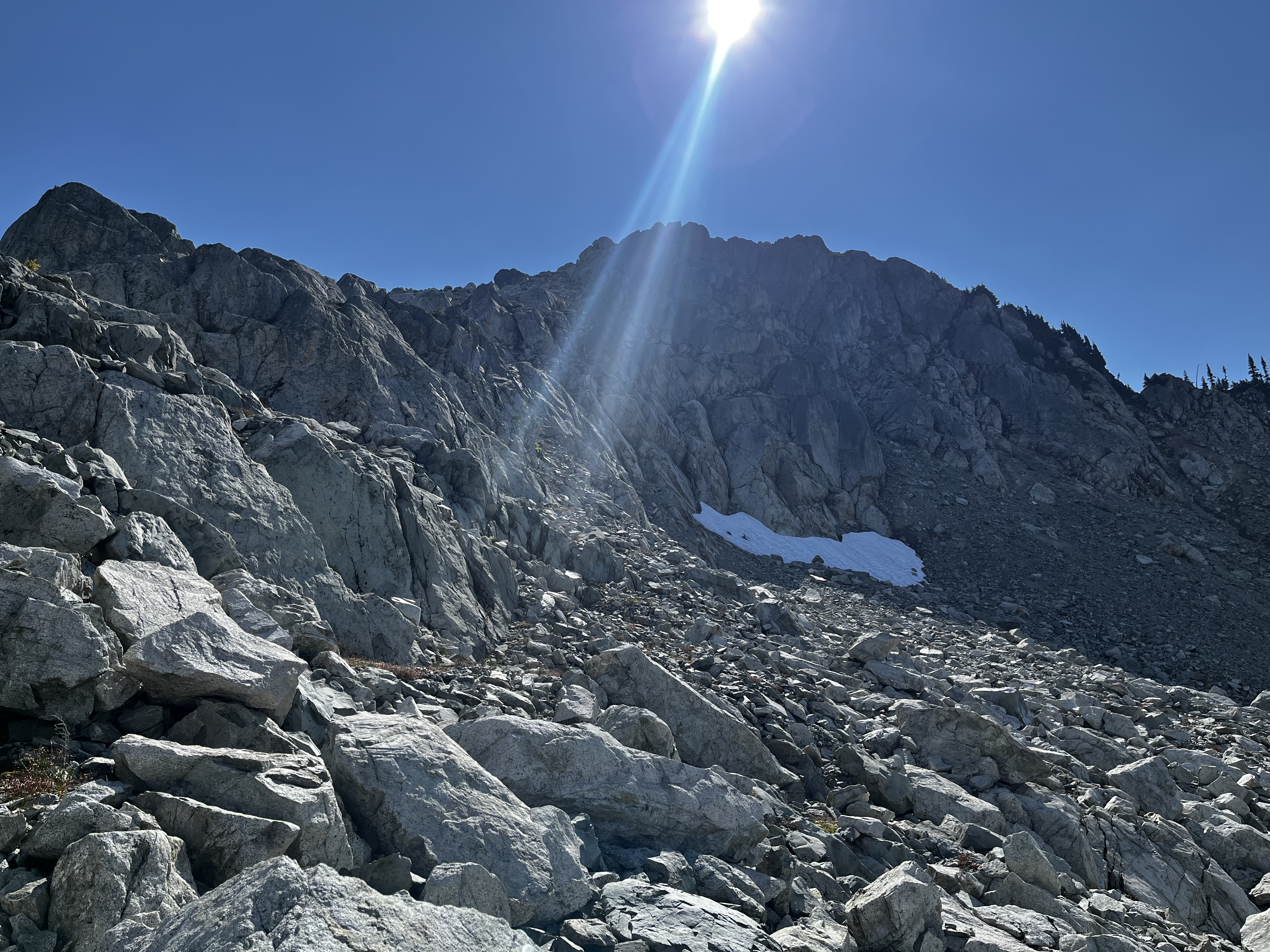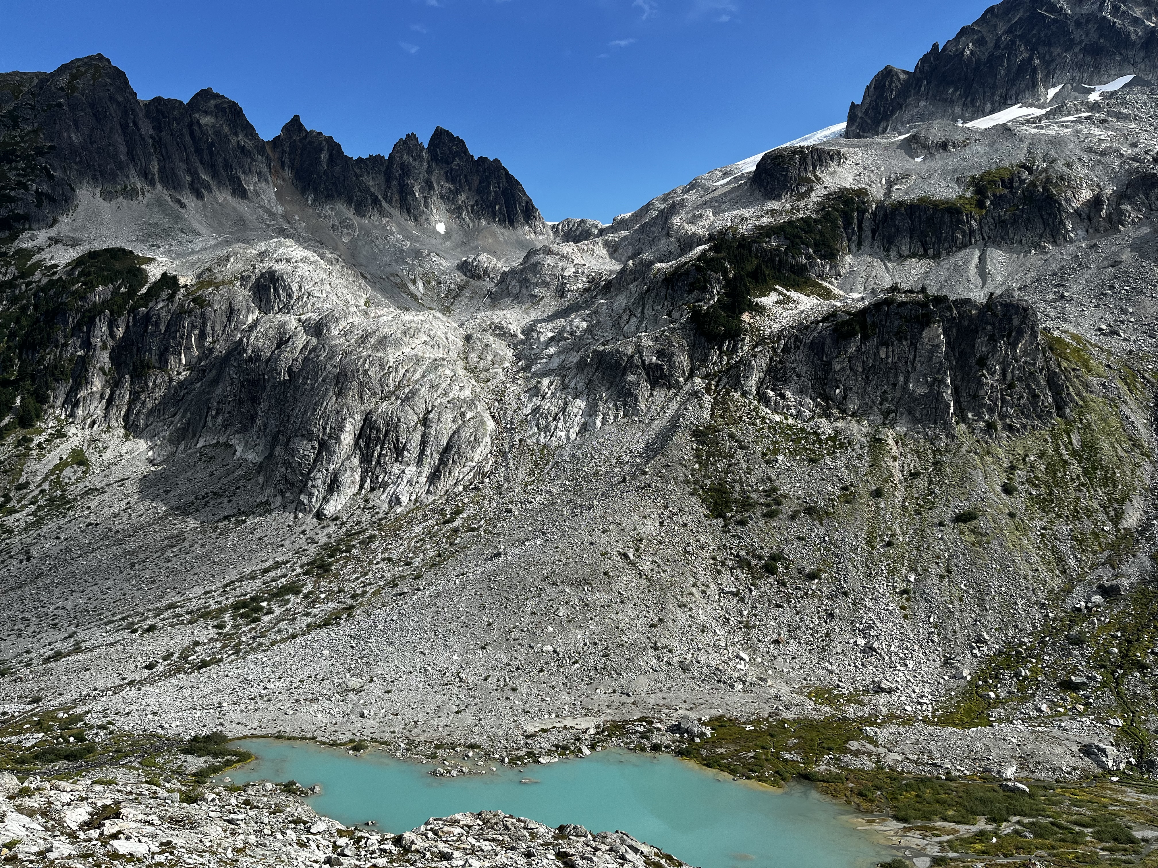 We kept on the ridge to get to Manic Peak. Two of our 3 person group decided to stop at a subpeak so I went to the peak by myself. Views were amazing, although it is quite hazy right now. I then retraced my steps back to my group and we decided to decend a gully towards the lake.