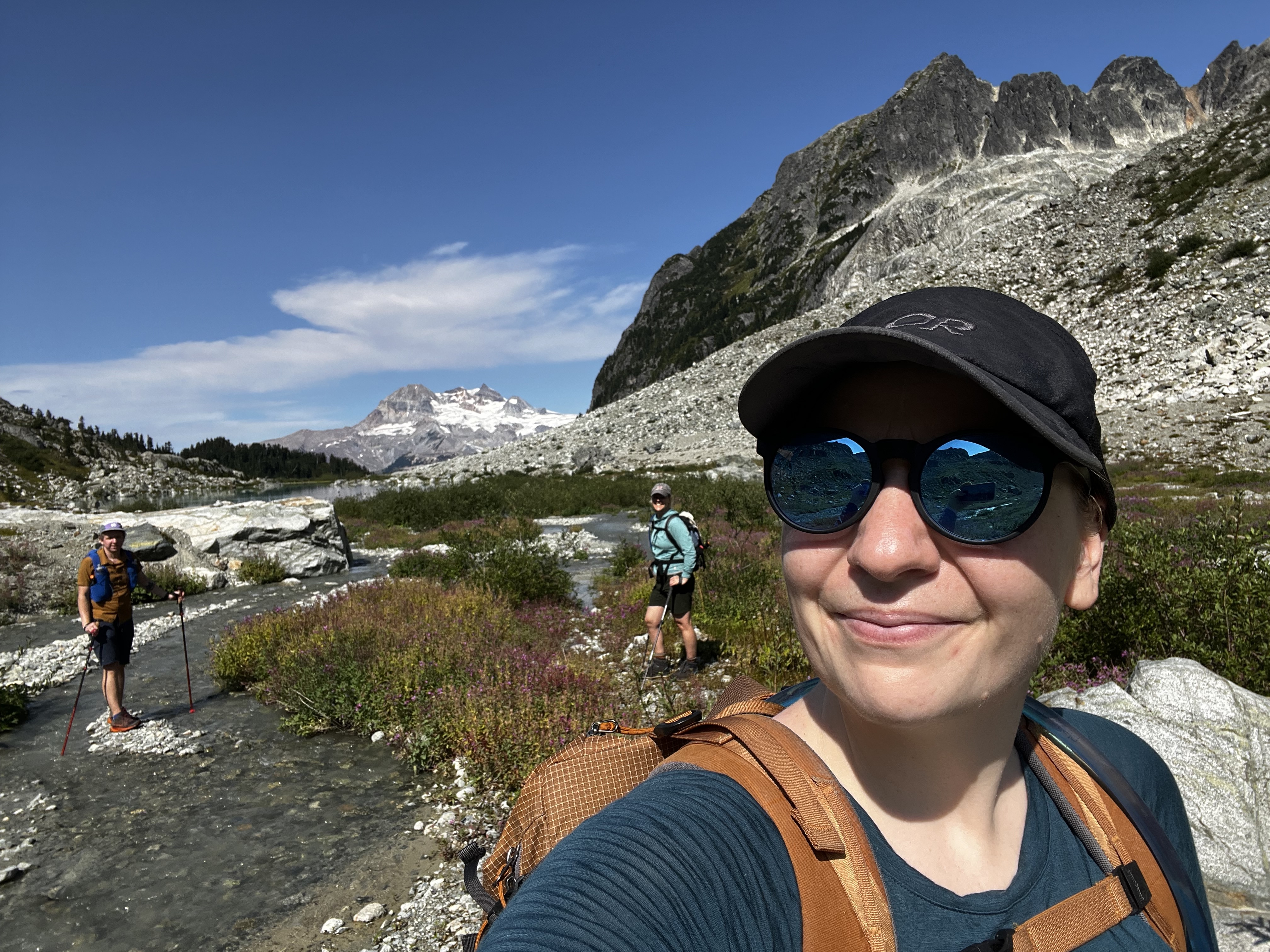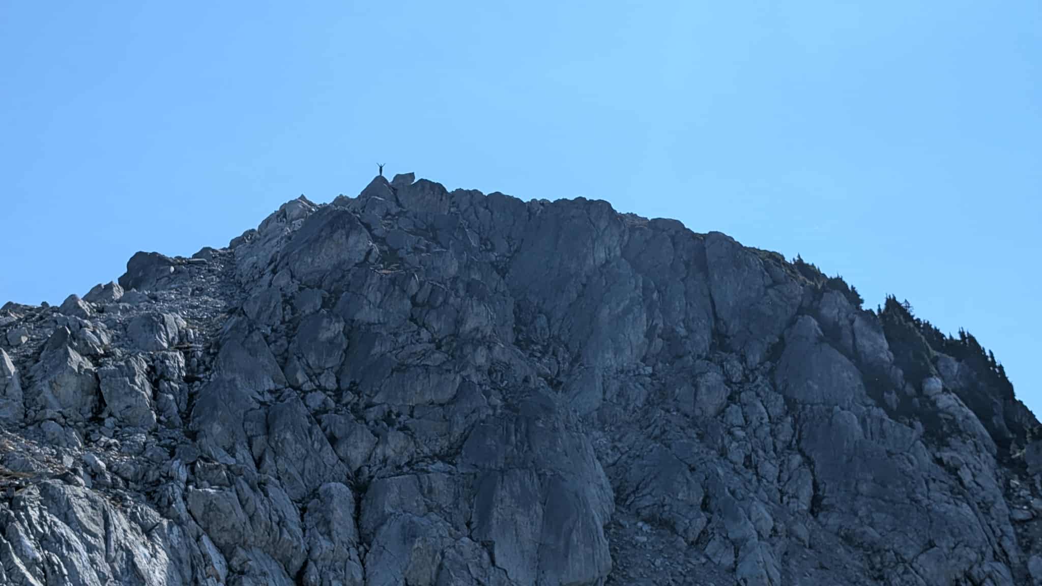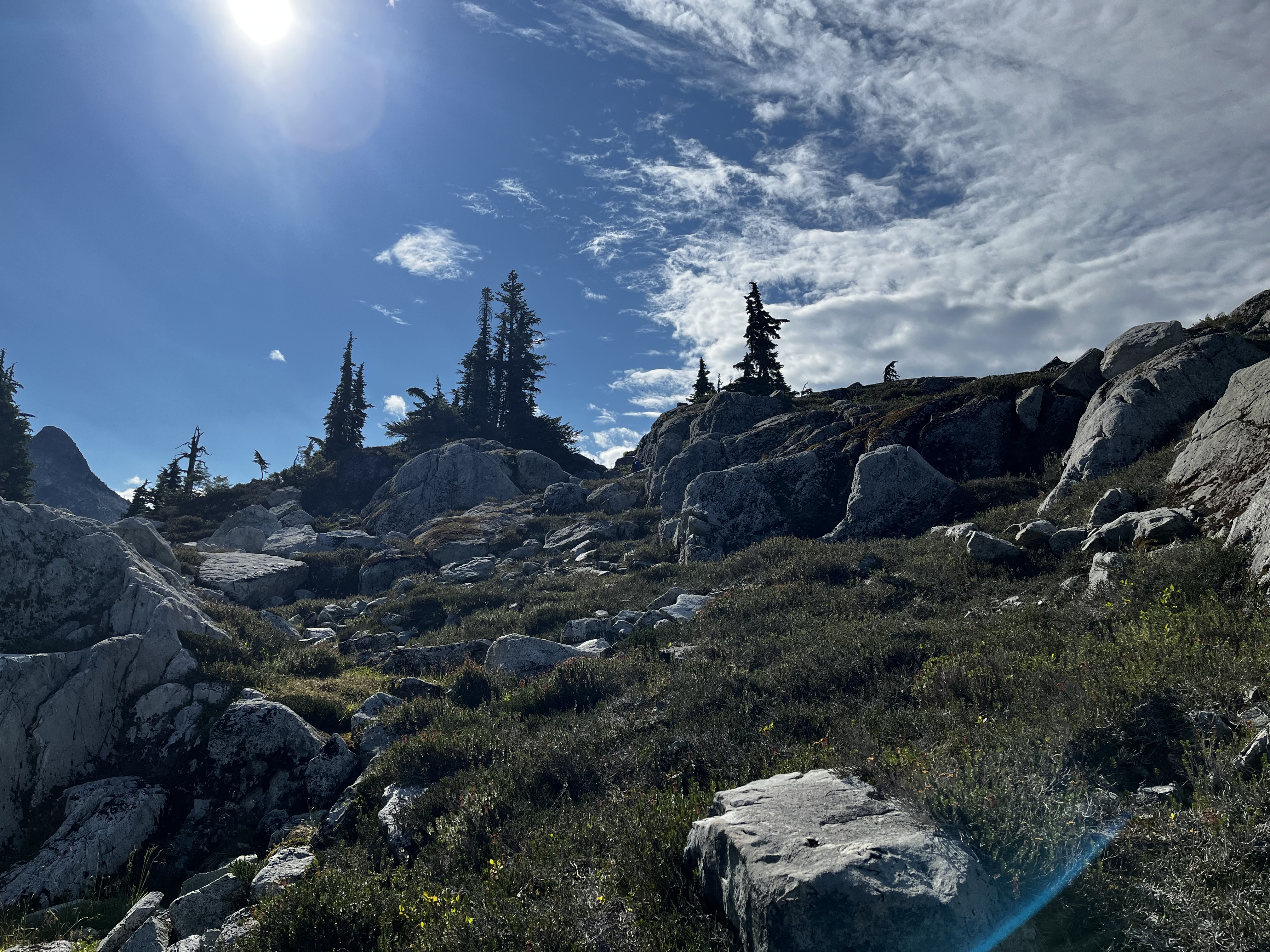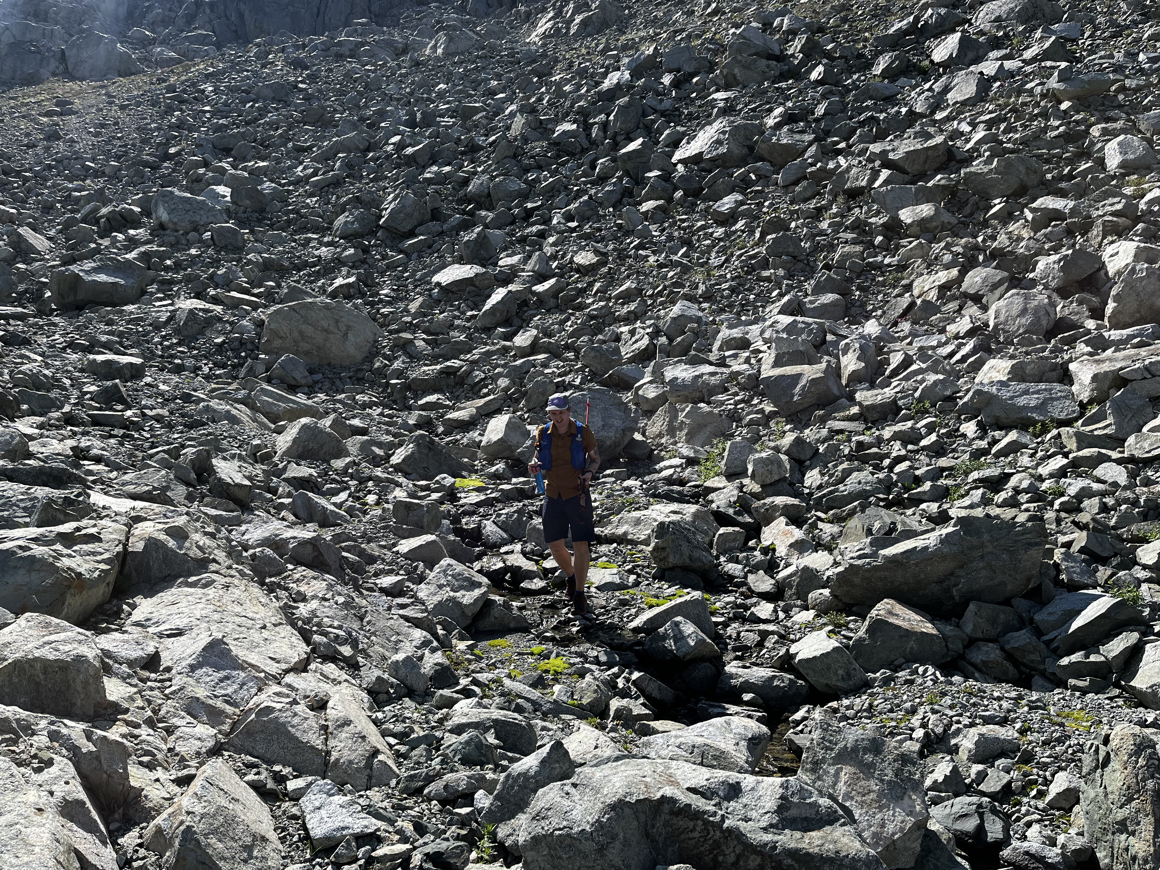 We kept on the ridge to get to Manic Peak. Two of our 3 person group decided to stop at a subpeak so I went to the peak by myself. Views were amazing, although it is quite hazy right now. I then retraced my steps back to my group and we decided to decend a gully towards the lake.