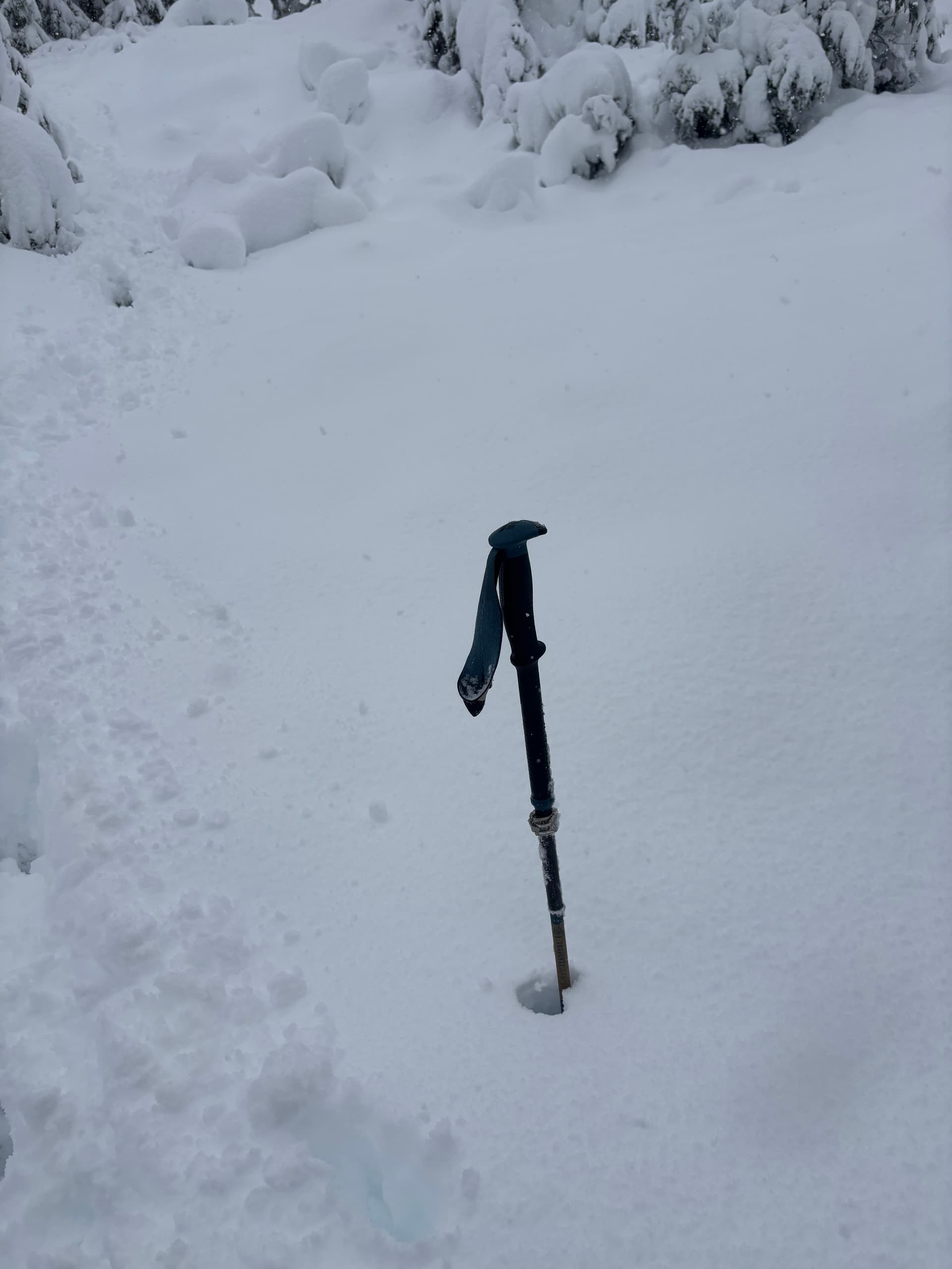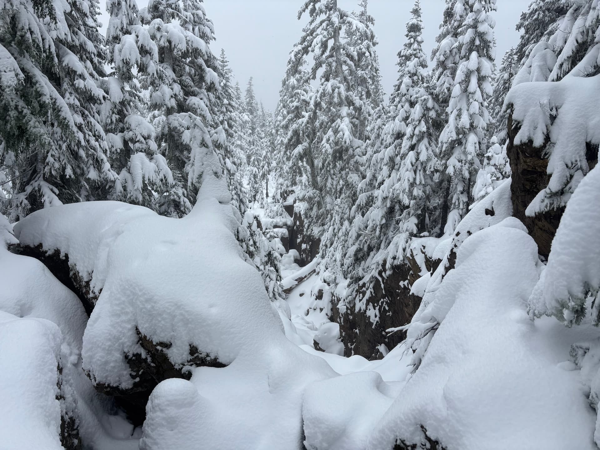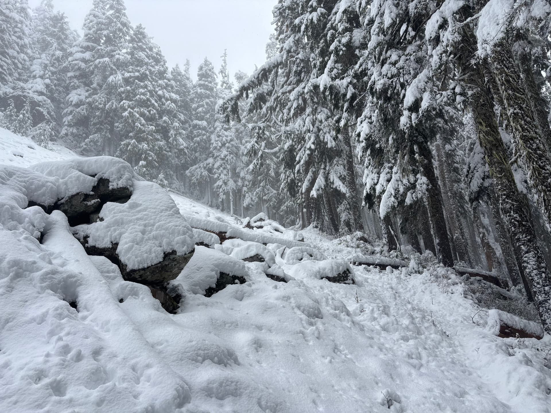 From there I located the start of the trail and ascended up through the cutblock and into open forest. At this elevation the precip was falling as snow and I actually started to dry off. The snow started in earnest around 1,200m. From 1,350m and up the depth picked up and by the time I was on the ridge it was around 1.5 feet deep in most places. Thankfully, it was pretty light snow and I managed to post hole all the way to the summit.