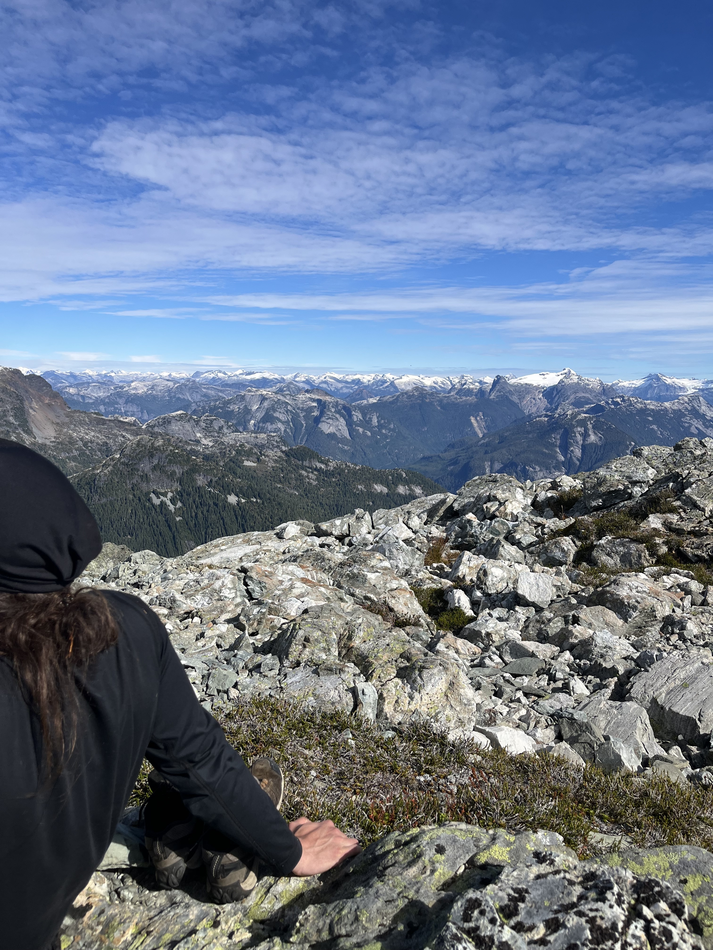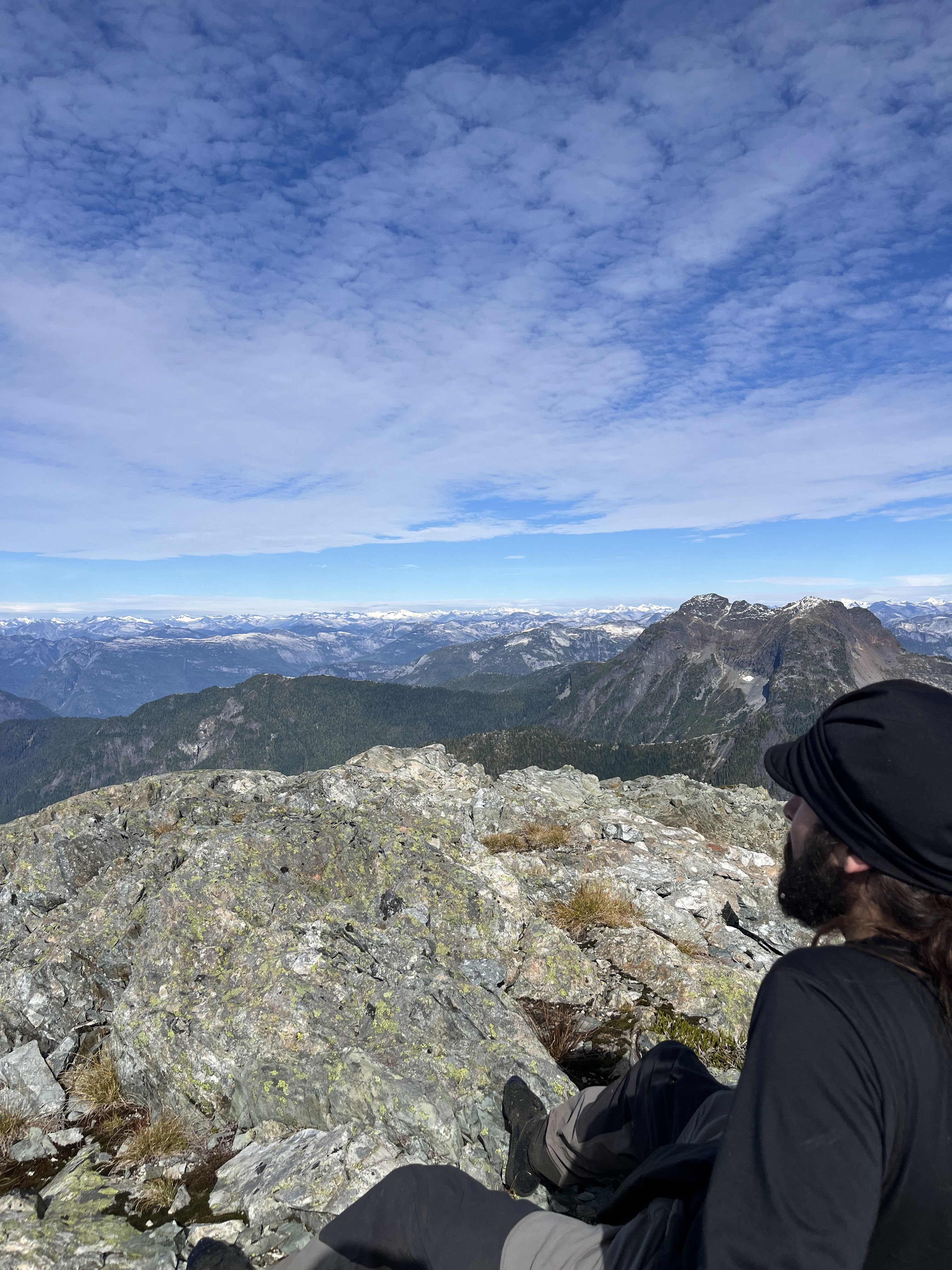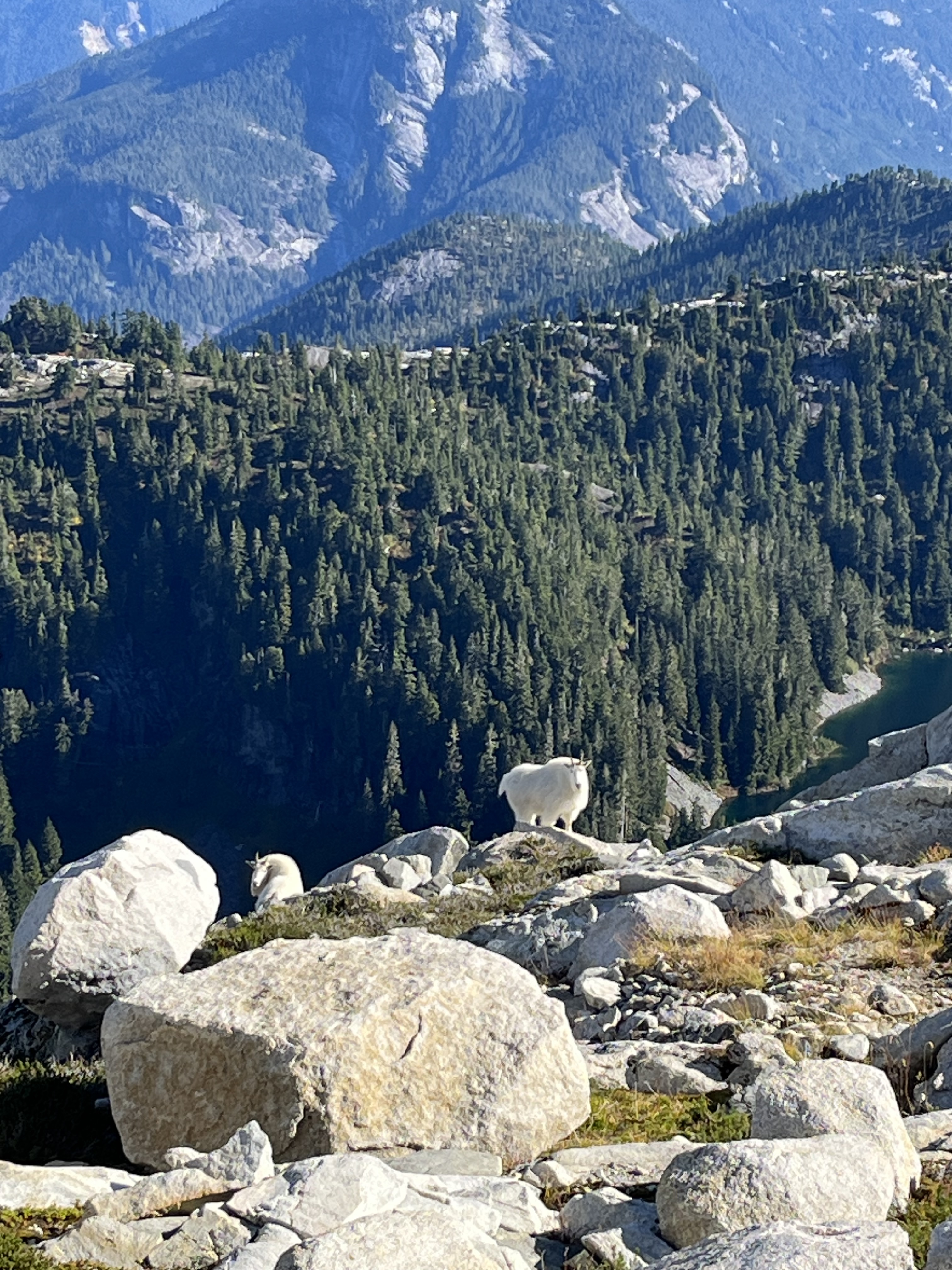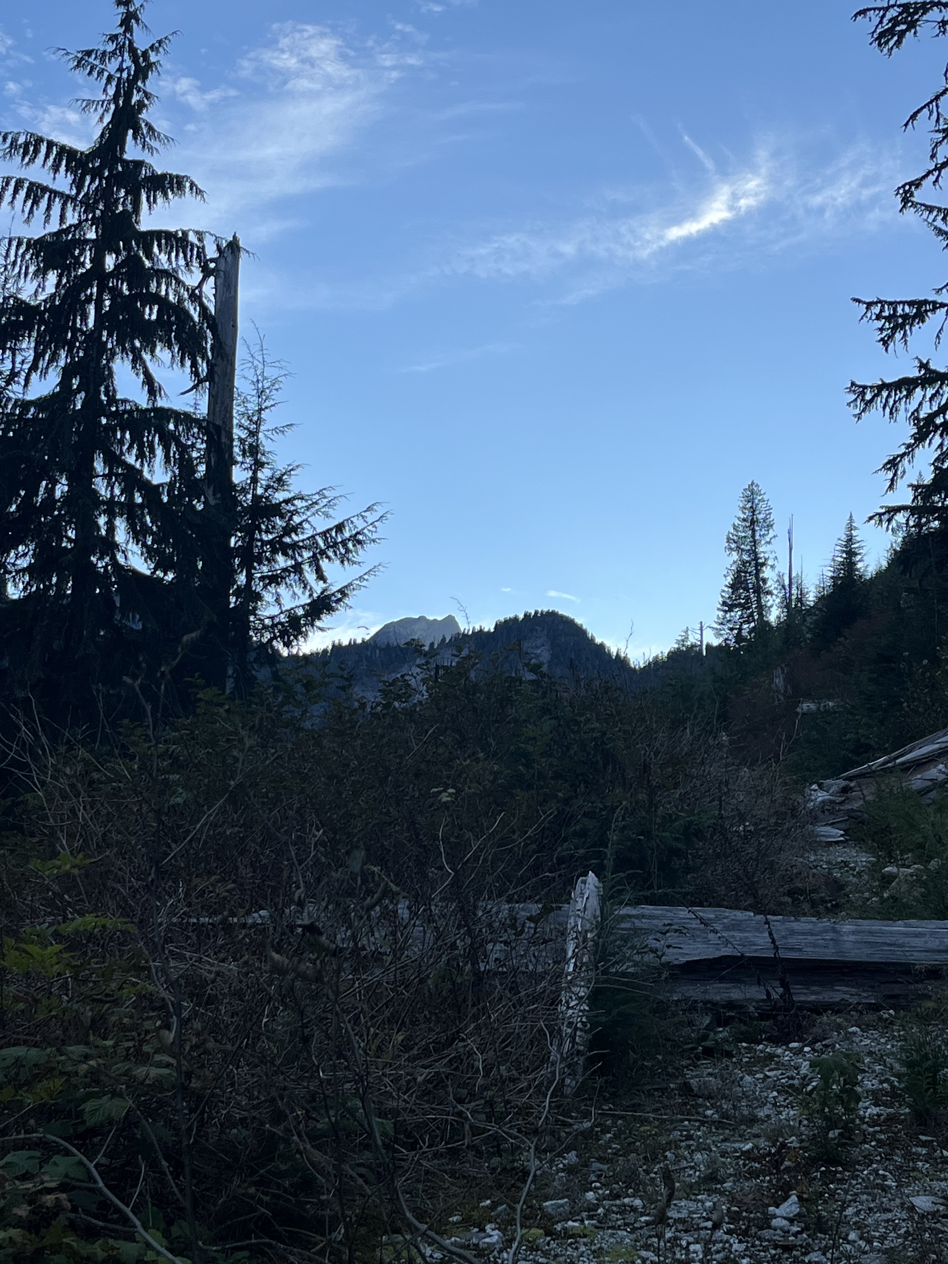 Matteo, Felix, and I started our hike from Dianne Main - a deactivated FSR 15mins past climbers camp in the Eldred valley. We parked at the river crossing and begun shwacking our way up the old road. Nearly 1.5 hours later we reached a patch of old growth that would lend us easy passage into the forest. For the next few hours we trended left in the steep woods navigating several cliff bands as they came until we crested a col in the sub alpine. From here we bushwhacked up and over 3 insignificant bumps along the ridge and dropped into a bowl just Northeast of Baldys east ridge. We then got very lucky here and ran into two mountain goats very close to us. After a quick photoshoot with the goats. We crested the ridge at the first chance we could and started walking towards the peak. We shortly gained the false summit without much difficulty and headed for the summit. After the false summit, we slid down a scree ramp and crossed a heather ledge which led to an easy scramble to the summit. The day was clear and the views were sublime, we could even see Waddington!!! After a long lunch break we reversed everything we did until we got to the forest. We took a higher line trending left up and over all the cliff bands which saved us lots of time. We made it back to the car in just under 13 hours. Great day out.