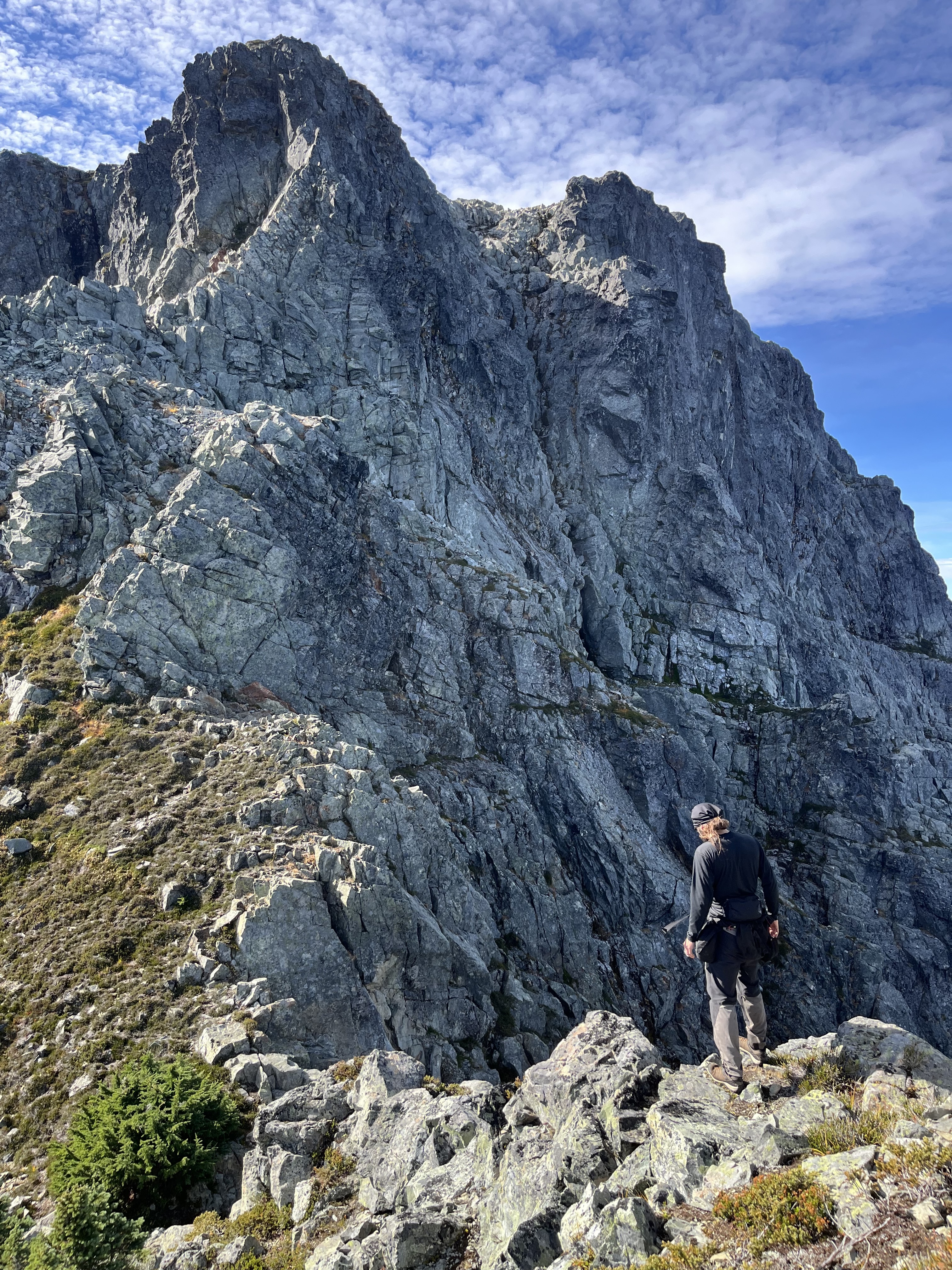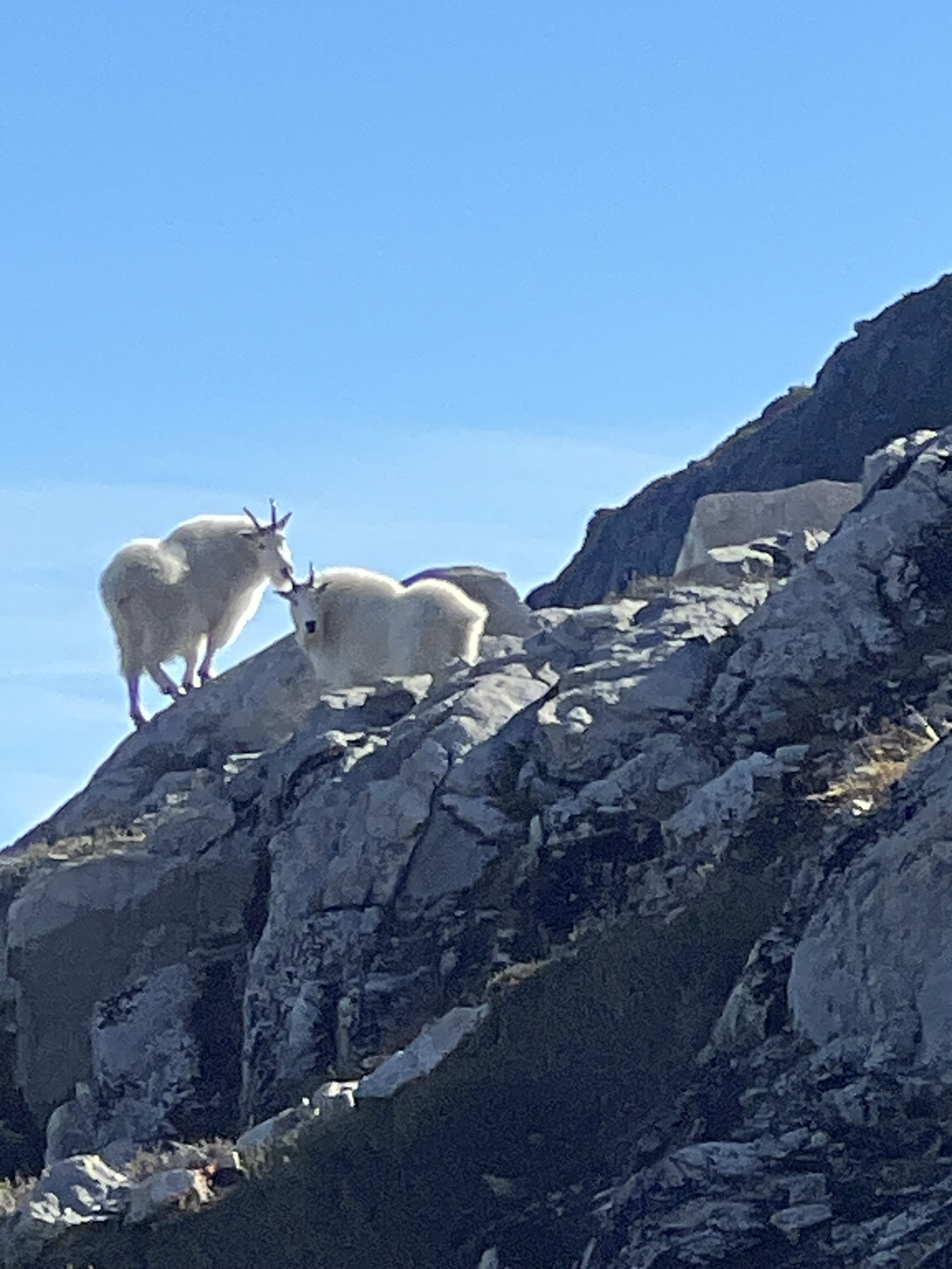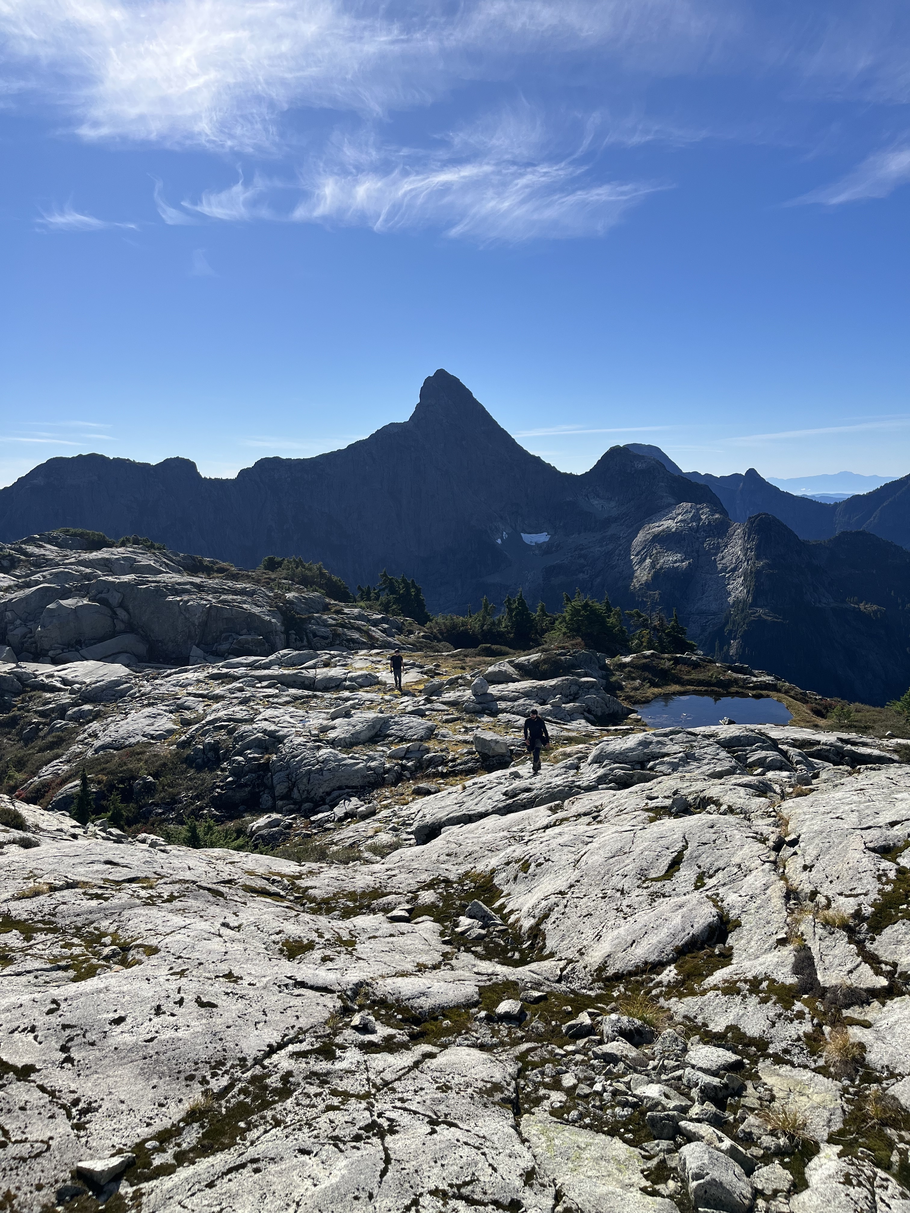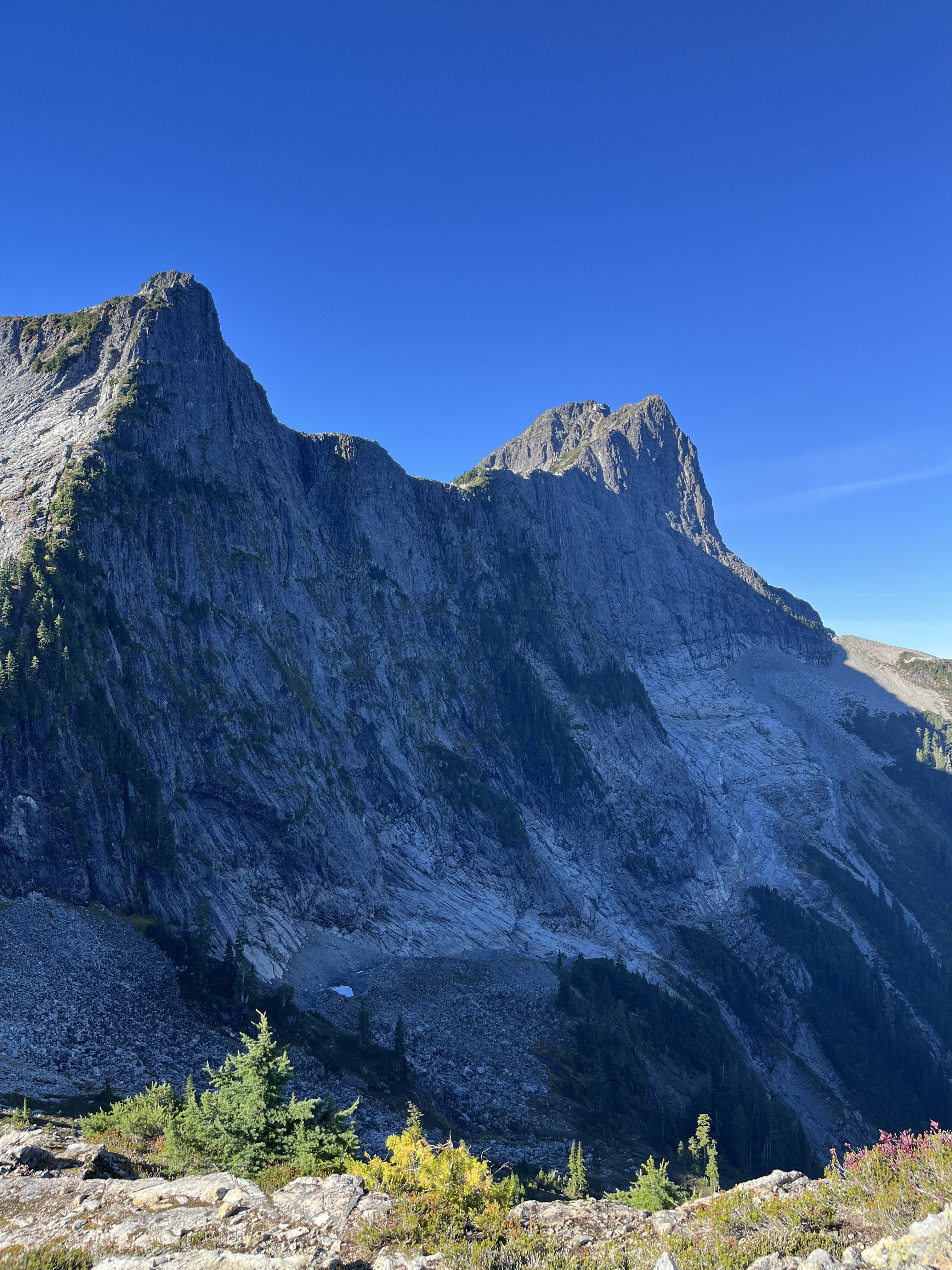 Matteo, Felix, and I started our hike from Dianne Main - a deactivated FSR 15mins past climbers camp in the Eldred valley. We parked at the river crossing and begun shwacking our way up the old road. Nearly 1.5 hours later we reached a patch of old growth that would lend us easy passage into the forest. For the next few hours we trended left in the steep woods navigating several cliff bands as they came until we crested a col in the sub alpine. From here we bushwhacked up and over 3 insignificant bumps along the ridge and dropped into a bowl just Northeast of Baldys east ridge. We then got very lucky here and ran into two mountain goats very close to us. After a quick photoshoot with the goats. We crested the ridge at the first chance we could and started walking towards the peak. We shortly gained the false summit without much difficulty and headed for the summit. After the false summit, we slid down a scree ramp and crossed a heather ledge which led to an easy scramble to the summit. The day was clear and the views were sublime, we could even see Waddington!!! After a long lunch break we reversed everything we did until we got to the forest. We took a higher line trending left up and over all the cliff bands which saved us lots of time. We made it back to the car in just under 13 hours. Great day out.