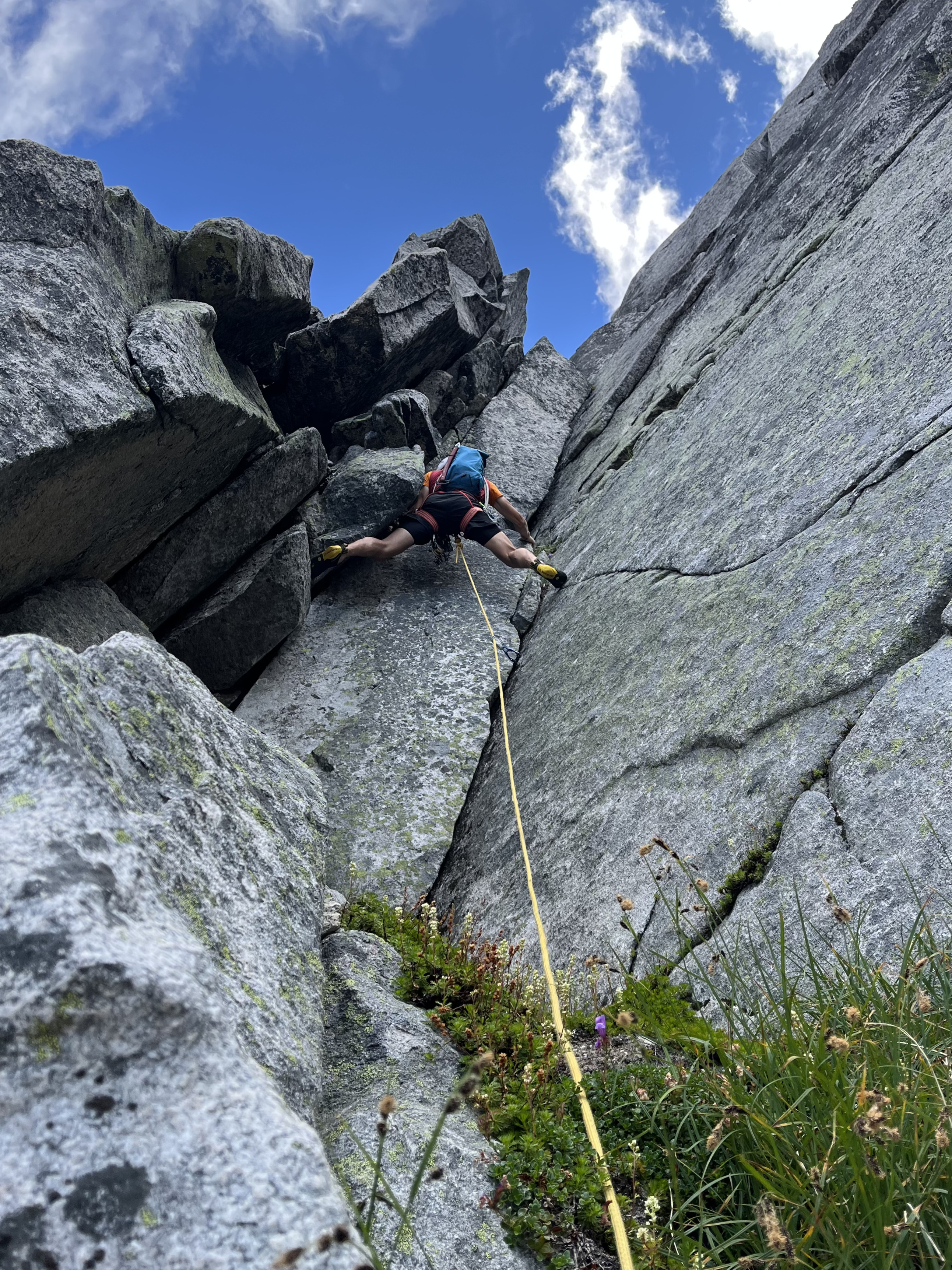 From the summit, we descended south towards the notch below the Pillar of Pi. We initially followed the gulley adjacent to the ridge with one short rappel, then cut over to the ridge and made one more short rappel off a tree at the bottom.