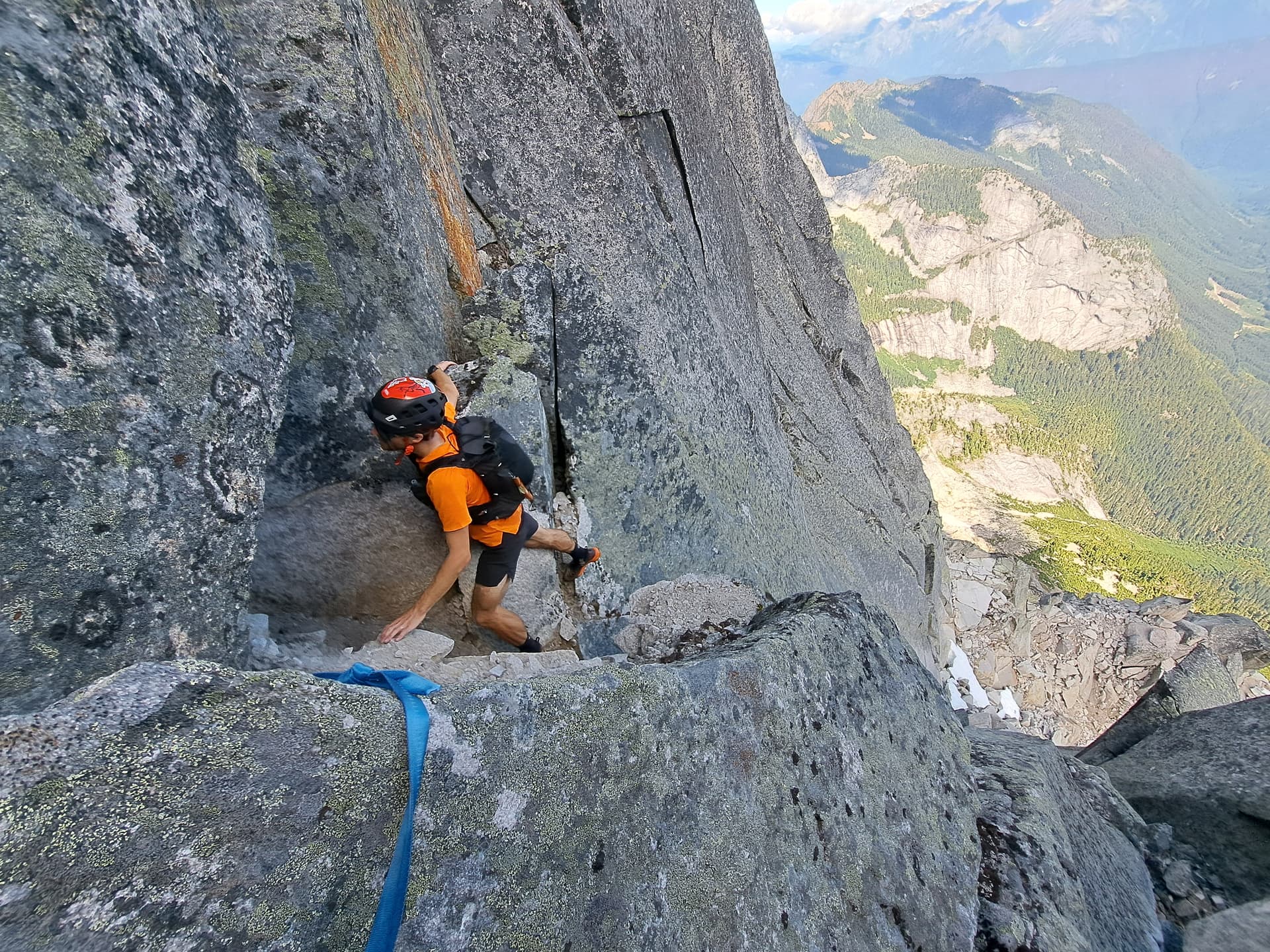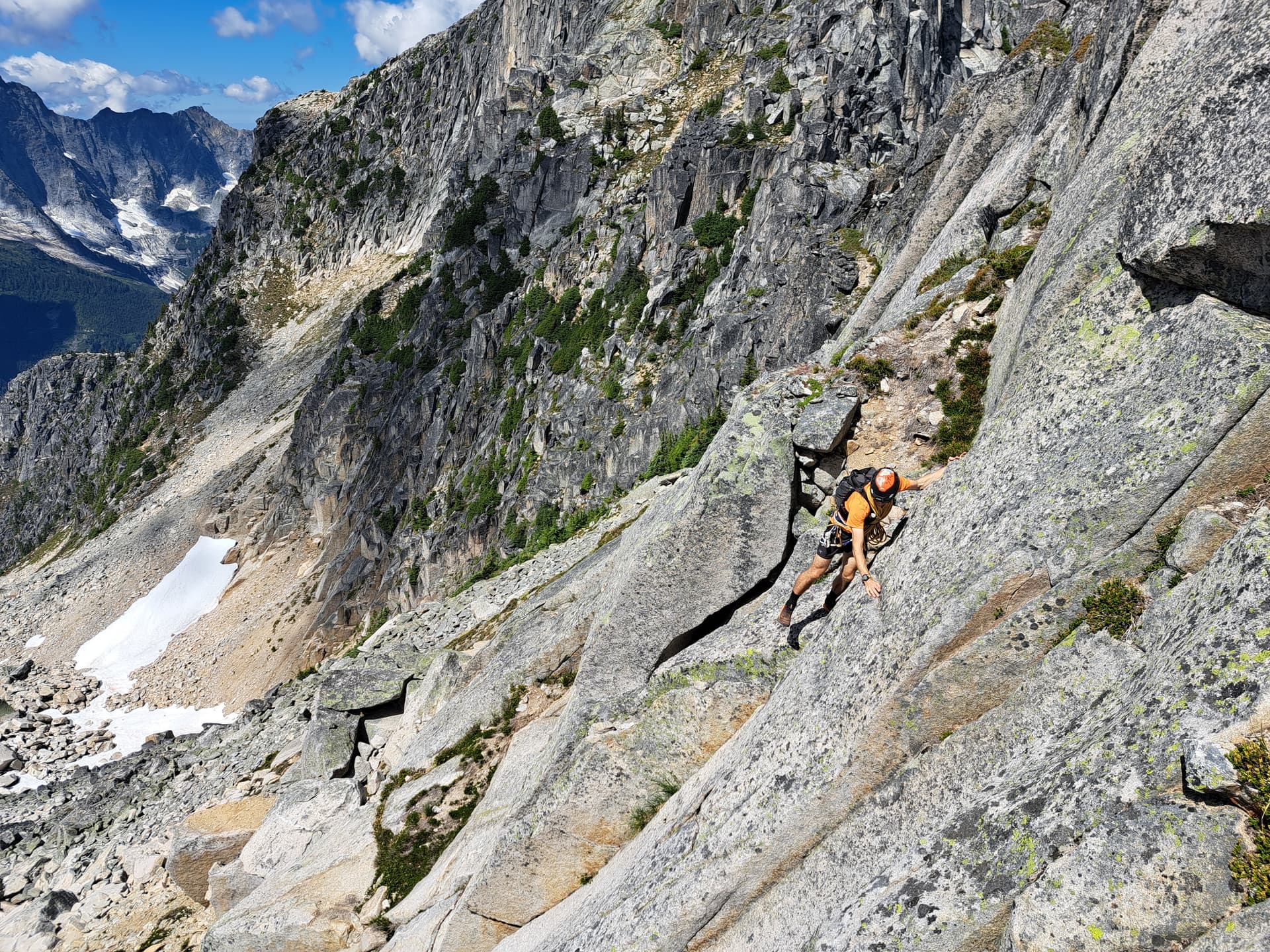 In retrospect, this may be where the first ascentionists rappelled 60 feet off the east side as described in the Culbert guide. I suspect that Kobus may have climbed one of the corners further right. In any event, we rappelled back down what we had just climbed and then did a long pitch of simul-climbing up and right to gain the ridge just below the South Peak of Rexford.