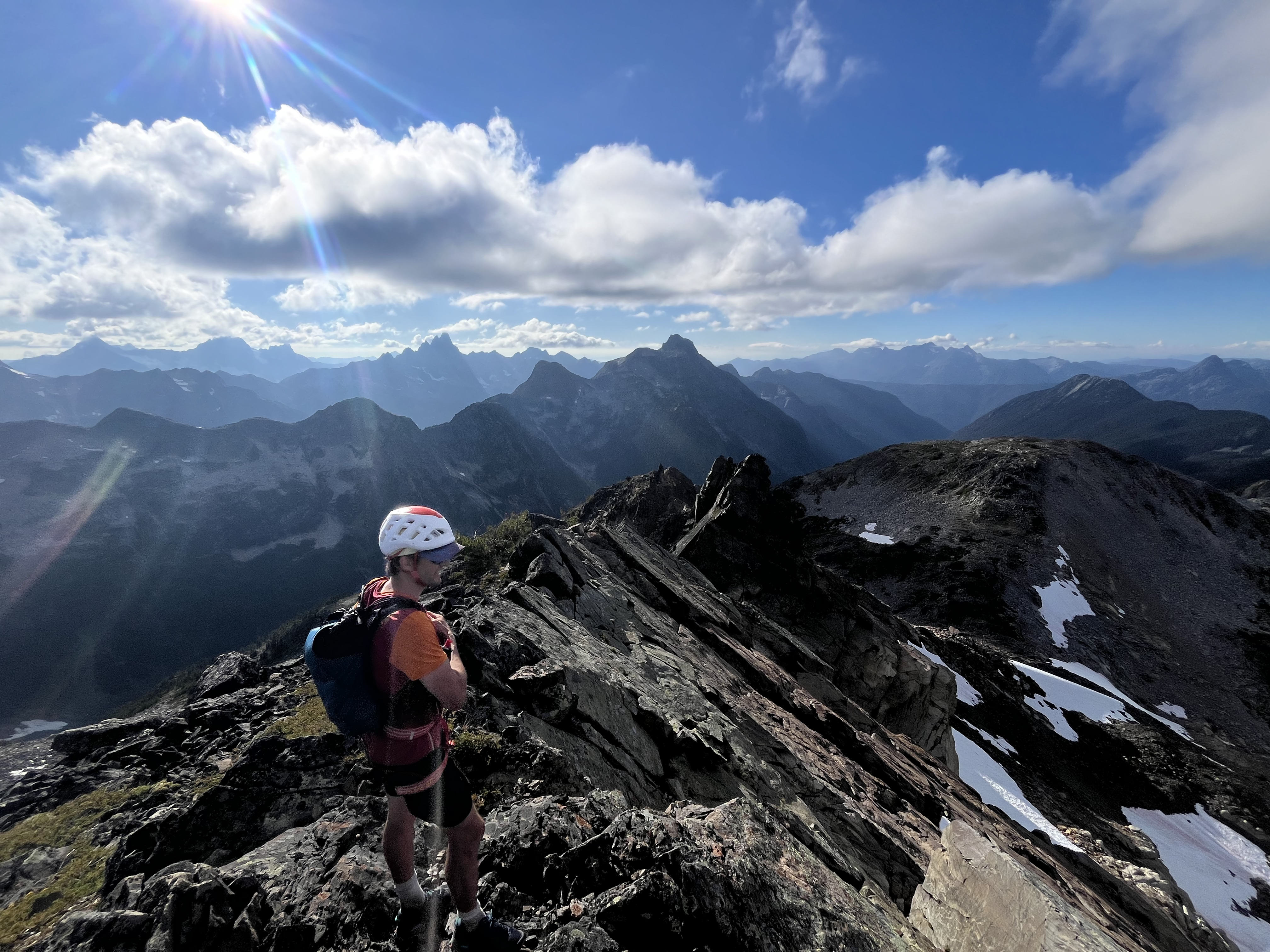A few years ago, Jessie and I traversed from North Illusion Peak to Mt. Rexford, starting with the Northeast Buttress of North Illusion (a great route deserving of more attention) and descending Rexford’s Northeast Ridge. We were inspired in part by Kobus Barnard’s report in the 1993 CAJ ([Mount Rexford Traverse and Judge Howay South Face]) describing the first ascent of this traverse where they continued to Rexford’s South peak via the Pillar of Pi. Kobus also described their original intention of continuing all the way to Mt. Lindeman and exiting via the Radium Lake trail.