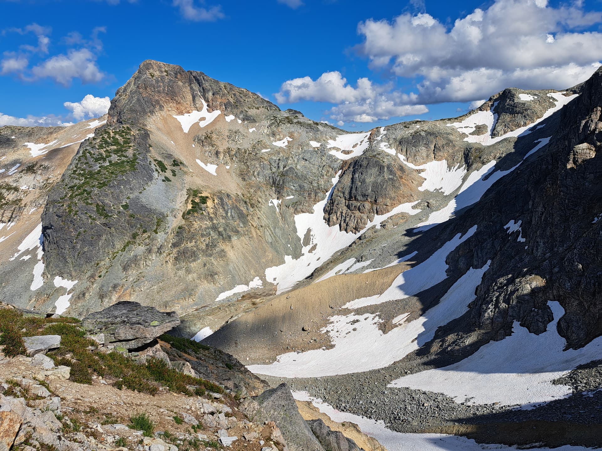 Once we had rounded the back of the horseshoe and started making our way north, the terrain generally became more efficient. From the summit of Middle Peak, we backtracked slightly and contoured on the east side to reach a snowslope to regain the ridge. Nice meadowy terrain on the crest then took us to Hanging Lake Peak.