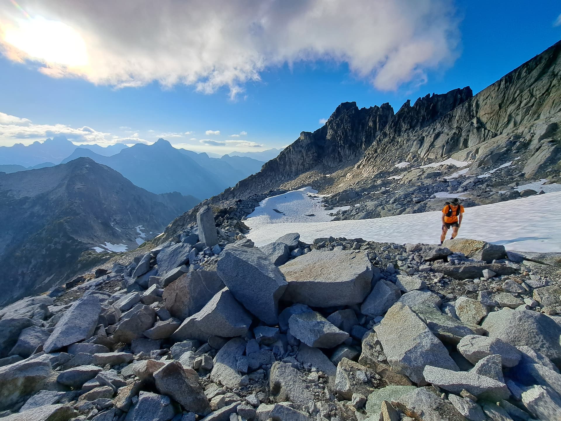 We scrambled up and over Hanging Lake Peak, descending some glacier polished slabs on the north side. We then contoured on the east side of the ridge to gain the col below Lindeman where there were a number of groups camping.