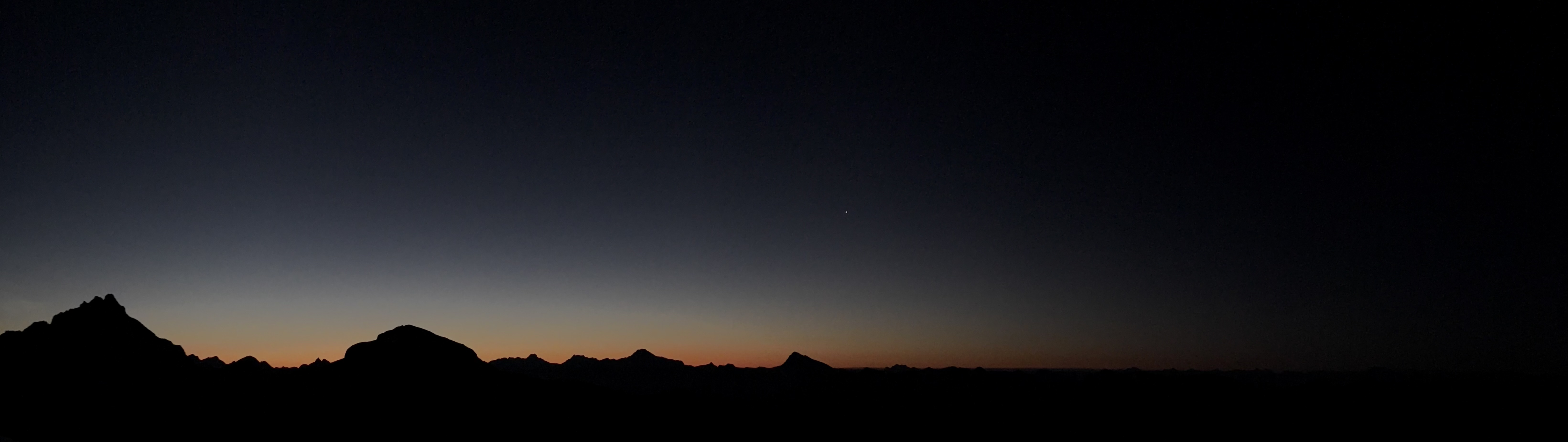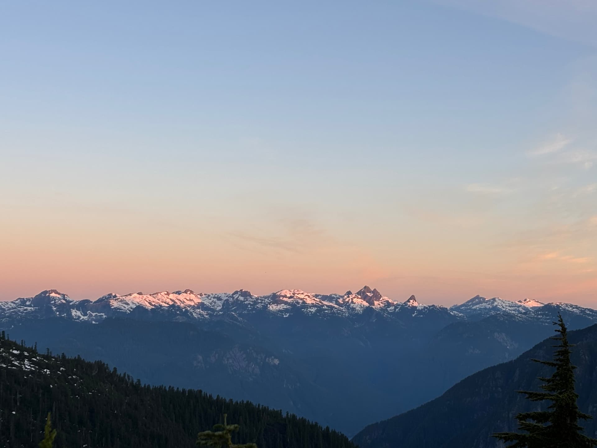 I randomly woke up and checked my watch- it was 1:30am. While sleep would have been nice, waking to a pristine starry night sky was worth it. Whenever I wake up at home in the middle of the night it sucks. Doing so here, I could gaze at the stars forever before finally drifting back off to sleep. We had a relatively leisurely morning. I awoke around 5am, lied in my sleeping bag watching the morning alpenglow over Robie Reid and the myriad of peaks to the E before breakfast, repacking, and heading out around 7:15am.