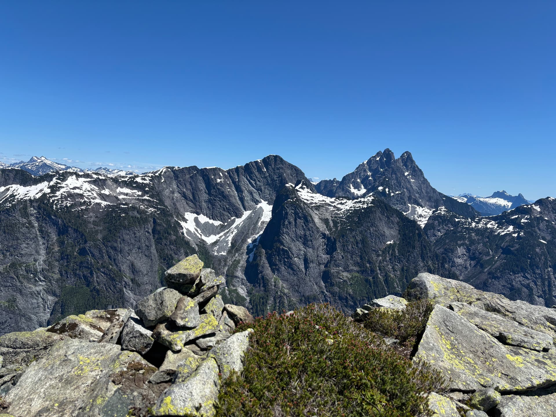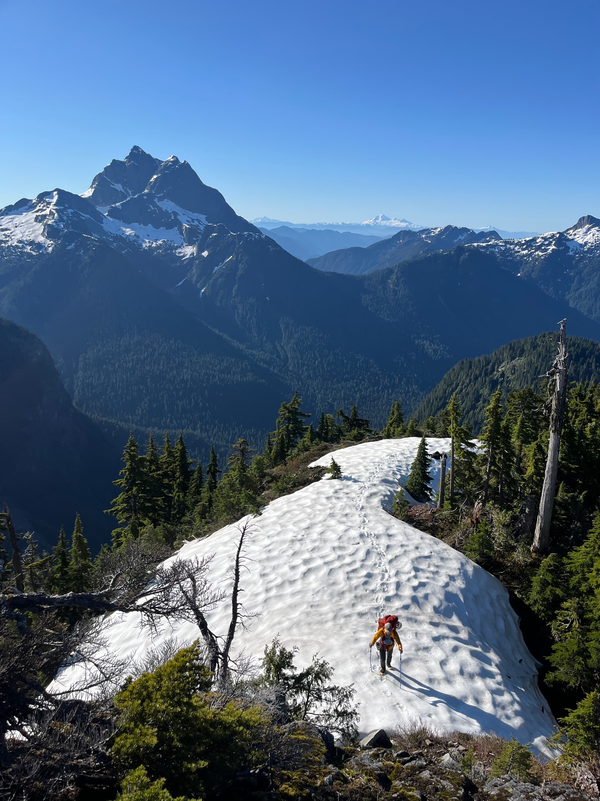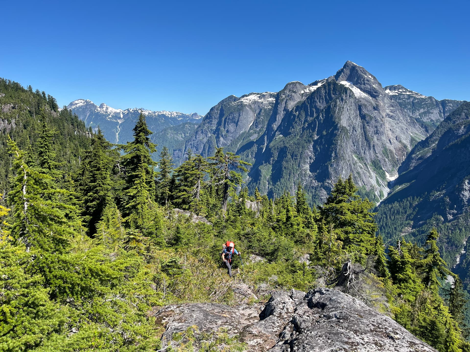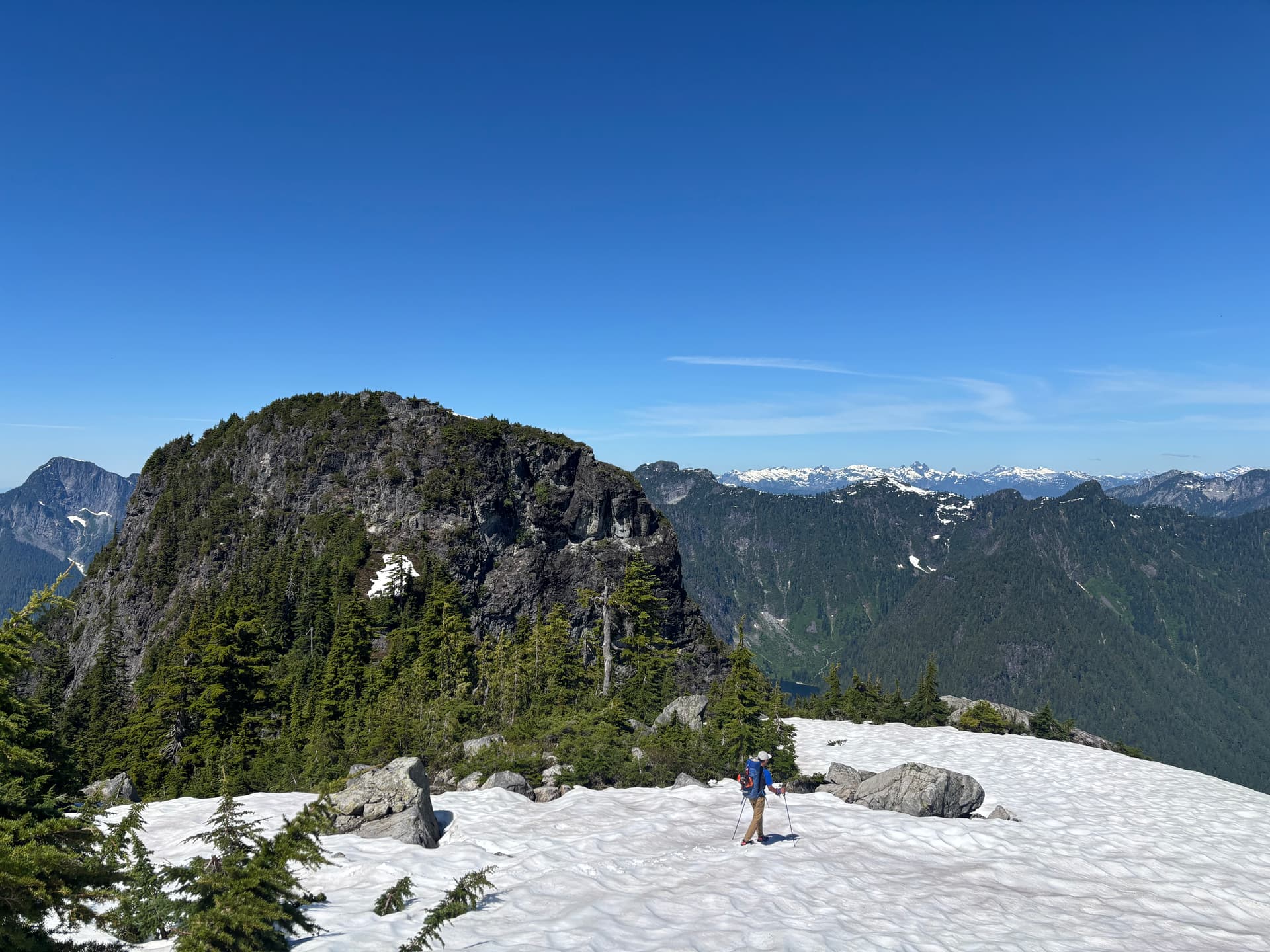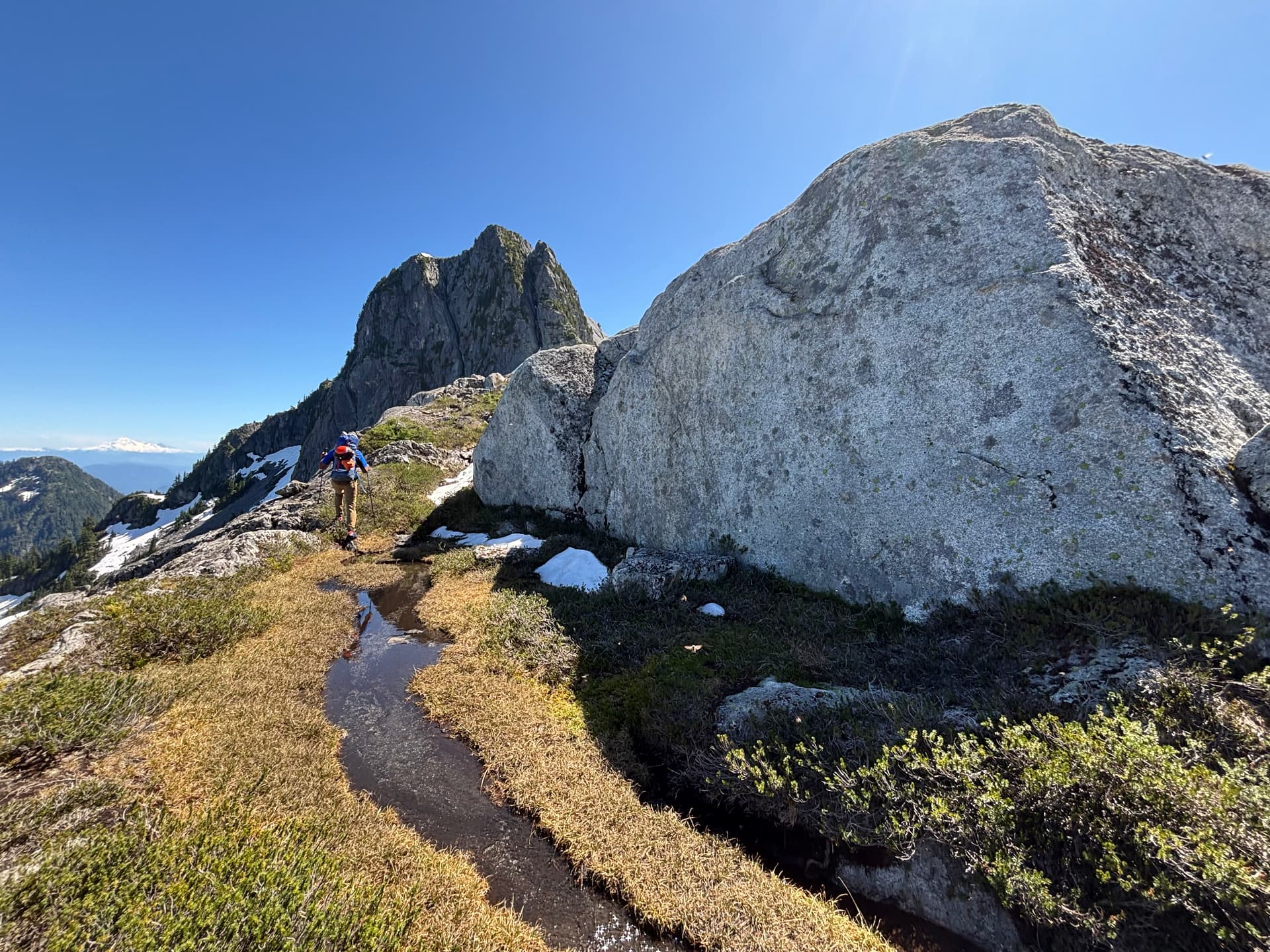 After that we had an uphill ridge-walk to the first unnamed prominent peak N of Robie Reid. Views opened up to Tingle Creek and Stave Lake once more. 2h later we reached the base of a small rocky pinnacle (the ‘Shark Fin’) we’d spied from camp. Of course, we had to scramble up! It took less than 5min of easy scrambling without packs to the top. We were treated to pretty cool views of the rocky peak ahead, as well as an impressively steep drop to the ravine below. I really like how this area looks with its solid perfectly grey granite interposed with the pines. There is something unique about the Upper Stave area. The rest of the way up to the peak was mostly straightforward with mixed bushwhacking, scrambling, and a bit of snow. We refilled water from a small stream formed by melting snow just below the summit. The summit area was nice- rocky and not just a boring bushy bump. It was a double peak, with the peak closer to Robie Reid being slightly shorter. We talked about calling it Mt Chris. I thought it was a pretty cool looking peak in a nice area, one that both Chris and I had spent a decent amount of time so it was a fitting name. I built a cairn, and after a short break we began our descent (this involves crossing over the shorter peak). From here our next goal was getting to the last prominent peak on the ridgeline before R Reid.