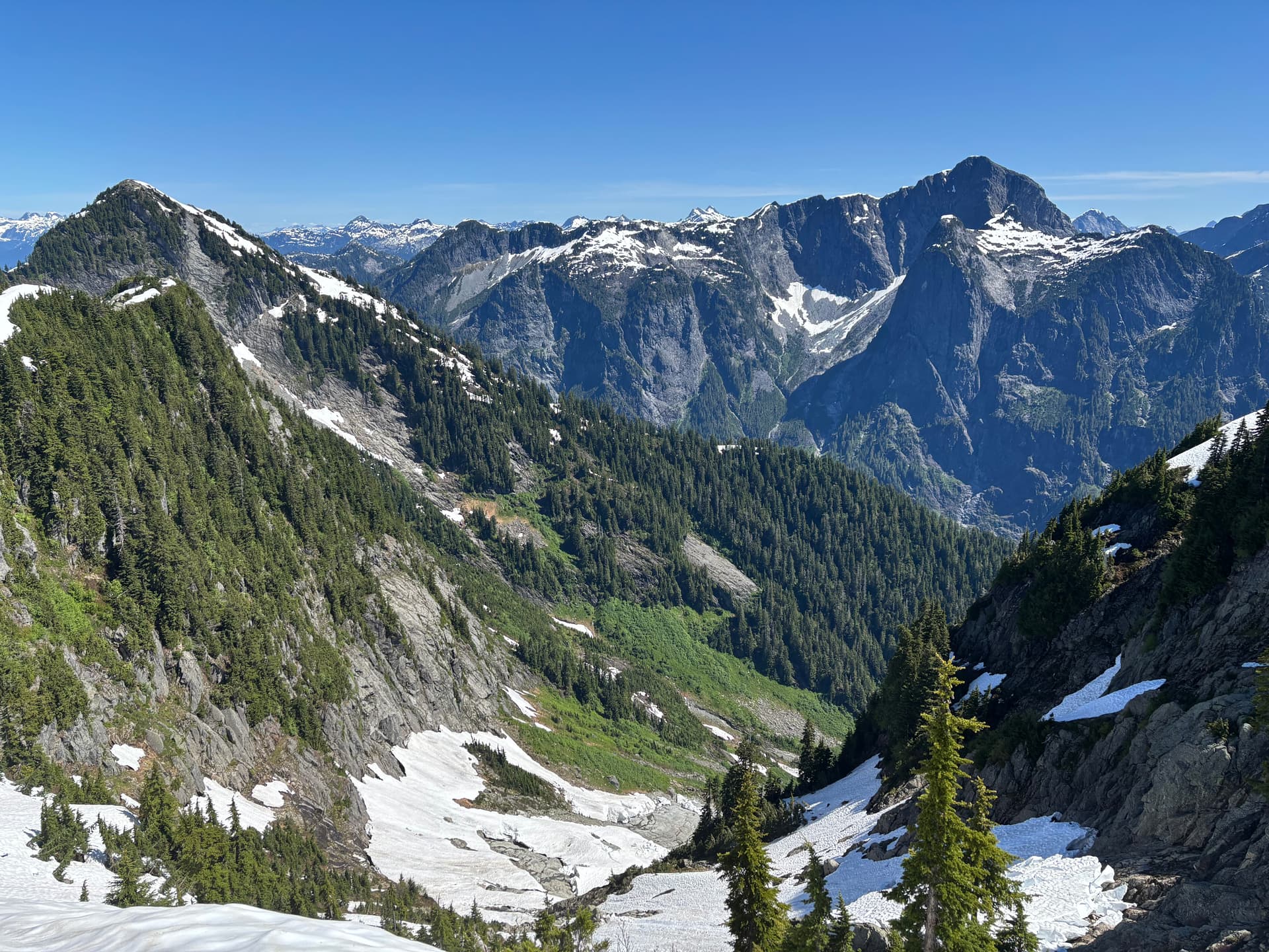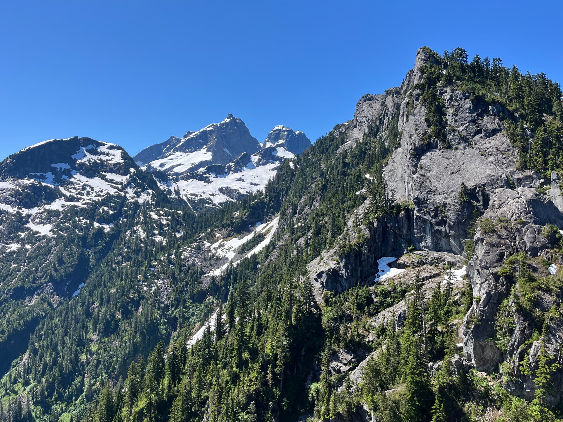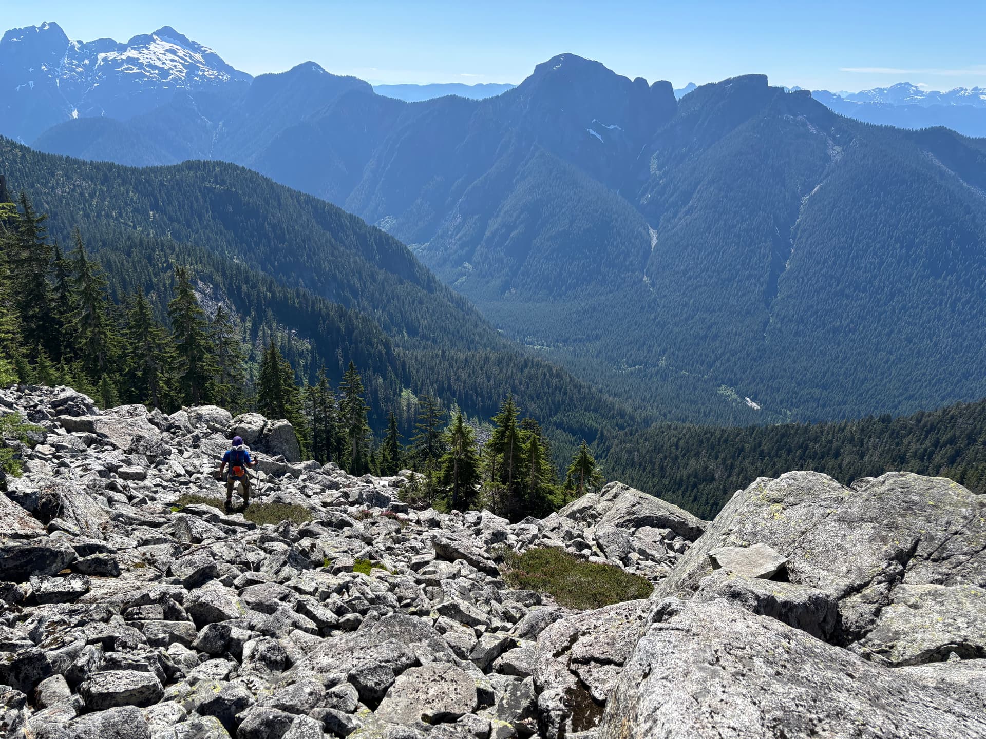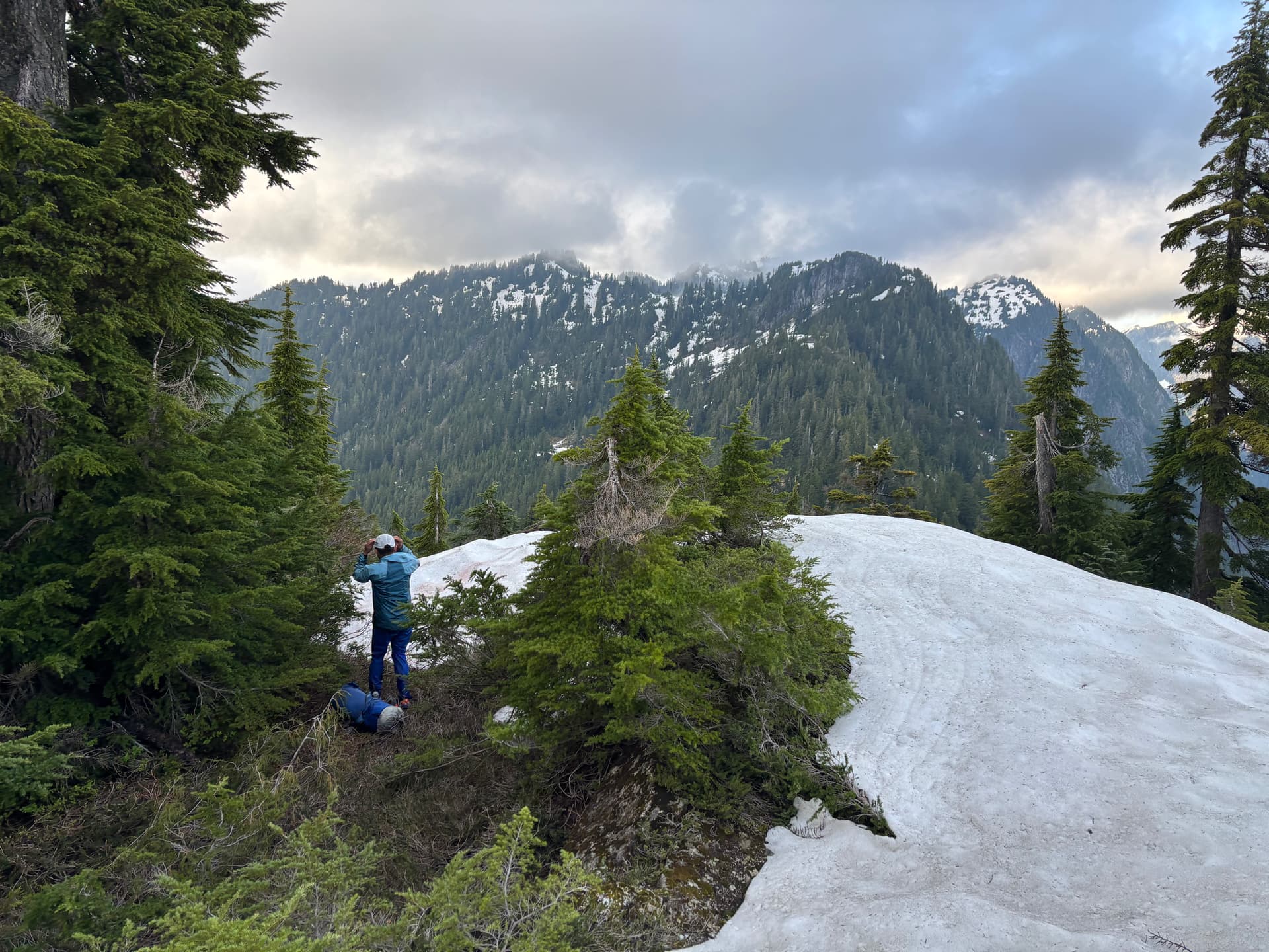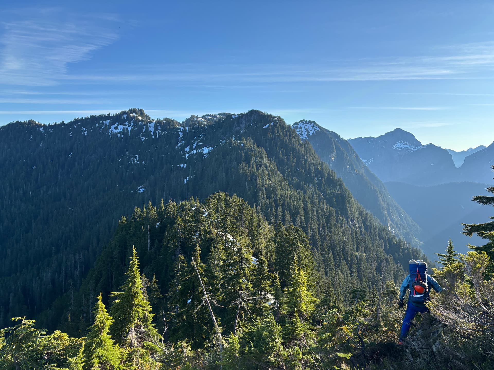 After that we had an uphill ridge-walk to the first unnamed prominent peak N of Robie Reid. Views opened up to Tingle Creek and Stave Lake once more. 2h later we reached the base of a small rocky pinnacle (the ‘Shark Fin’) we’d spied from camp. Of course, we had to scramble up! It took less than 5min of easy scrambling without packs to the top. We were treated to pretty cool views of the rocky peak ahead, as well as an impressively steep drop to the ravine below. I really like how this area looks with its solid perfectly grey granite interposed with the pines. There is something unique about the Upper Stave area. The rest of the way up to the peak was mostly straightforward with mixed bushwhacking, scrambling, and a bit of snow. We refilled water from a small stream formed by melting snow just below the summit. The summit area was nice- rocky and not just a boring bushy bump. It was a double peak, with the peak closer to Robie Reid being slightly shorter. We talked about calling it Mt Chris. I thought it was a pretty cool looking peak in a nice area, one that both Chris and I had spent a decent amount of time so it was a fitting name. I built a cairn, and after a short break we began our descent (this involves crossing over the shorter peak). From here our next goal was getting to the last prominent peak on the ridgeline before R Reid.