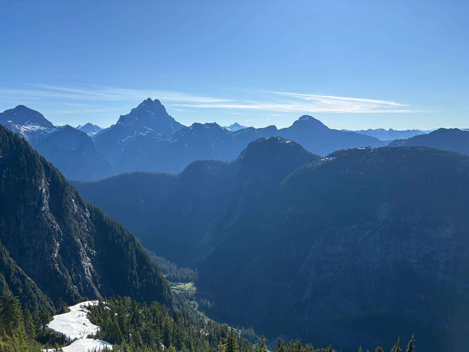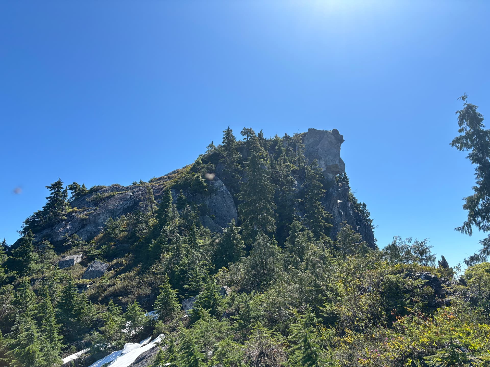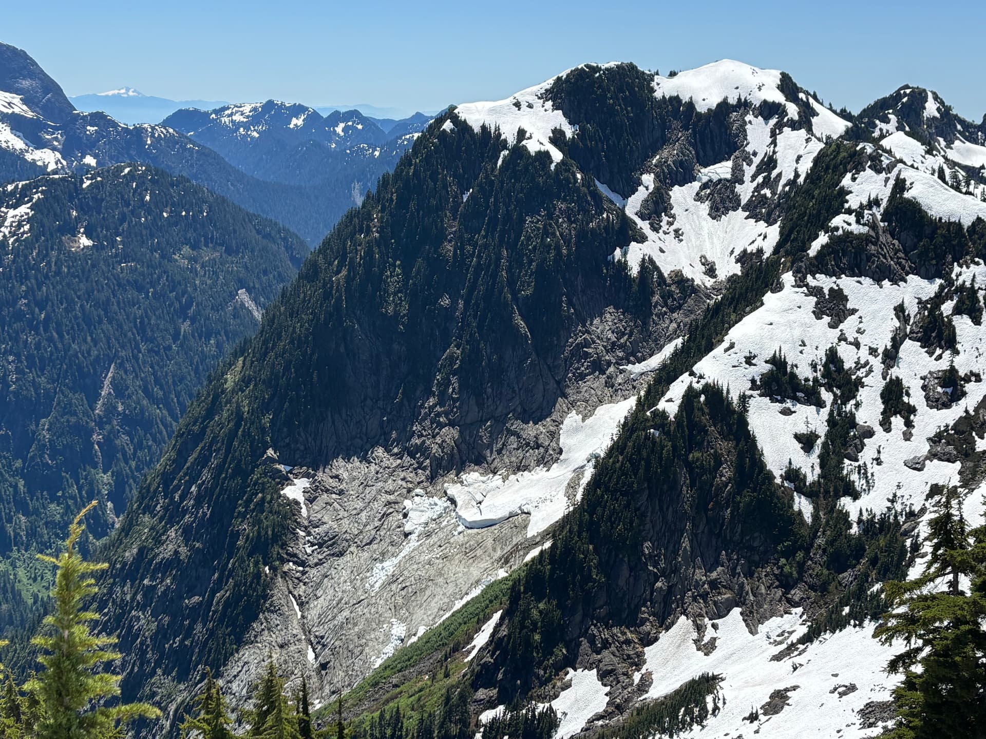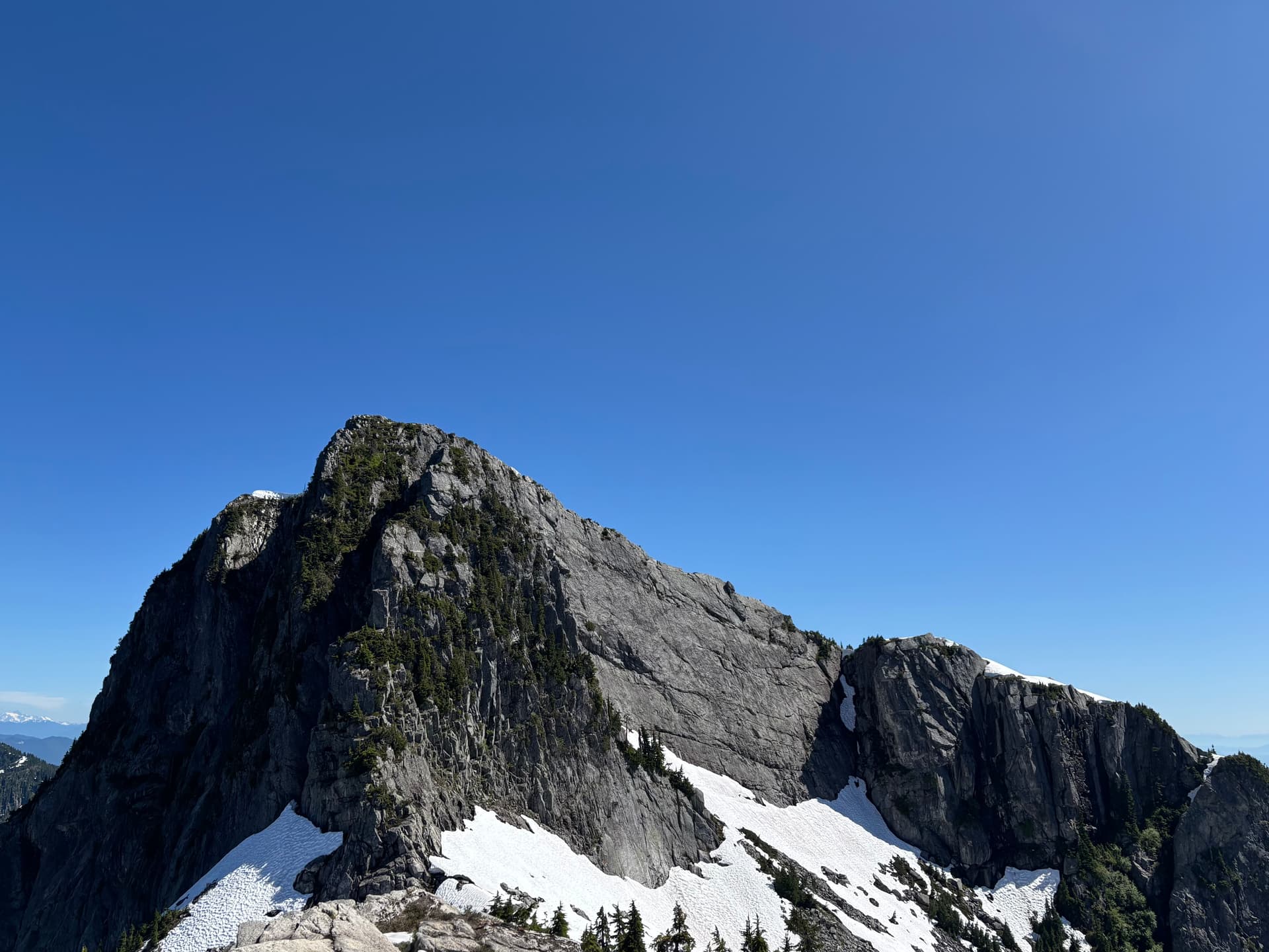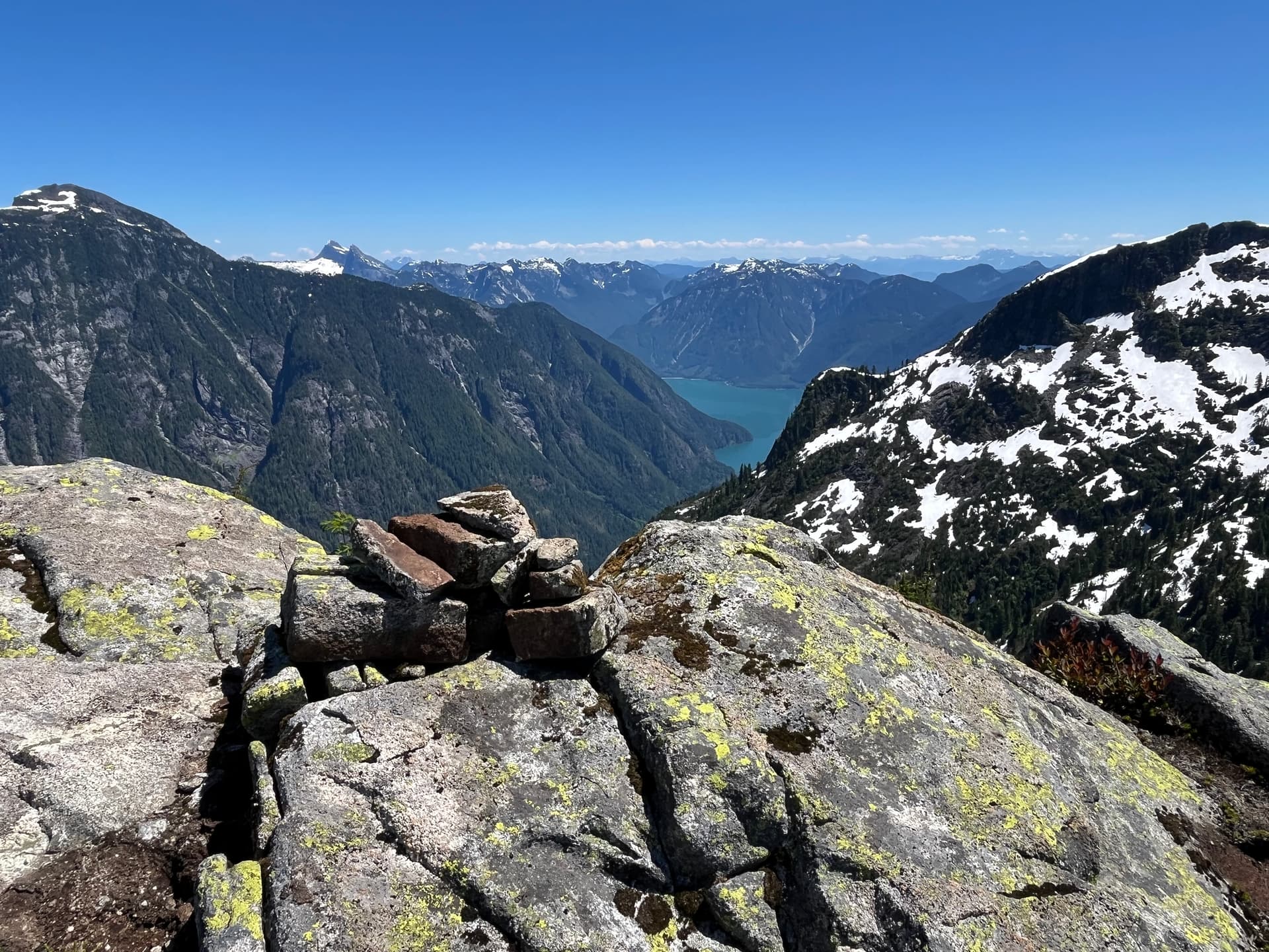 After that we had an uphill ridge-walk to the first unnamed prominent peak N of Robie Reid. Views opened up to Tingle Creek and Stave Lake once more. 2h later we reached the base of a small rocky pinnacle (the ‘Shark Fin’) we’d spied from camp. Of course, we had to scramble up! It took less than 5min of easy scrambling without packs to the top. We were treated to pretty cool views of the rocky peak ahead, as well as an impressively steep drop to the ravine below. I really like how this area looks with its solid perfectly grey granite interposed with the pines. There is something unique about the Upper Stave area. The rest of the way up to the peak was mostly straightforward with mixed bushwhacking, scrambling, and a bit of snow. We refilled water from a small stream formed by melting snow just below the summit. The summit area was nice- rocky and not just a boring bushy bump. It was a double peak, with the peak closer to Robie Reid being slightly shorter. We talked about calling it Mt Chris. I thought it was a pretty cool looking peak in a nice area, one that both Chris and I had spent a decent amount of time so it was a fitting name. I built a cairn, and after a short break we began our descent (this involves crossing over the shorter peak). From here our next goal was getting to the last prominent peak on the ridgeline before R Reid.