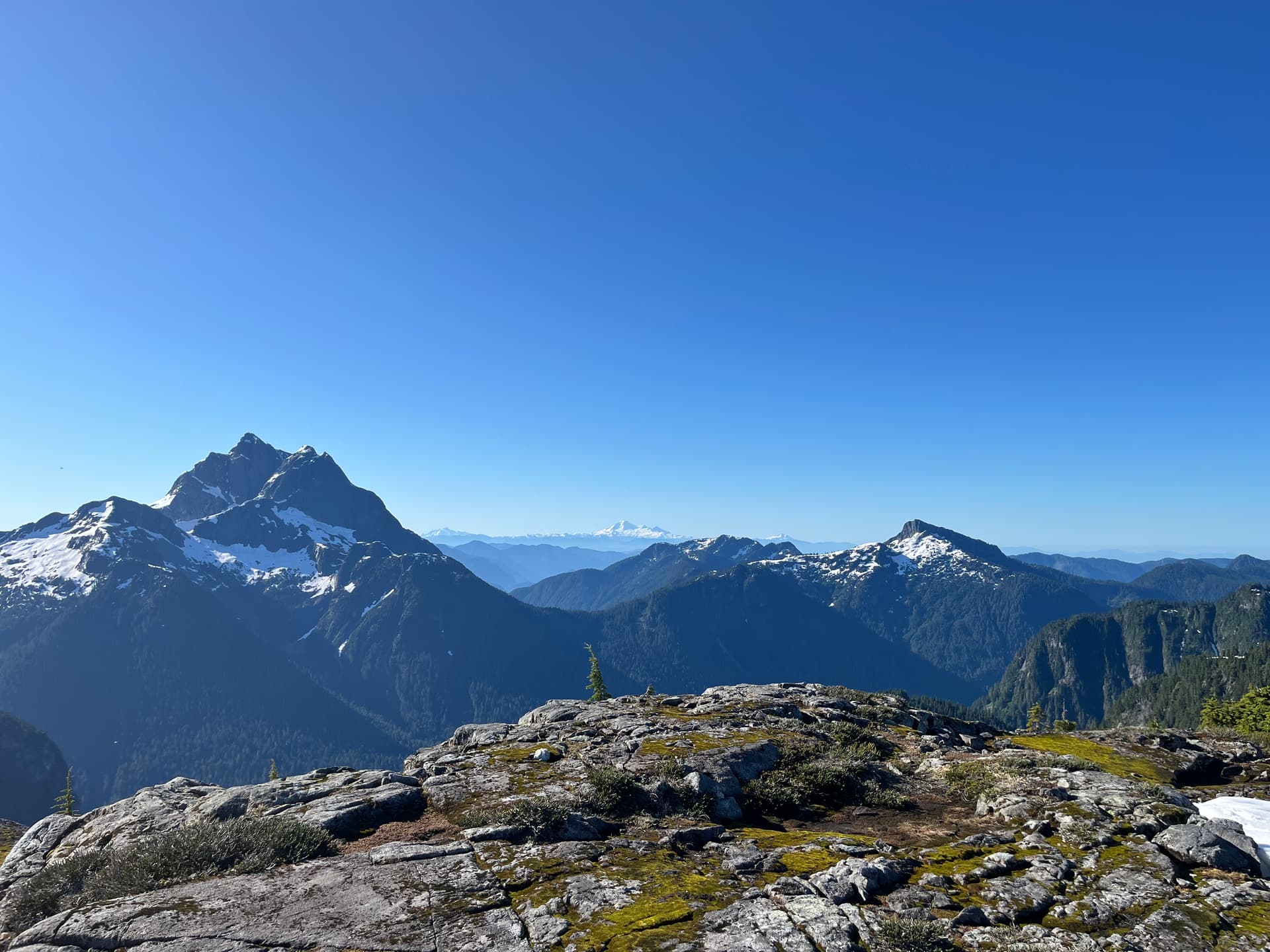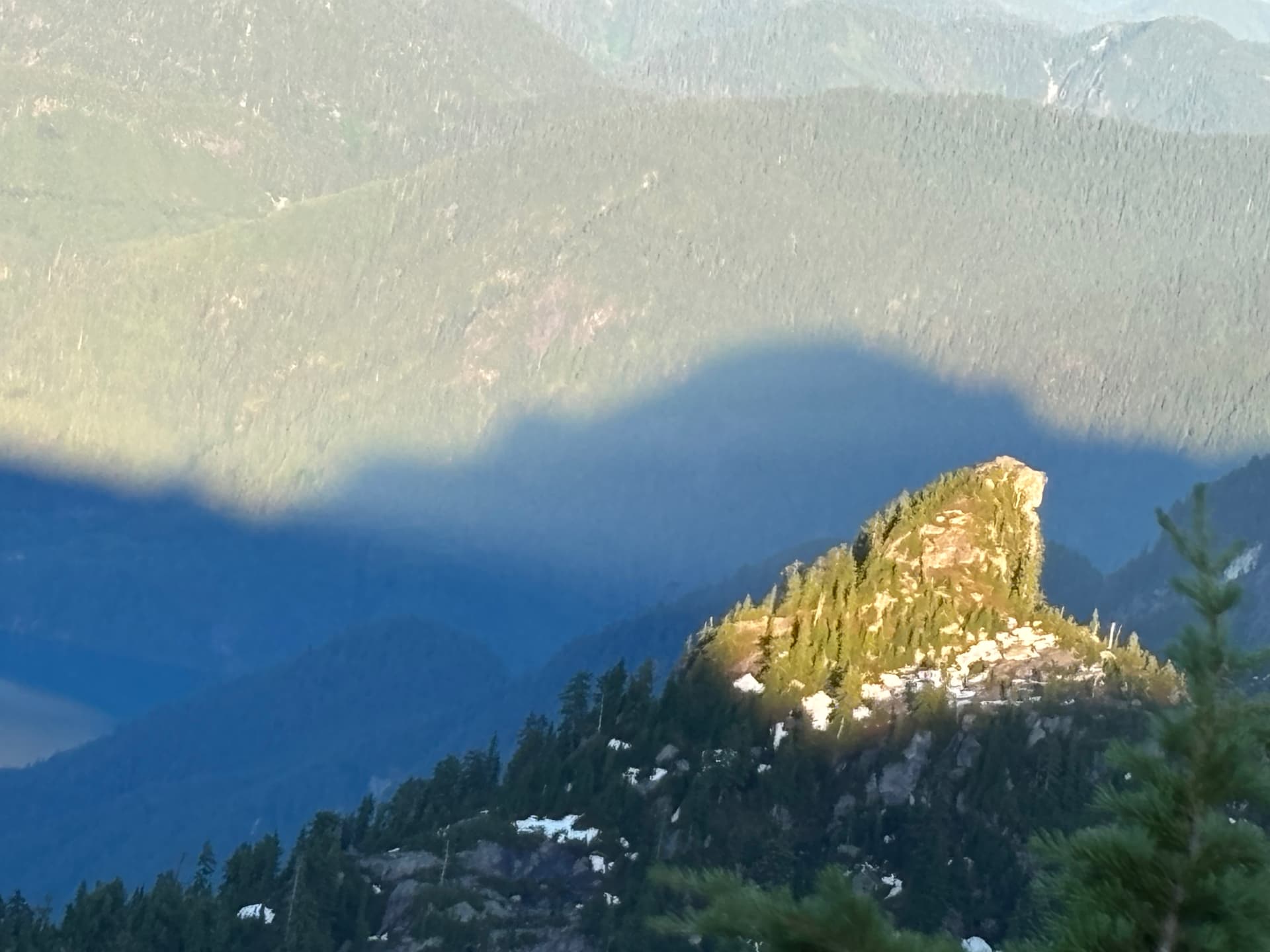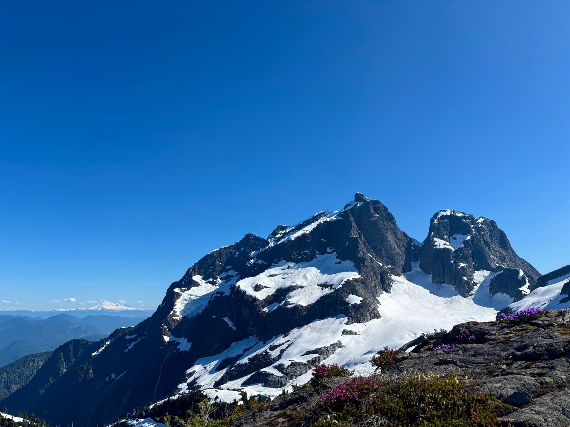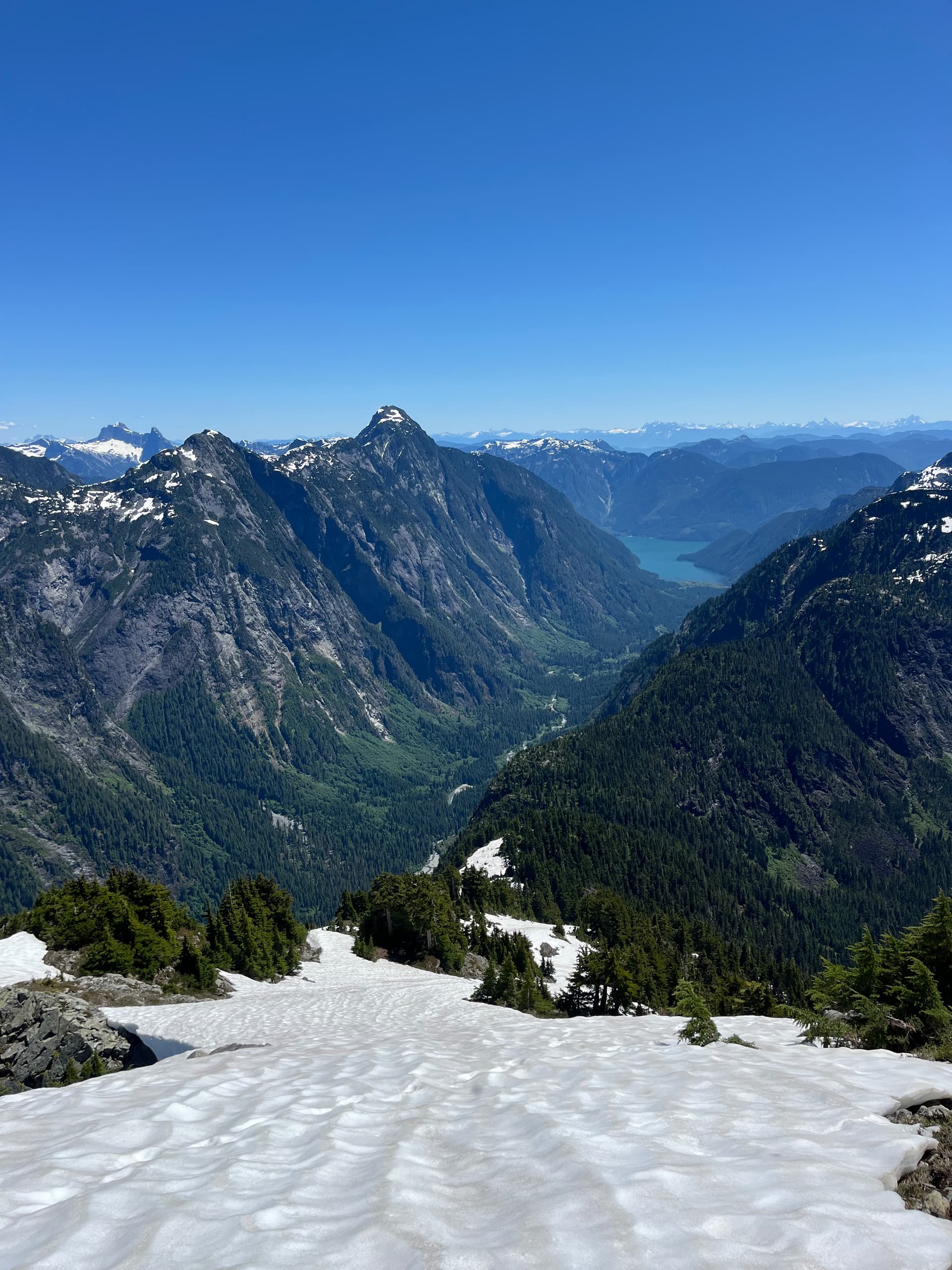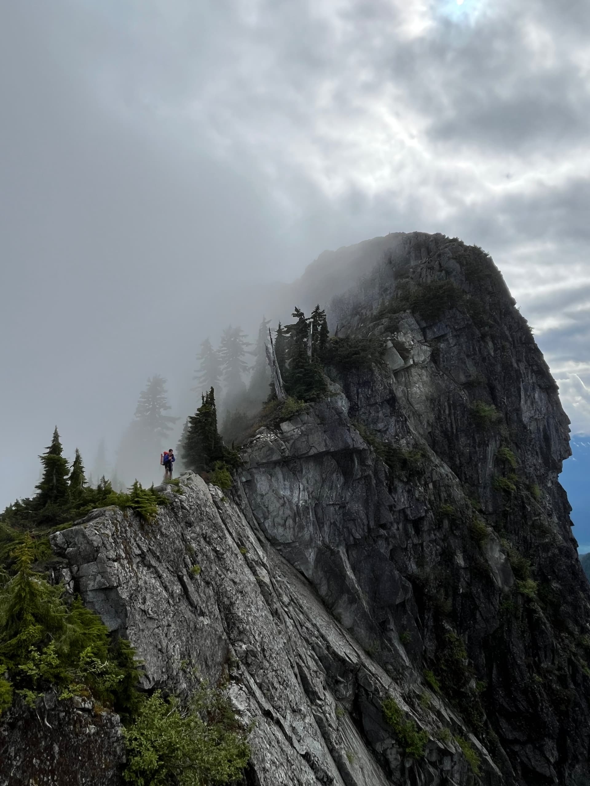 After that we had an uphill ridge-walk to the first unnamed prominent peak N of Robie Reid. Views opened up to Tingle Creek and Stave Lake once more. 2h later we reached the base of a small rocky pinnacle (the ‘Shark Fin’) we’d spied from camp. Of course, we had to scramble up! It took less than 5min of easy scrambling without packs to the top. We were treated to pretty cool views of the rocky peak ahead, as well as an impressively steep drop to the ravine below. I really like how this area looks with its solid perfectly grey granite interposed with the pines. There is something unique about the Upper Stave area. The rest of the way up to the peak was mostly straightforward with mixed bushwhacking, scrambling, and a bit of snow. We refilled water from a small stream formed by melting snow just below the summit. The summit area was nice- rocky and not just a boring bushy bump. It was a double peak, with the peak closer to Robie Reid being slightly shorter. We talked about calling it Mt Chris. I thought it was a pretty cool looking peak in a nice area, one that both Chris and I had spent a decent amount of time so it was a fitting name. I built a cairn, and after a short break we began our descent (this involves crossing over the shorter peak). From here our next goal was getting to the last prominent peak on the ridgeline before R Reid.