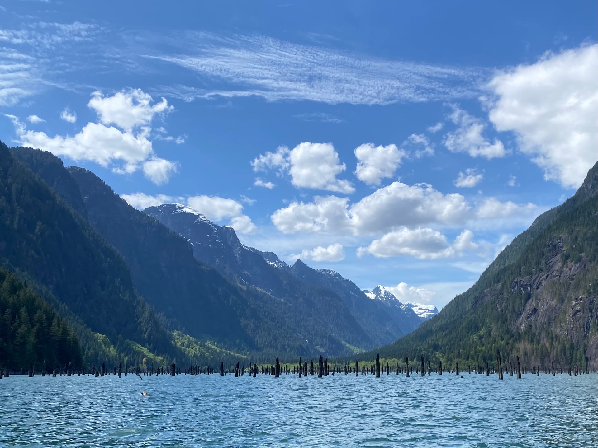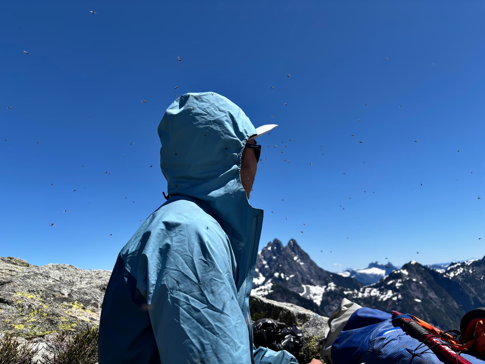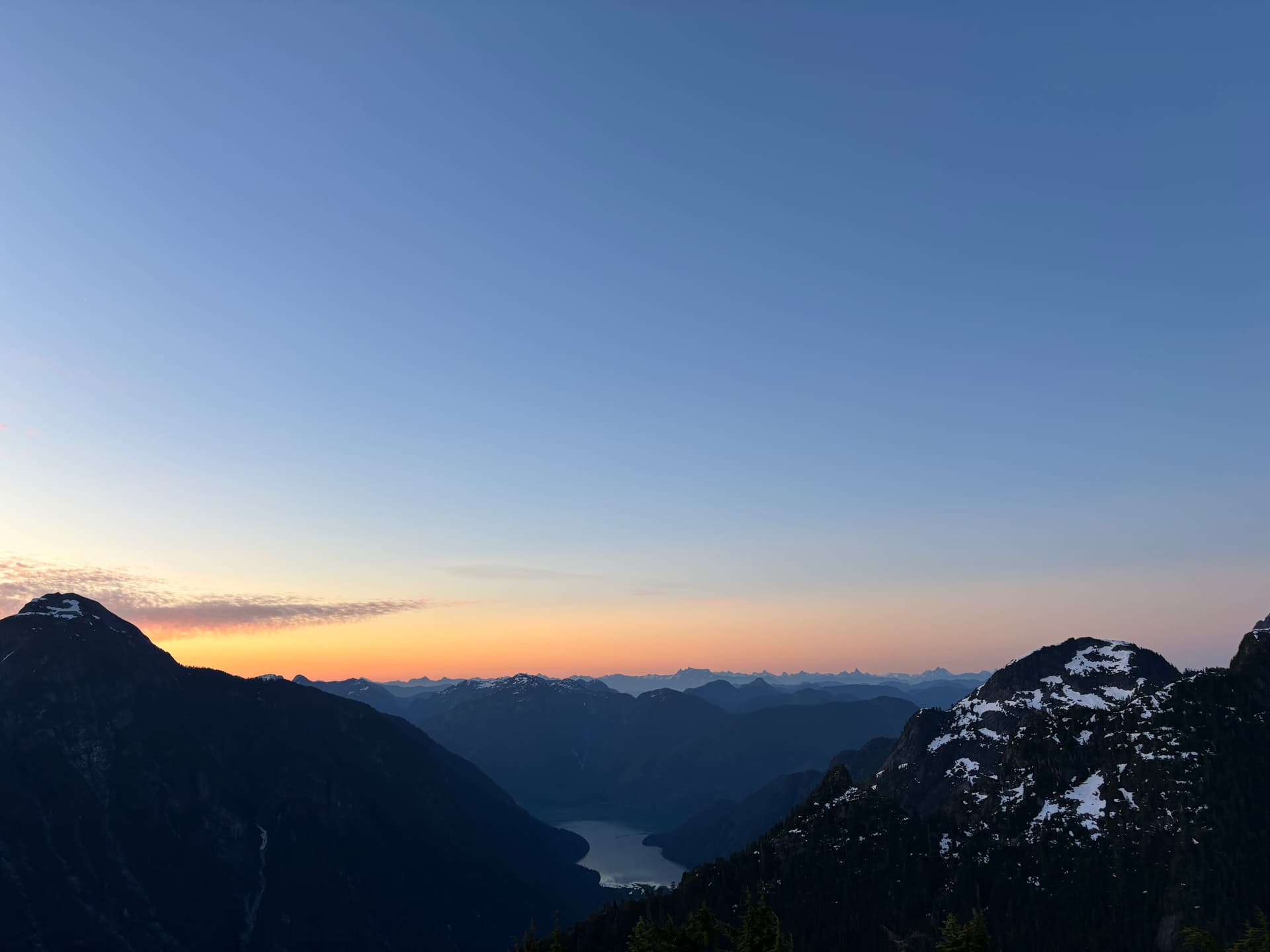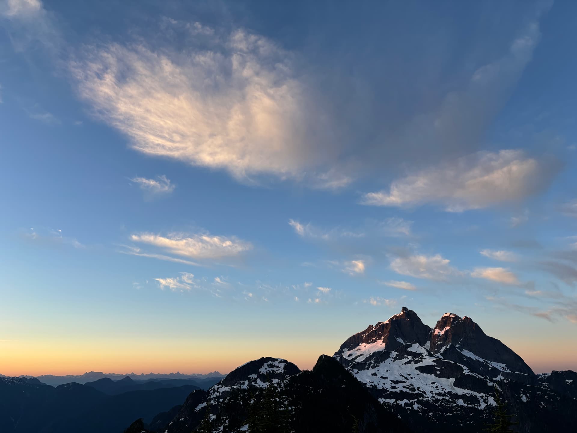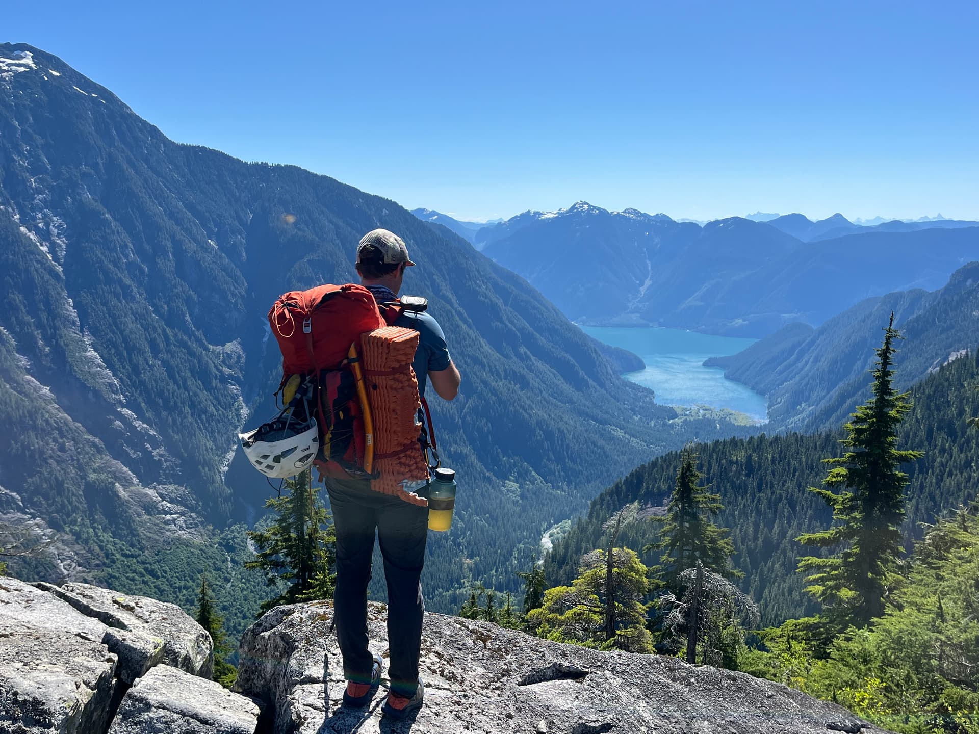 After that we had an uphill ridge-walk to the first unnamed prominent peak N of Robie Reid. Views opened up to Tingle Creek and Stave Lake once more. 2h later we reached the base of a small rocky pinnacle (the ‘Shark Fin’) we’d spied from camp. Of course, we had to scramble up! It took less than 5min of easy scrambling without packs to the top. We were treated to pretty cool views of the rocky peak ahead, as well as an impressively steep drop to the ravine below. I really like how this area looks with its solid perfectly grey granite interposed with the pines. There is something unique about the Upper Stave area. The rest of the way up to the peak was mostly straightforward with mixed bushwhacking, scrambling, and a bit of snow. We refilled water from a small stream formed by melting snow just below the summit. The summit area was nice- rocky and not just a boring bushy bump. It was a double peak, with the peak closer to Robie Reid being slightly shorter. We talked about calling it Mt Chris. I thought it was a pretty cool looking peak in a nice area, one that both Chris and I had spent a decent amount of time so it was a fitting name. I built a cairn, and after a short break we began our descent (this involves crossing over the shorter peak). From here our next goal was getting to the last prominent peak on the ridgeline before R Reid.