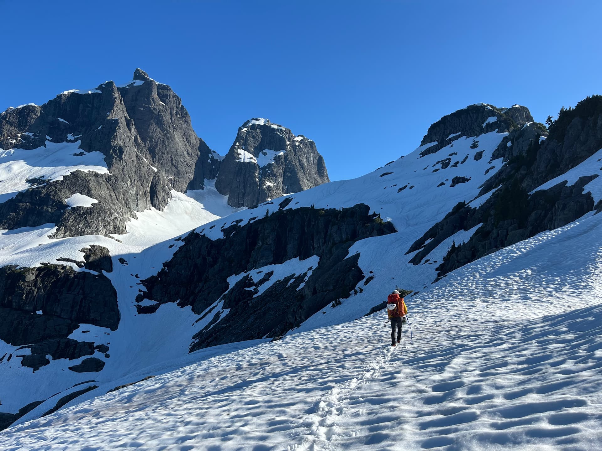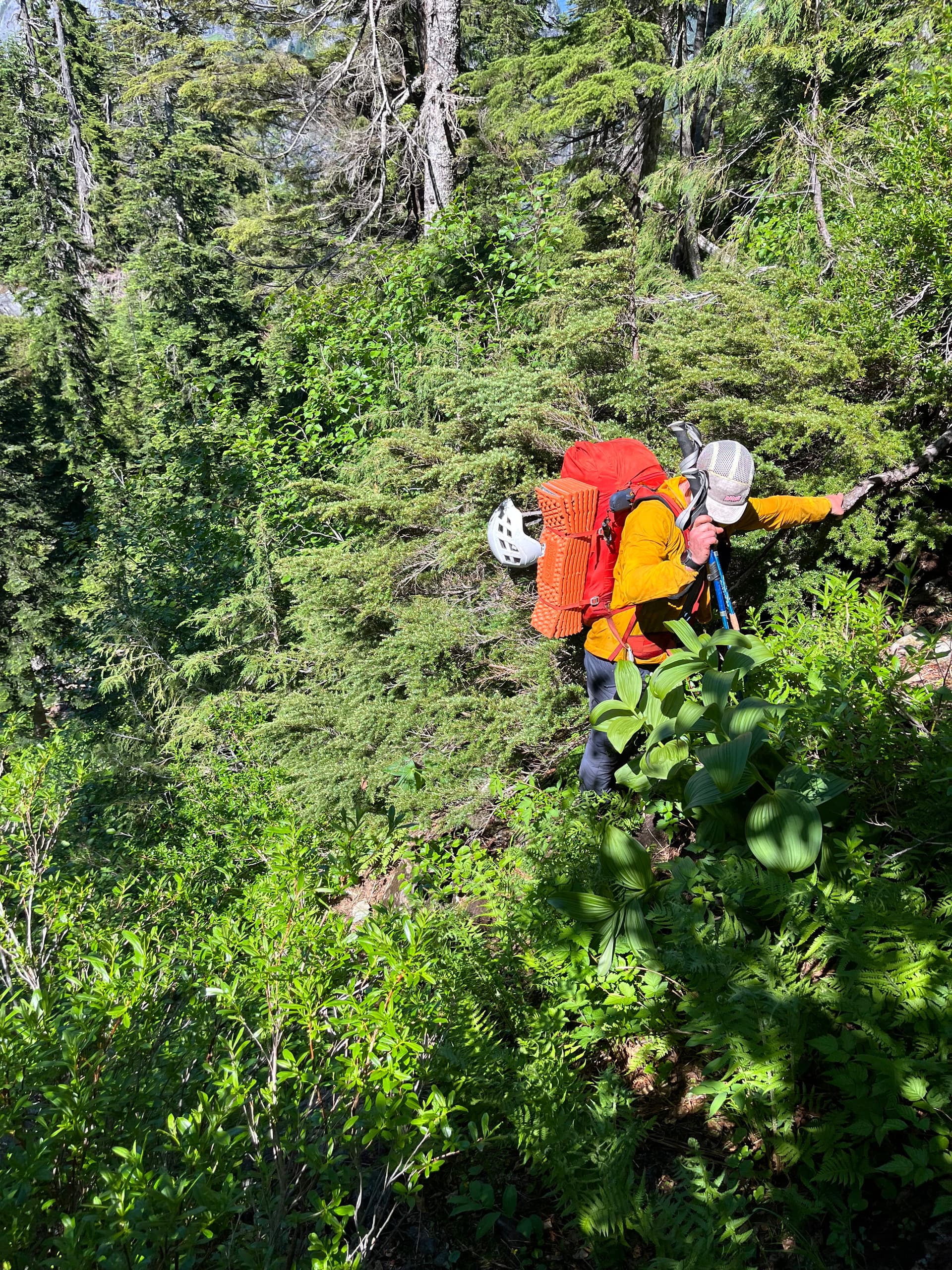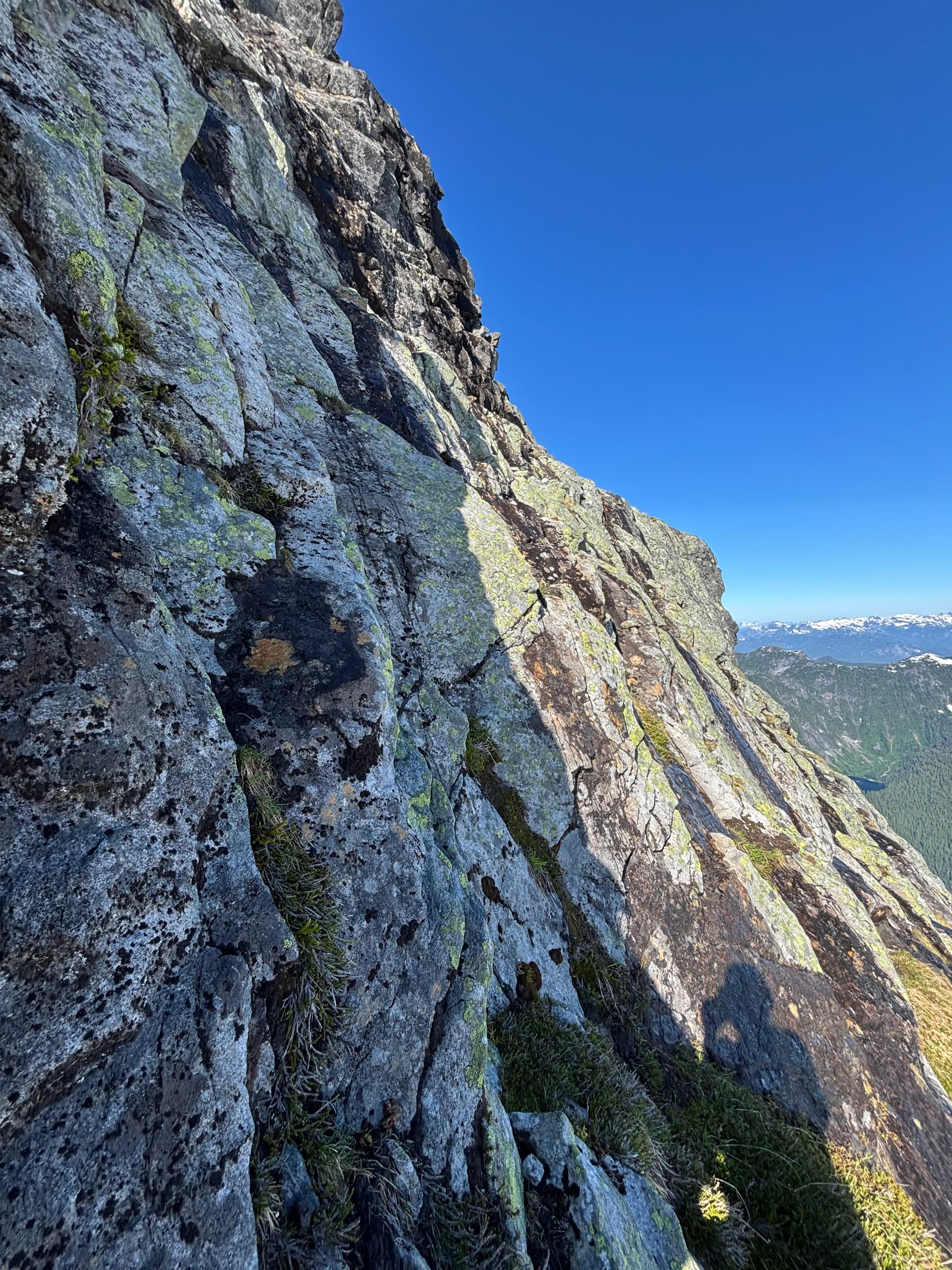 Getting to the saddle at the base Higgins was the usual thick annoying bushwhack. Once there, we began contouring climbers right (south) as the bluffs were on the left. There was some pretty thick slide alder. The good thing about alder is it meant endless handholds, so sliding down generally wasn’t a big issue. The bad thing is slide alder is super annoying and slow. After side-hilling for maybe only 30min, or maybe it was 1h, I reached a point where mentally I was just like 'f* it, I’m done with this I’m, going up’, and led the way up a pretty steep section relying predominantly on pulling myself up using mixed foliage handholds. Then across an exposed step below a cedar tree. Followed by some mostly dry granite slabs, more ‘shwhacking and pretty steep veg-belay shenanigans until at last we were above what had been the worst sustained section of the traverse by far. Thankfully from this new vantage point we saw a wide snow ramp leading up to col between Higgins true high point and a high point to the west (which was the way we’d be going). A very welcome change after what we just went through.