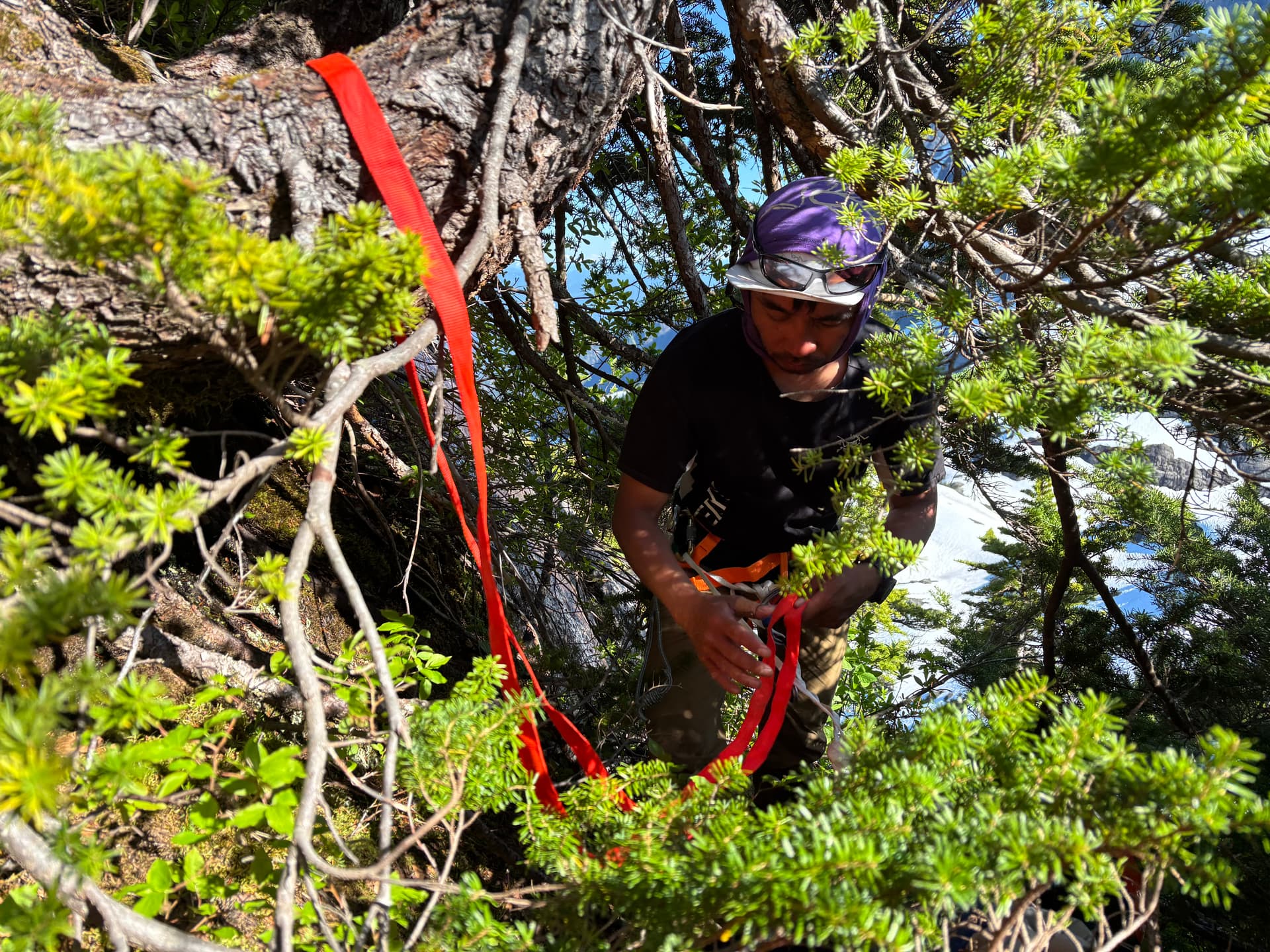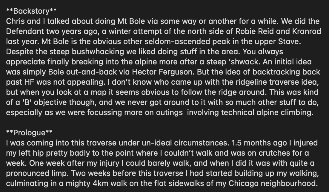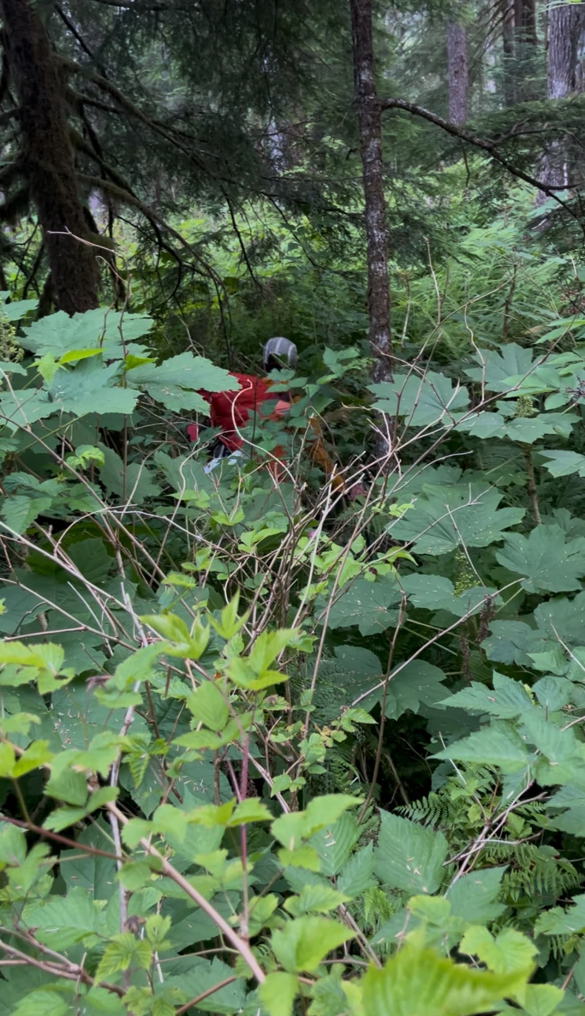 Getting to the saddle at the base Higgins was the usual thick annoying bushwhack. Once there, we began contouring climbers right (south) as the bluffs were on the left. There was some pretty thick slide alder. The good thing about alder is it meant endless handholds, so sliding down generally wasn’t a big issue. The bad thing is slide alder is super annoying and slow. After side-hilling for maybe only 30min, or maybe it was 1h, I reached a point where mentally I was just like 'f* it, I’m done with this I’m, going up’, and led the way up a pretty steep section relying predominantly on pulling myself up using mixed foliage handholds. Then across an exposed step below a cedar tree. Followed by some mostly dry granite slabs, more ‘shwhacking and pretty steep veg-belay shenanigans until at last we were above what had been the worst sustained section of the traverse by far. Thankfully from this new vantage point we saw a wide snow ramp leading up to col between Higgins true high point and a high point to the west (which was the way we’d be going). A very welcome change after what we just went through.