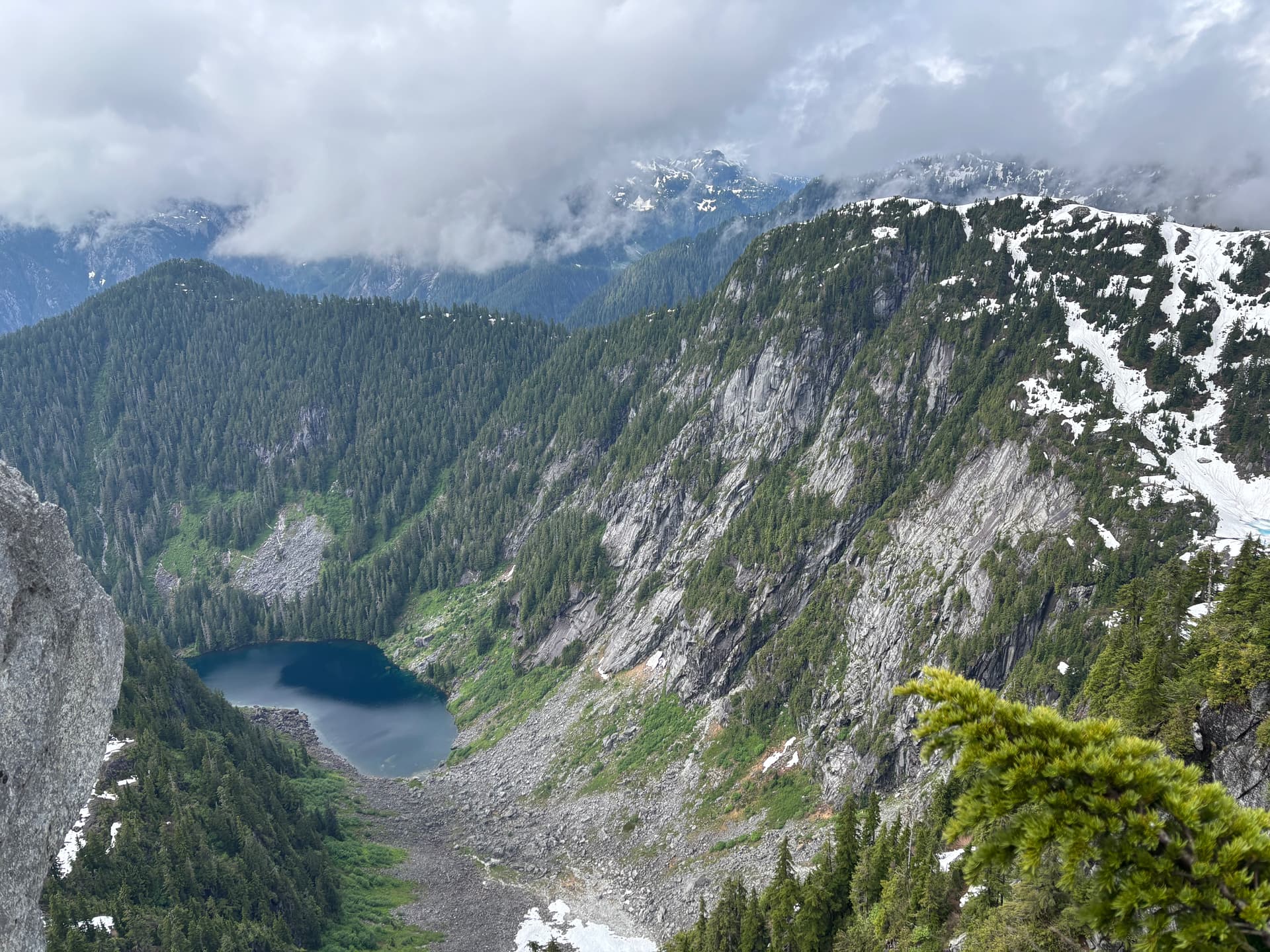 From HF lake we started both our off-trail adventure and first steep ascent. Interestingly, for ~1/3 of the ascent to HF peak we followed relatively new blue and pink flagging along the path of least resistance. I don’t recall the ascent up to HF peak being anything too crazy in terms of bushwhacking but it was a bit steep in places. When we finally broke into the snow, it was awesome! No bushwhacking! (Well this was short-lived). The summit was cool rocky sub-alpine and would have nice views but was totally socked in for us. At this point, although I was 100% soaked I was not cold, as it wasn’t cold out and we were moving well.
