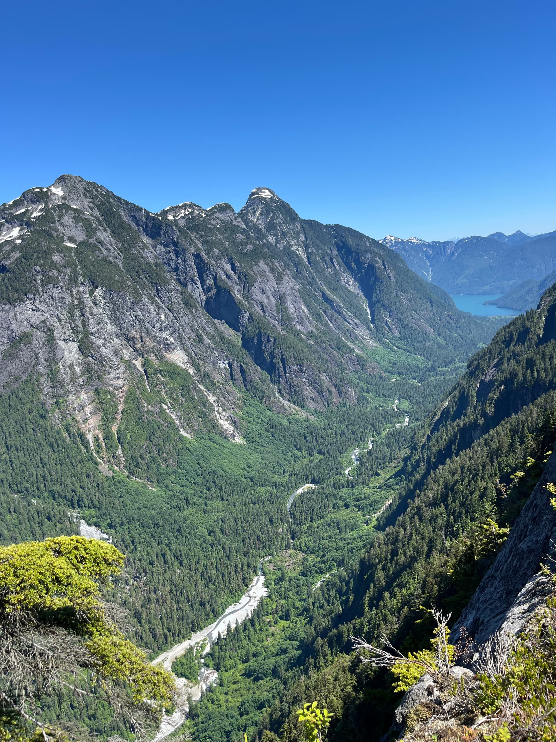 After that battle I hoped for a straightforward shot to Martyn. The first bit of ridge travel was pleasant and open, but all too soon we were descending once more, to a low col above Alouette river. Dean blazed an excellent line on the way the way down with minimal (relatively) bushwacking, and we were much faster than on previous days. Then came the last uphill of the trip. Following the spine of the ridge up offered us a relatively open line, which was nice. There were a few steeper sections requiring veg-belays. In not too long we were on open ridgeline once more. At one point Dean, who was ahead of me, called out to stay away from the right side of the ridge. A few steps forward and I could see why- it dropped abruptly several hundred meters down, and the edge was obscured by low-lying vegetation. If you were careless or tired and too close to the edge, you could easily fall down. These abrupt very steep drops are common from Hector Ferguson onwards, and are an aspect of this area which makes it neat, dangerous and at times, difficult to navigate.