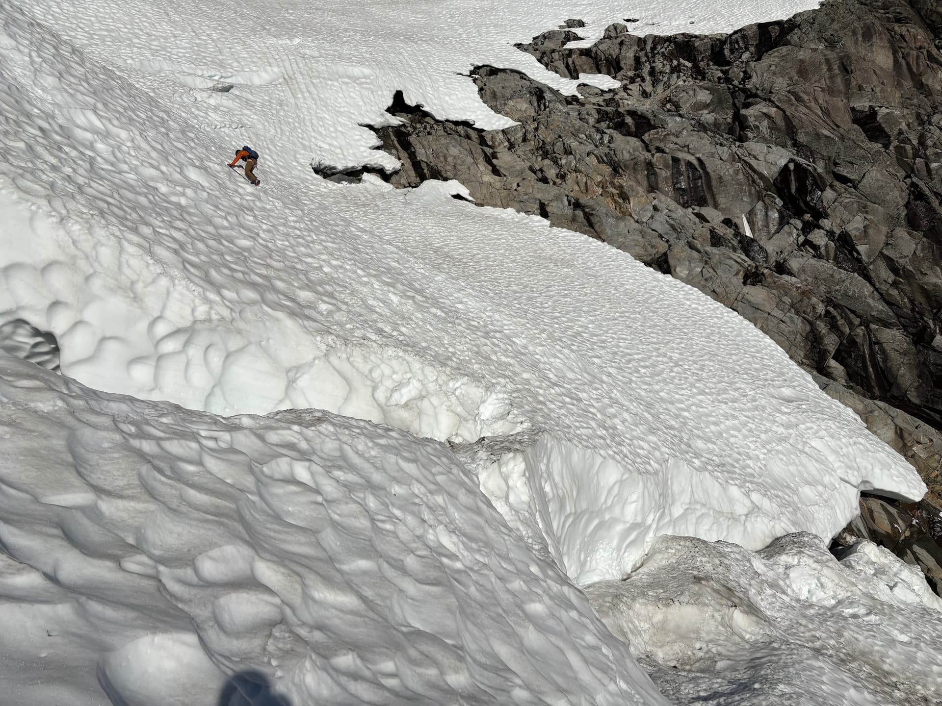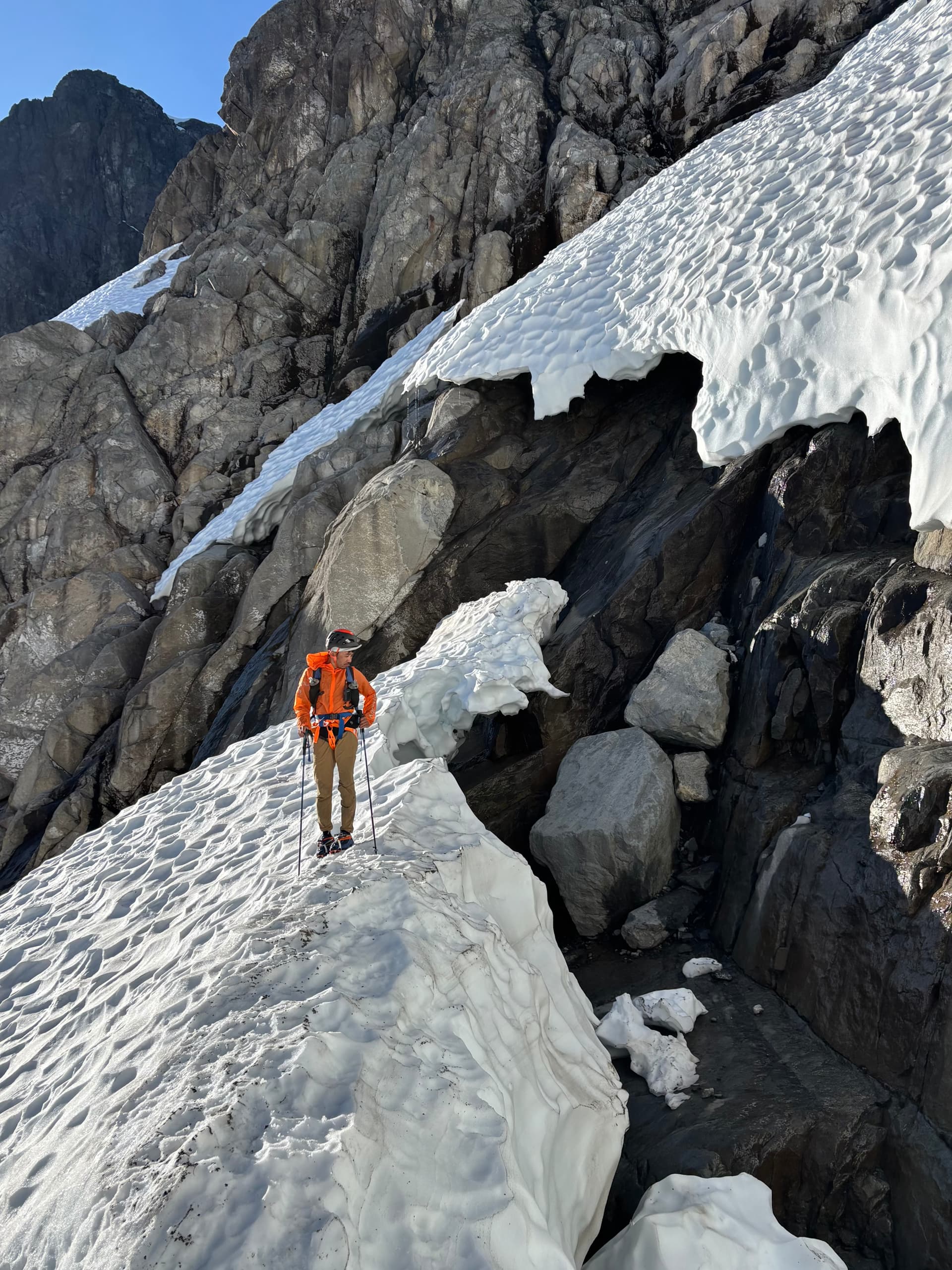 To access the rocky face of RRW0, we went up to the ‘shrund. From there we saw a deep moat surrounding the base of the peak, with one possible snow bridge to the rock near where we were, and another higher up. We opted to check out the higher bridge, as it would be faster than scrambling all the way from down here, and the scrambling looked slightly easier. After assessing the bergshrund was solid, we donned crampons, got out ice axes and started climbing the steep snow above the ‘shrund. Snow was relatively firm, as it was still early, and crampons were definitely necessary. I don’t believe the angle exceeded 45 degrees. Unfortunately, getting off the upper snow bridge to the rock would require a sketchy dismount so we retraced our route down. The lower snow bridge was ‘thick enough’ and led to a small flat platform to take off crampons.
