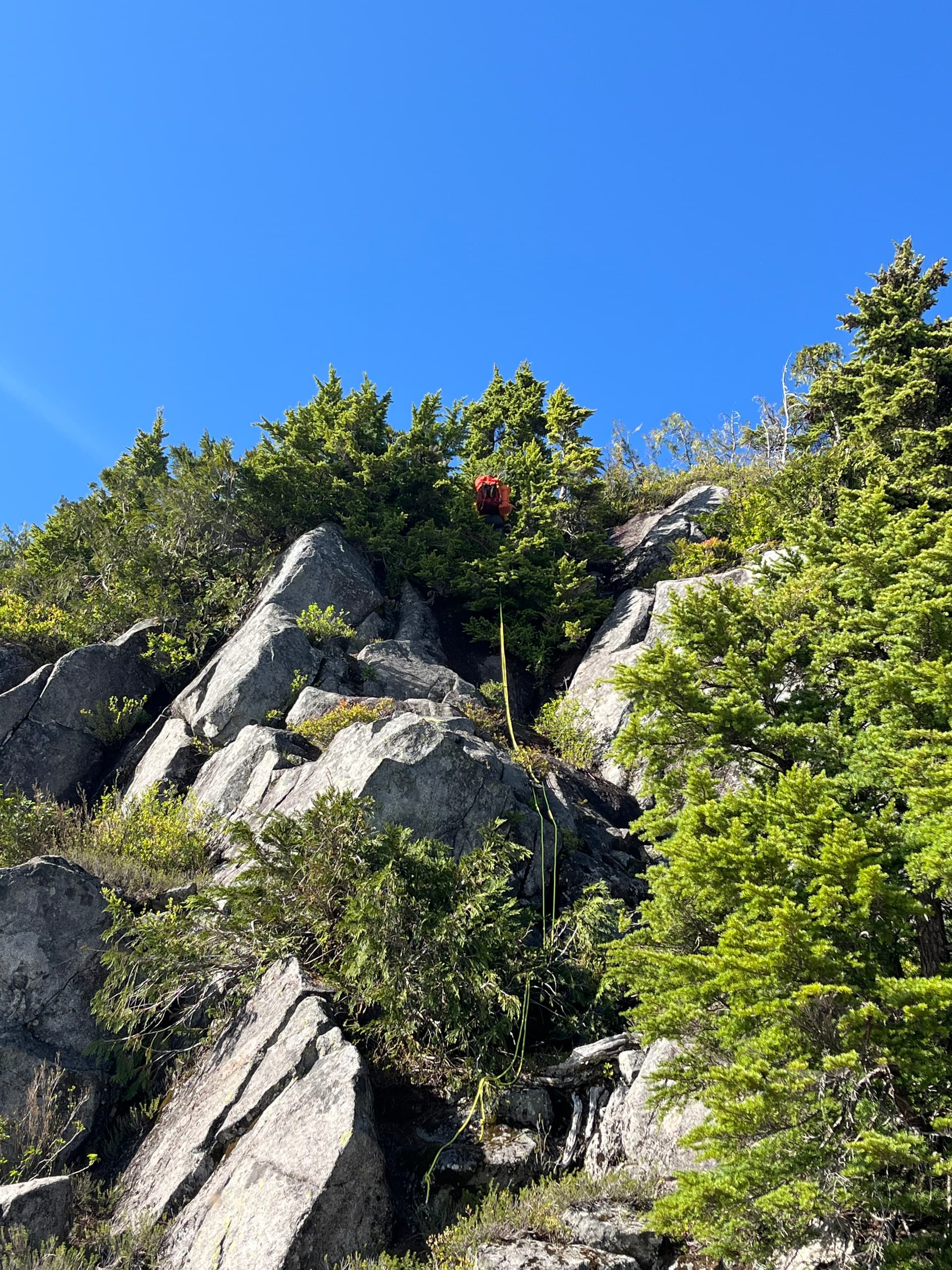 Now we just had one last ascent up to the 2nd unnamed peak. The E bowl of this peak was very mesmerizing with countless small waterfalls cascading down its snowy slopes. To regain the ridge I led up a steep gully abutting the snowfield on climbers L and rocky wall to the R. From the ridge it was straightforward to the top, where we had the best views of the N side of Robie Reid possible. After a quick jaunt to the true summit of this peak, we were off. Soon we were halted by a short bluff. Without my pack, I was able to lower myself down using cedar branches, but this deposited me on some moderate angle wet slabs that would have been tricky to navigate even without packs. We opted to rappel. While time consuming, it validated bringing the climbing gear, and rappelling is fun!