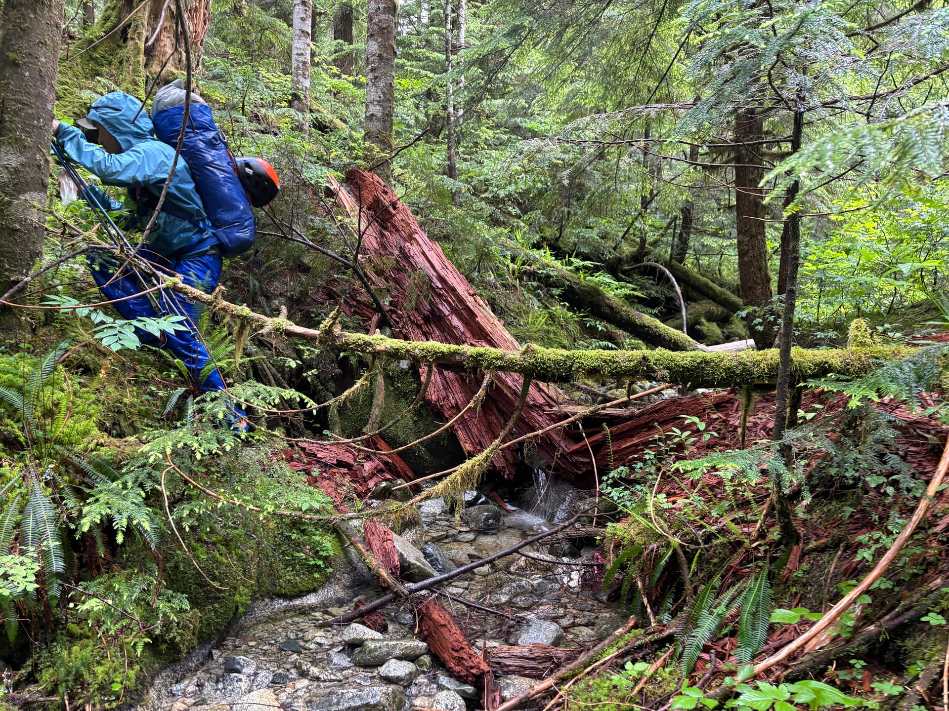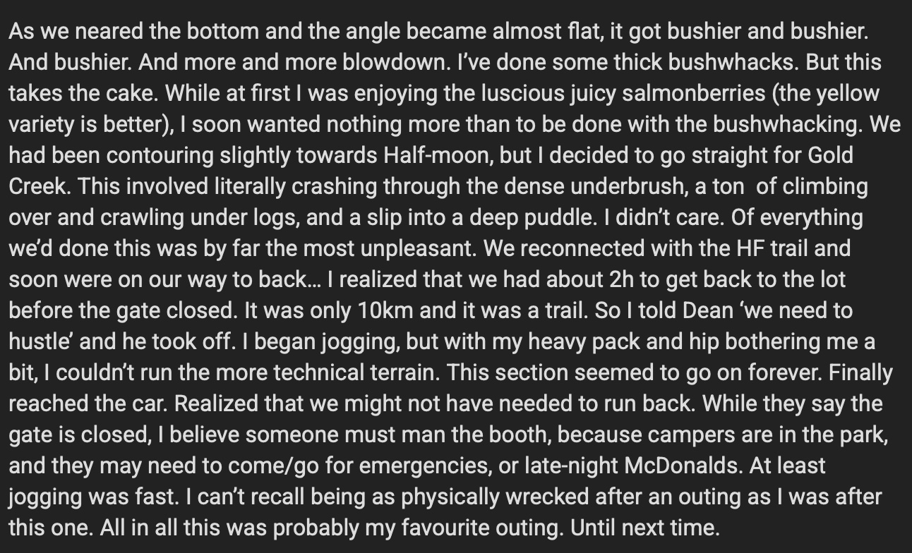 The first roughly 10km to Half-moon Beach is maintained, although the last few kilometres have some fallen logs over the trail. Shortly after Half-moon we put on rain jackets as it was going to be wet ‘shwhackin, with it having rained yesterday. I did not (but should have) put rain pants over my shorts, as I anticipated wading across Gold Creek in not long and would put them on after that.