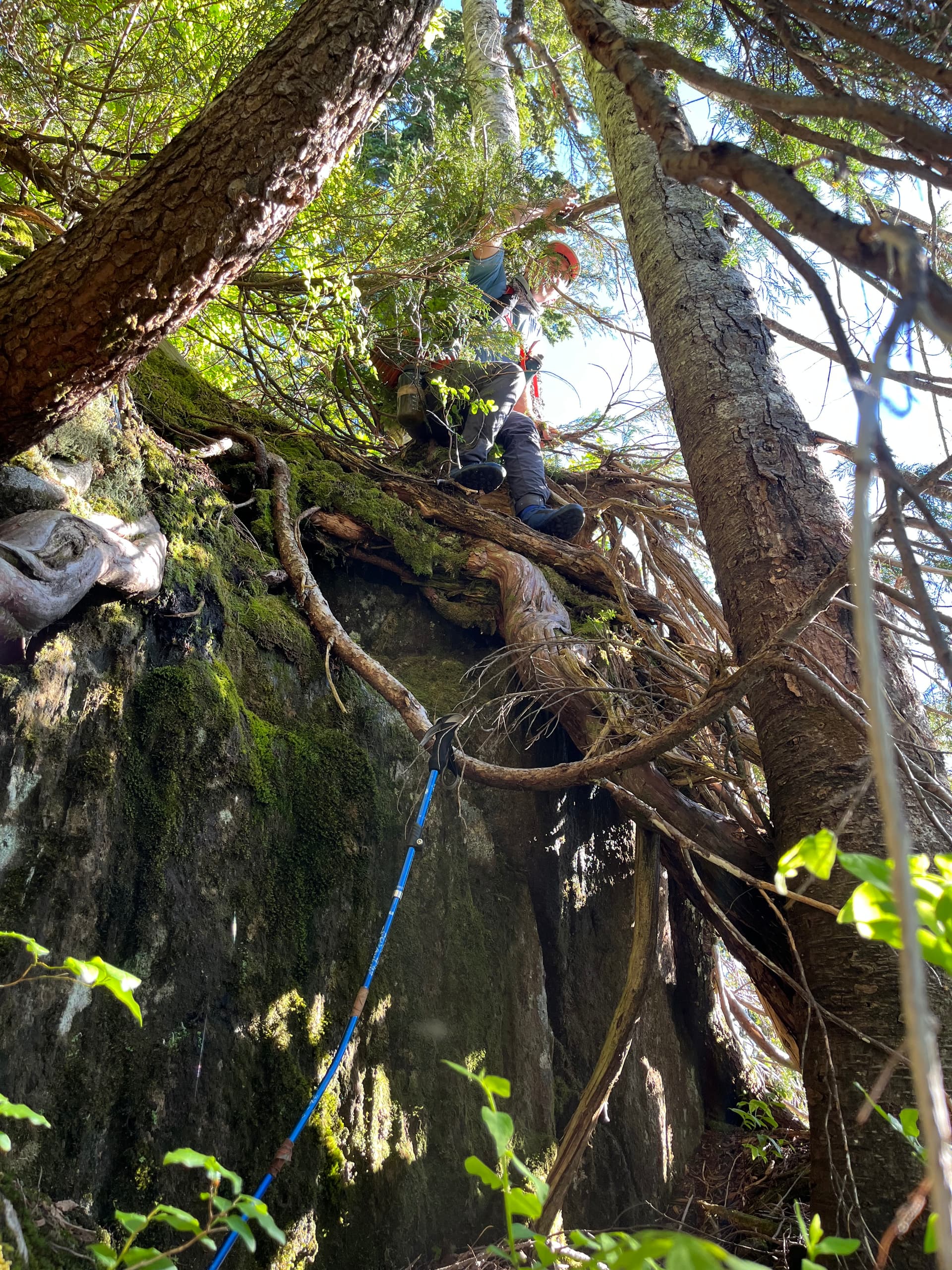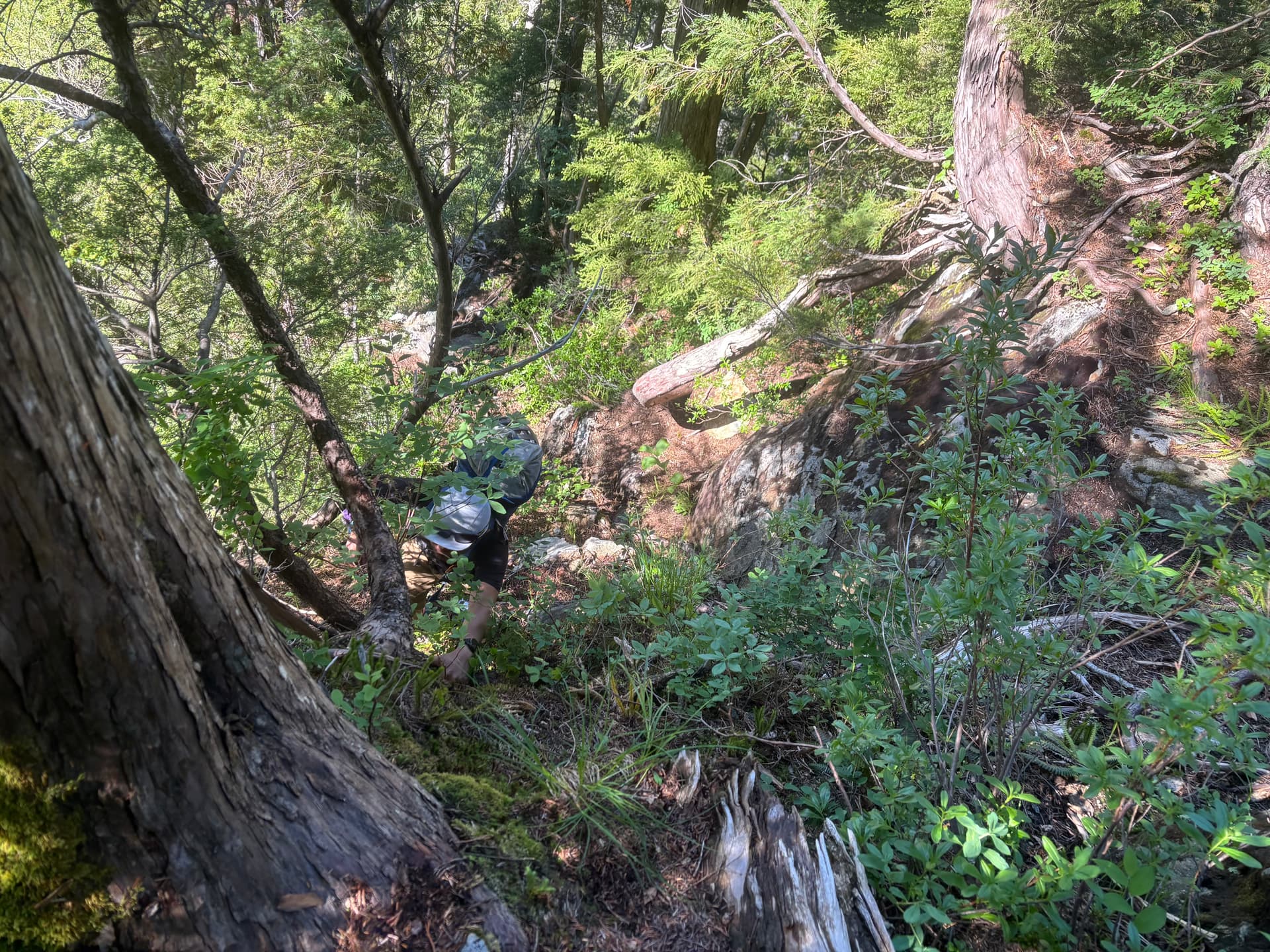 We started by descending to the next col. It was steep, but with relative ease we somehow managed to pick the line that was literally only way down to the very narrow, ~15 foot wide col in 90min. I say relative ease but it did involve some mildly exposed branch/root scrambling near the bottom. Looking back at what we descended, either sides of our descent route was flanked by cliffs with no bottom in sight.