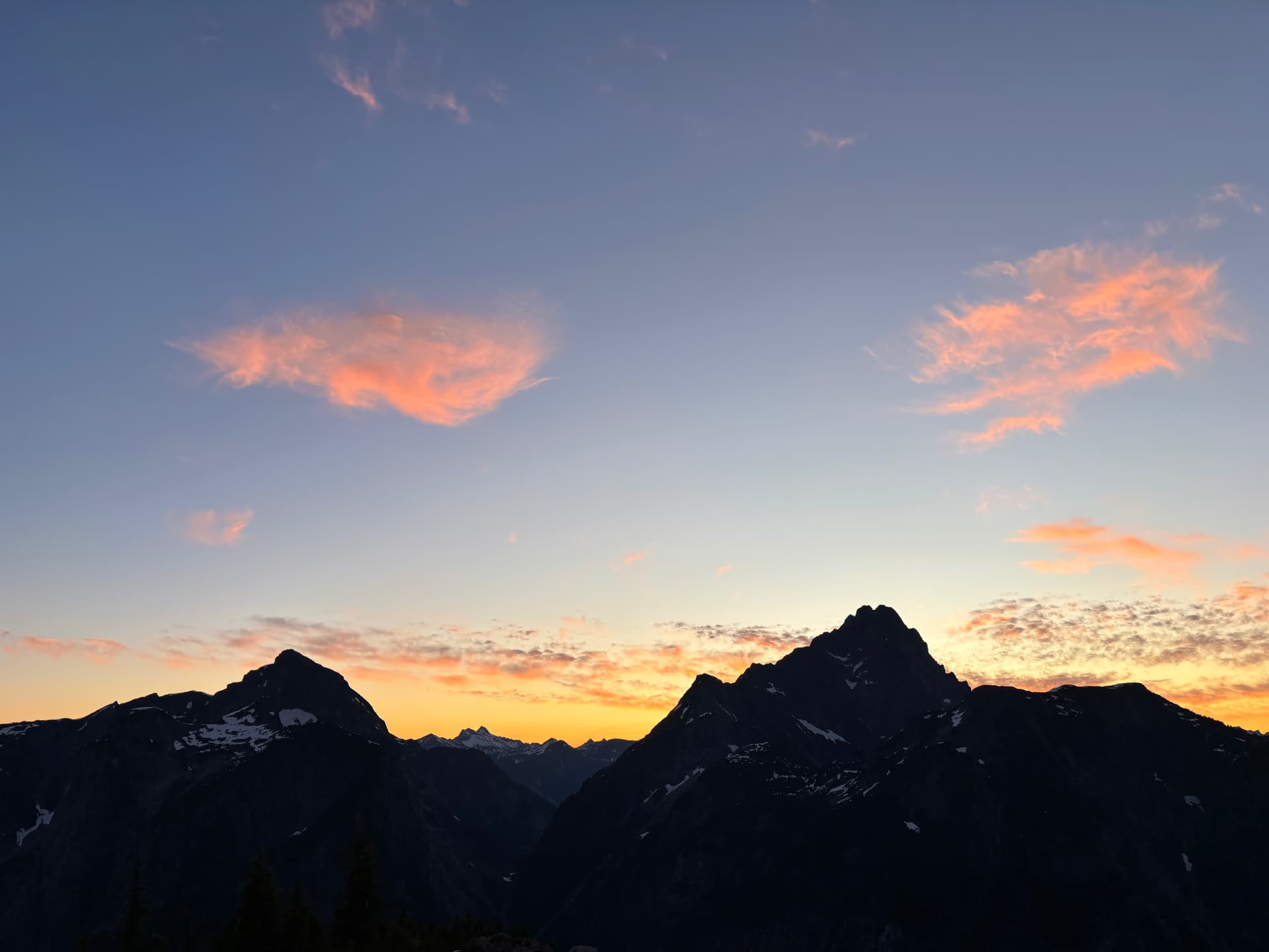 We had gone farther than I initially planned on day 1, so were off to a good start even if the bushwhacking was harder than I hoped. I wrapped my swollen shin in a tensor bandage. Right before going to bed the clouds lifted and we got sweet views of Robie Reid, the Judge, and Defendant. But these views were nothing compared to what we’d get later on!