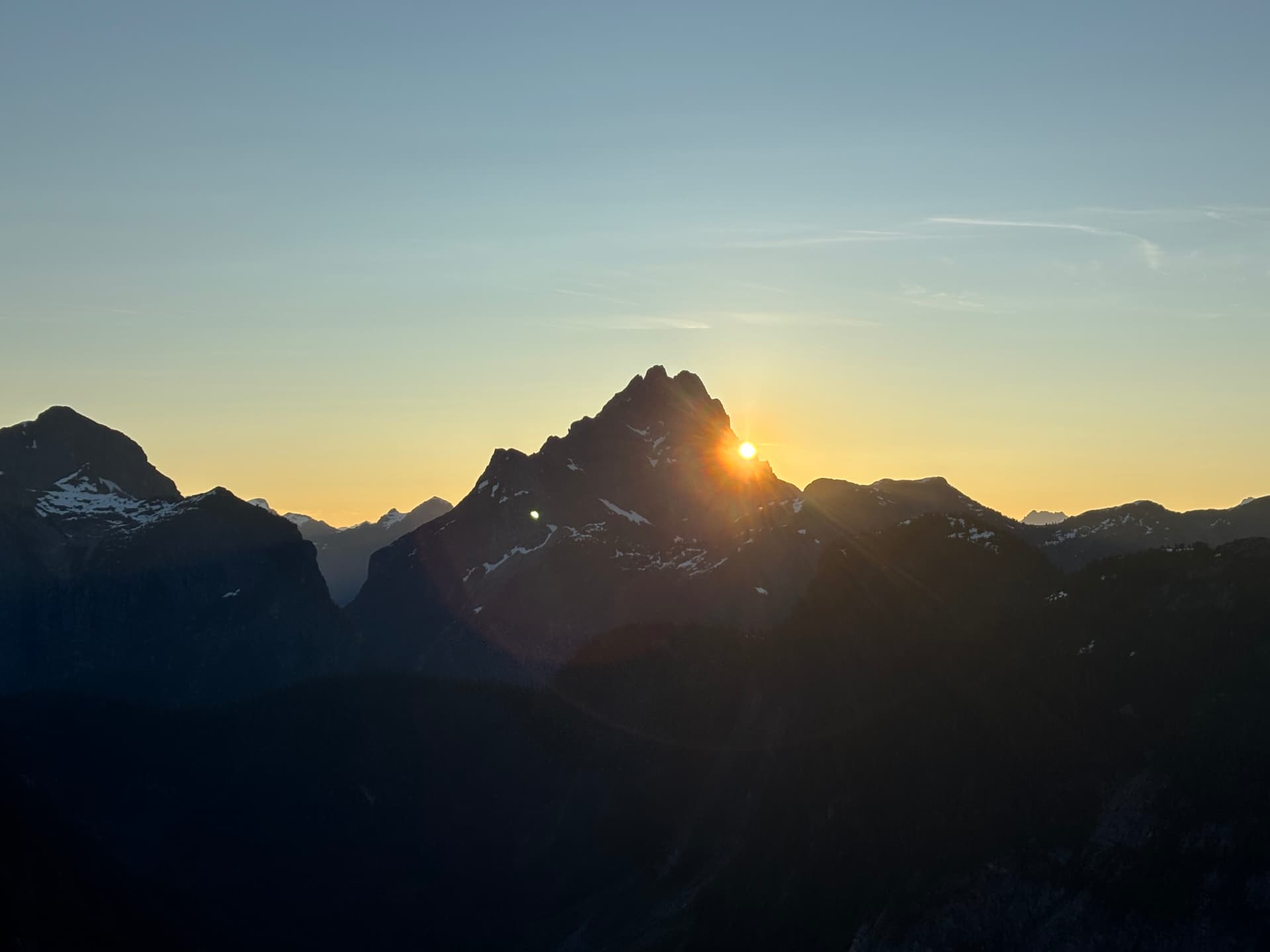 As it wasn’t that late yet, I wanted to ascend the last prominent peak of the day, conveniently located right above our camp. We both put crampons on, took out an ice axe and made our way up. It was only about 15min to the top. The summit block involved some fun class 3 scrambling on very solid rock and provided views to assess our route to regain the ridge leading to Mt Martyn.