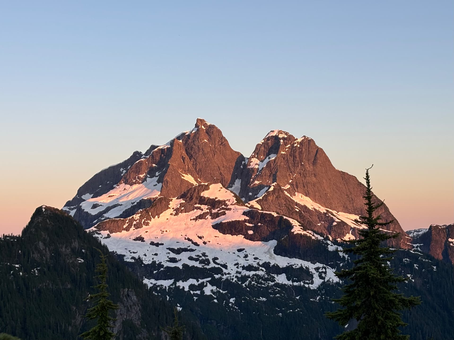 Overnight the clouds drifted in and out before finally departing for good leaving the skies completely clear, which lasted the rest of our trip. My sleep wasn’t great, as closed-cell foam pads work best on flat ground, and the uneven heather made things a bit lumpy. But I wasn’t too tired, despite waking around 4:30am. After taking in the spectacular morning alpenglow, with especially nice views of Pinecone Burke + the Fingers, we made breakfast, repacked and headed out.