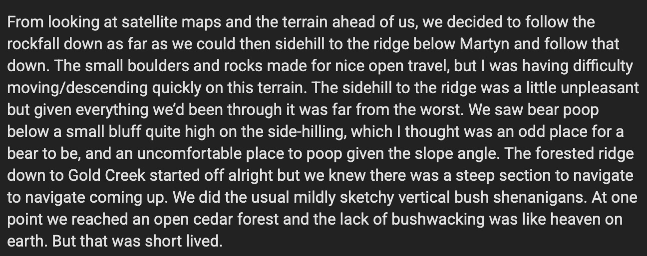 Once we made it to the snow-line we got excellent views of Mt Martyn, from this side looking formidable. Shortly before reaching Martyn, we stumbled upon the perfect camping spot. A small grassy plateau with a quaint bubbling stream and a massive boulder you could bivvy next to. Second-to-none views of Robie Reid. And plenty of small boulders scattered around for some fun bouldering. We ascended our last ‘peak’ of the trip, a barely prominent rocky outcrop immediately north of Martyn. Took in the views of where we’d been. I changed from wet boots into trail runners, and we began our final descent. (cont. in pictures since I overdid the character limit haha)