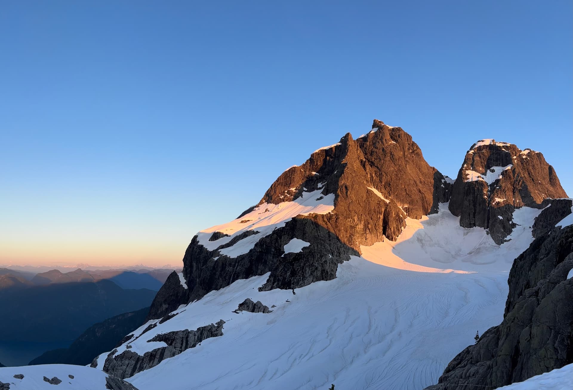 By the time we had descended onto snow above the little alpine lake on the N side of R Reid it was a little after 6pm. We considered dropping down to the lake and around to the tongue of the glacier, where we’d seen some partially frozen tarns, to camp, but decided against it as this would add unneeded elevation gain, and we also wanted a site with a full view of Robie Reid’s N face. Dean scoped out a small mostly flat rocky slab just above the glacier. It was a totally surreal camp site.