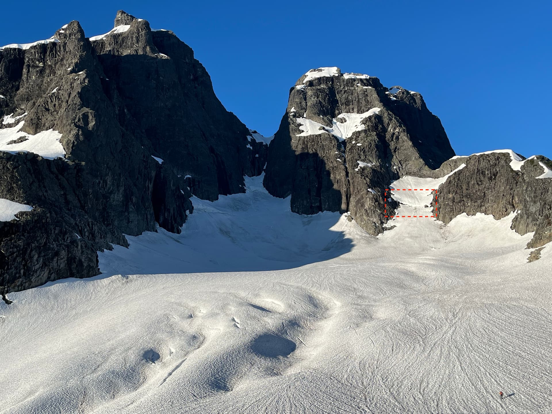 I was feeling tired boot-packing up the ramp. We’d only been moving for 11h but it felt like almost double that to me. There was a nice cool breeze in the ramp which I appreciated. Being out of the sun was also nice. Dean led the way, impressively kicking steps in just his trail runner/approach shoes. At the top of the ramp we dropped our bags and scrambled up to Higgins’ high point. This is what’s labeled as ‘Mt Higgins’ on Peakbagger.com, likely because it’s higher (and thus more prominent, >100m) than the lower point on the ‘peninsula’ that extends to the south. My initial plan included going there, but I was beat and did not feel like doing the ~2km round-trip. I mean, someone decided to call the lower spot the official peak, maybe because it was a cool location or they didn’t realize the higher point was back here. So it’s totally arbitrary. If the officially named summit was higher we would’ve gone there. The overall objective of the trip was to do the [first] circumnavigating ridge traverse. But now I also have an excuse to go back to Higgins haha!