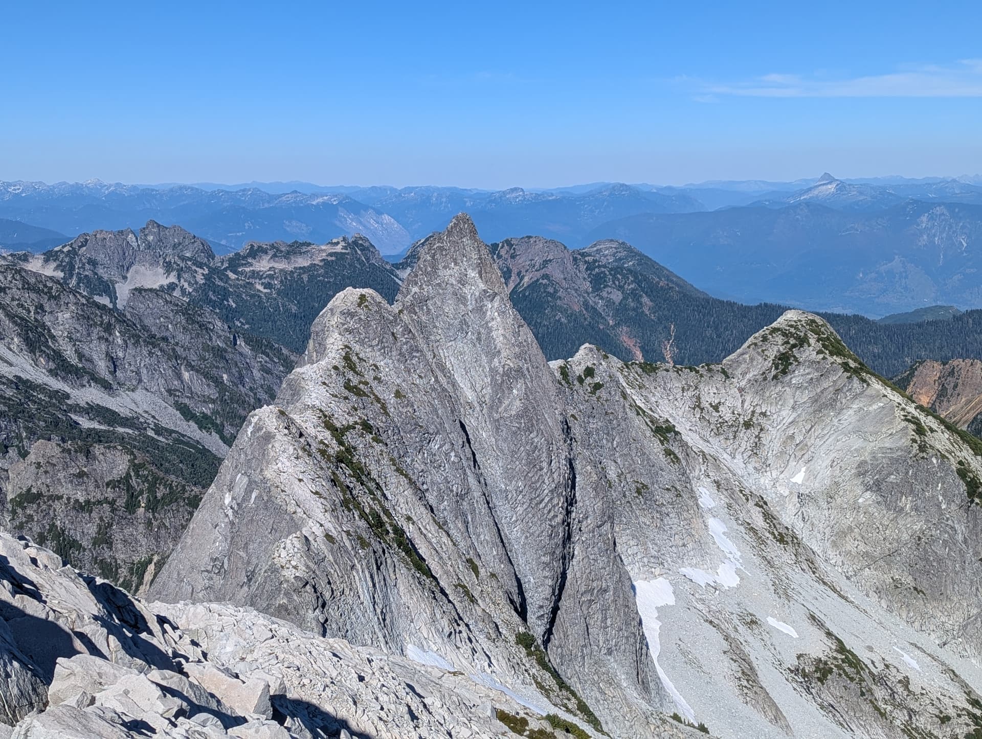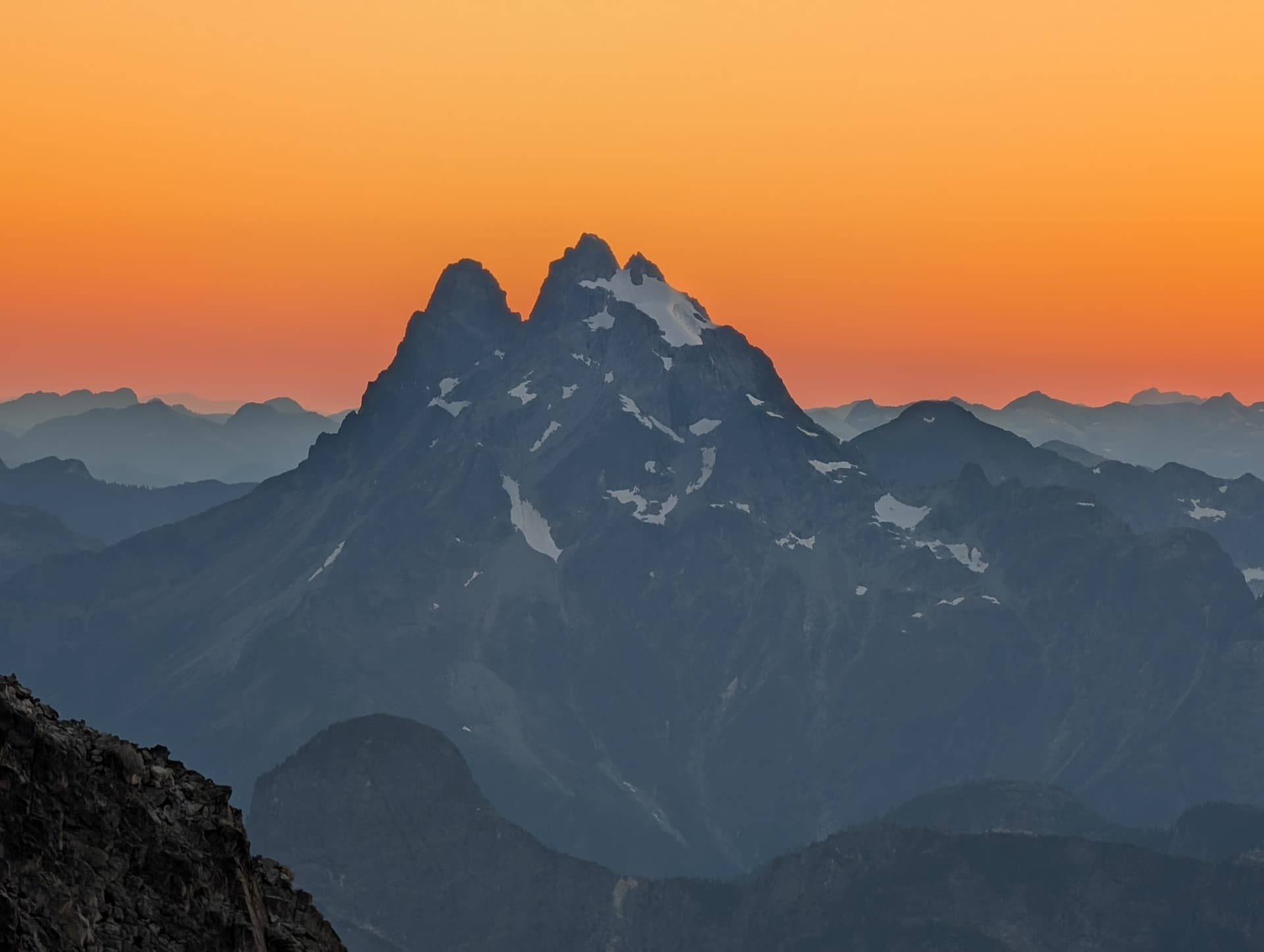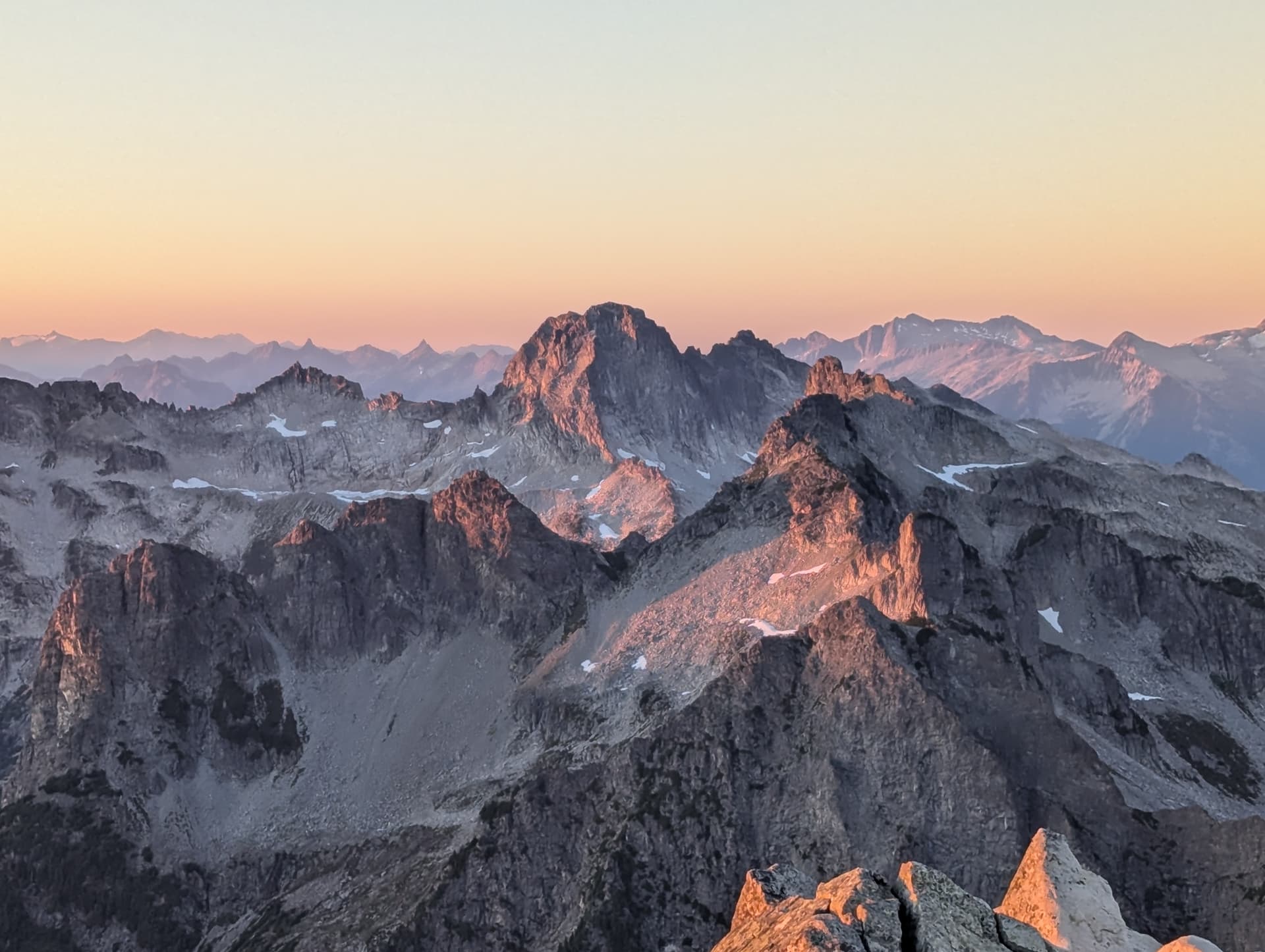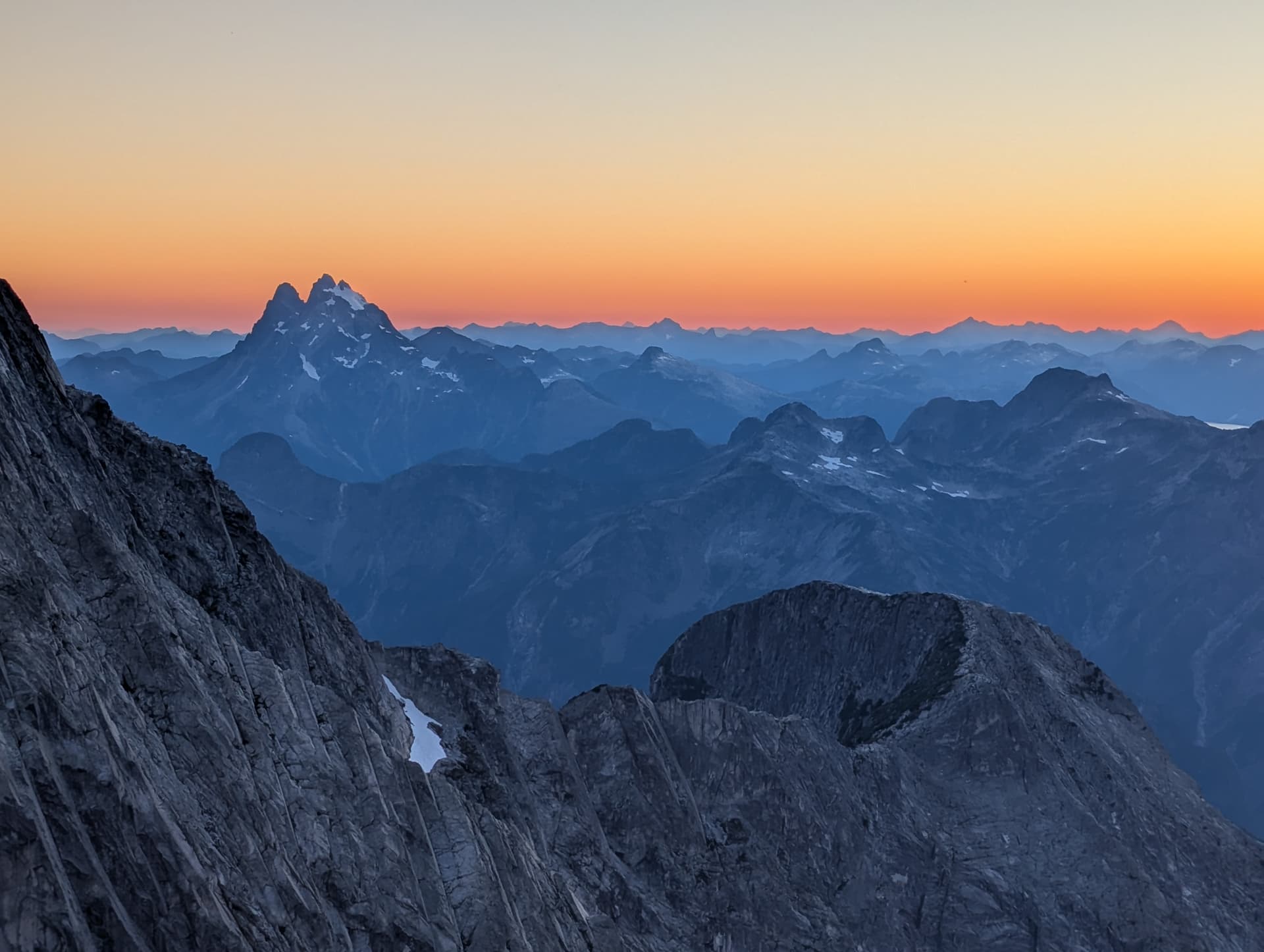 From there, we scrambled up Recourse’s east ridge easily. The so called crux is a short low angle handcrack that is probably 3rd class if you know how to jam at all. The summit views were great, and we decided this would be a scenic place to camp, so set up some bivy spots and enjoyed a lazy evening and eventually beautiful sunset up on the summit. The sky got very red, indicating what must be some smoke in the air. I woke up in the middle of the night and could see the milky way above me. Truly magical.