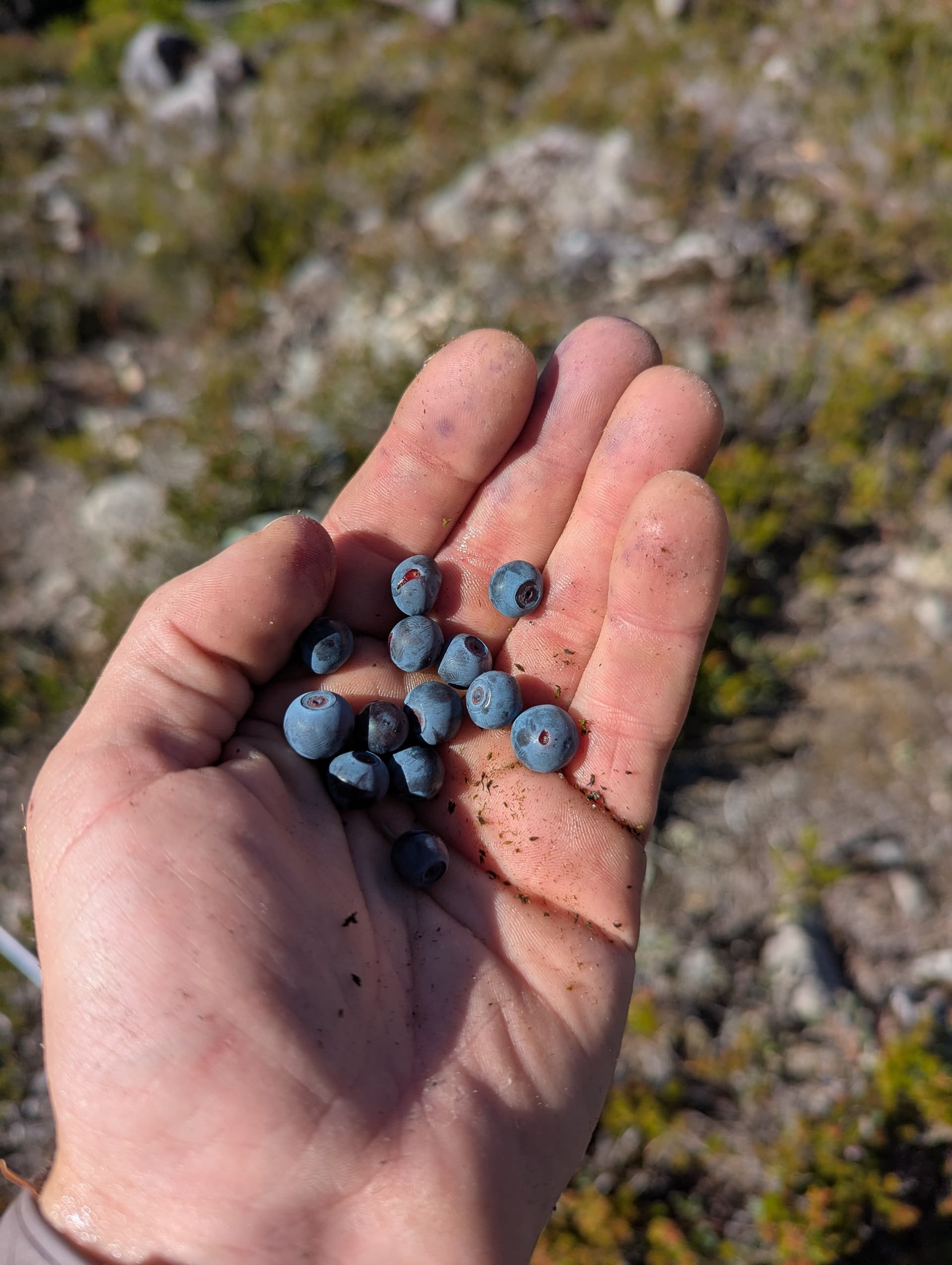 We set off down the trail, which is quite good up to the very pretty Statlu Lake. We were unsure how much water/snow would be accessible on route, so had brought about 2.5L each, as well as a stove + fuel to melt snow if need be. It was already feeling pretty warm by the time we got to the lake and started up the long talus gully to the ridge - we were doing the “full traverse” instead of the variation that gains the ridge just east of Viennese from the upper Brotherhood lake. Fortunately, this talus gully was not yet in the sun, so it was a nice cool ascent to the ridge. Once we got there, there was unexpectedly a little bit of light BW1 bushwhacking until we gained the alpine proper. Now it in the sun, it felt very very hot, and our pace slowed as we stopped frequently to feast on the many blueberries, perfectly ripe and sweet.
