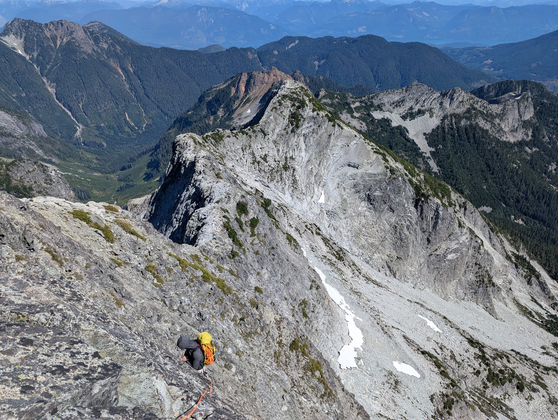 From there, we did two easy pitches up Clarke before putting the rope away and enjoying some fun scrambling on great rock up to the summit. Views were fantastic, but it was feeling insanely hot, even hotter than yesterday. We quickly started descending the SE Spur until about 2030m, at which point one can drop skiers left / south down some easy ramps onto a large bench, from which an established rap station will deposit you in the upper cirque via a ~20m rappel. We donated some new tat + a ring to this station.